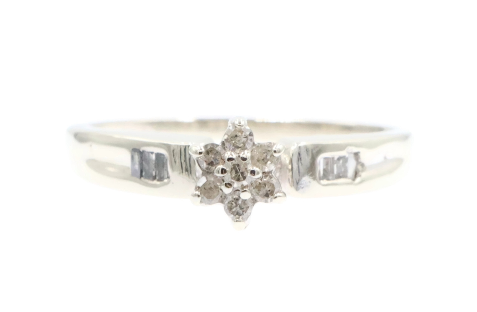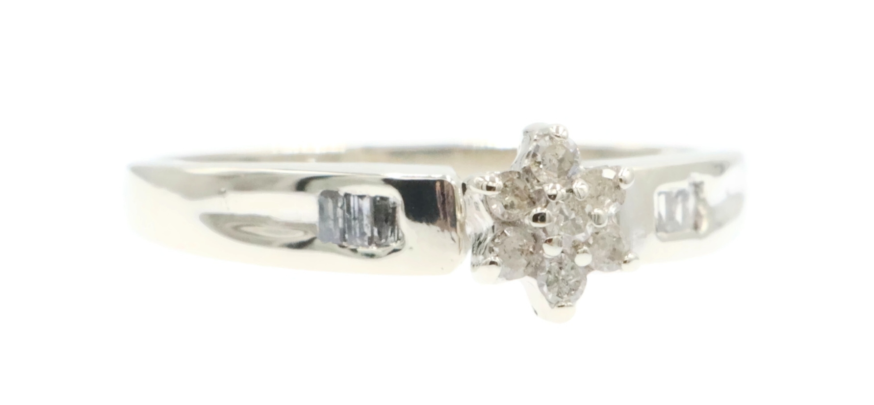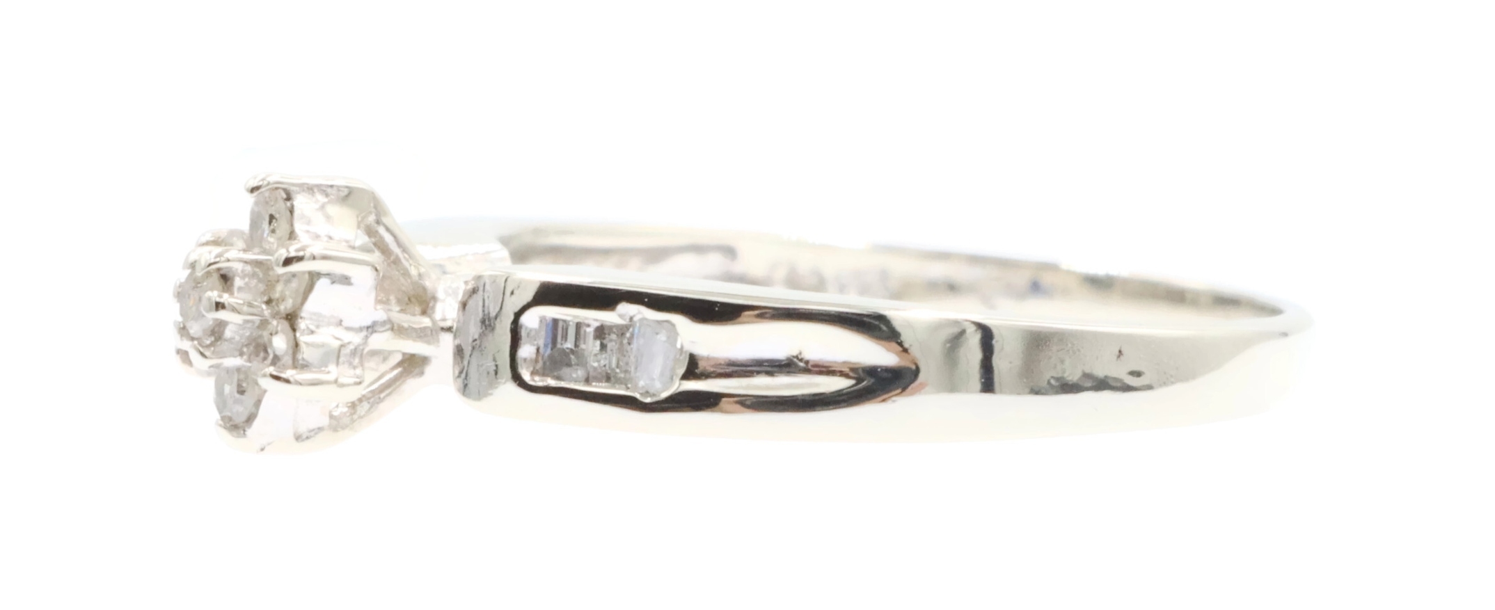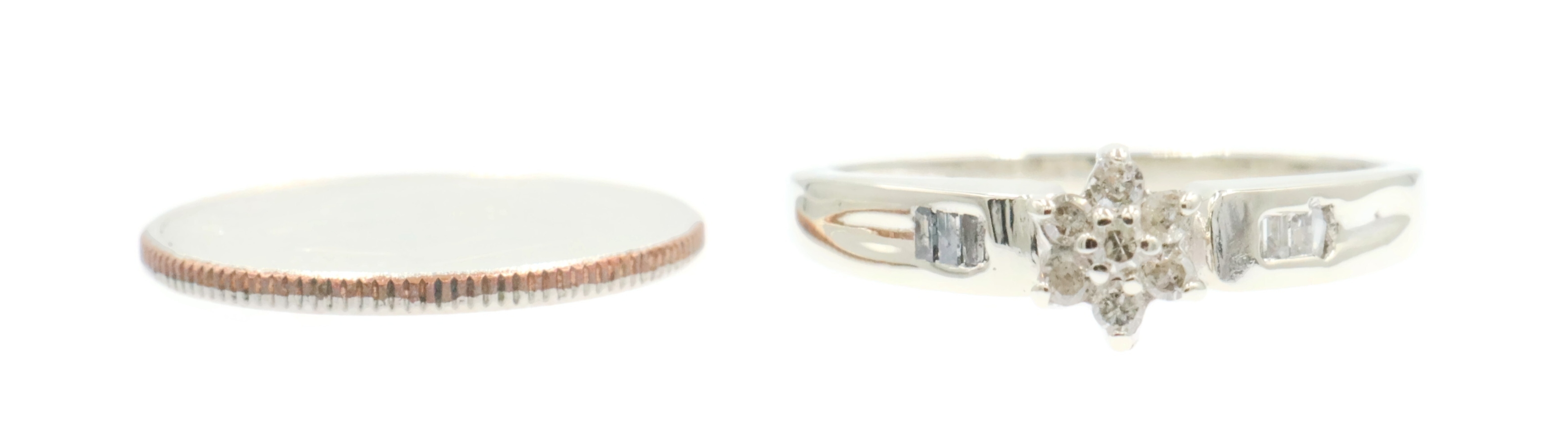 0.15 Ctw Round & Baguette Diamond 10KT White Gold Flower Cluster Engagement Ring. This ring is a size 7.