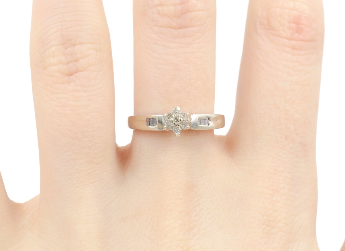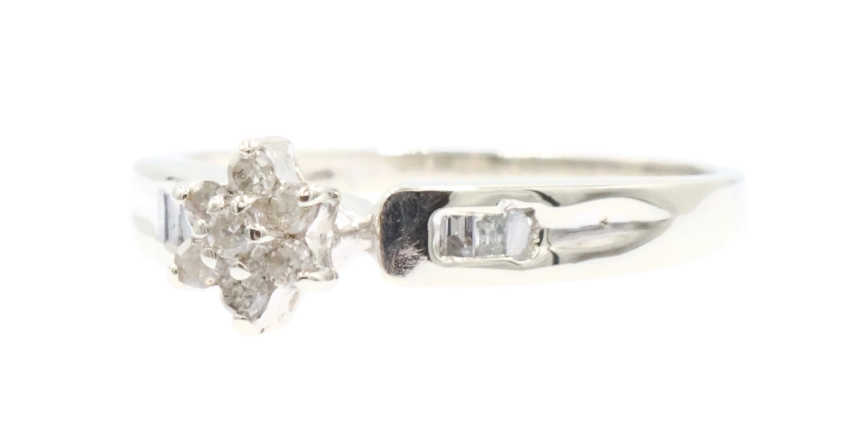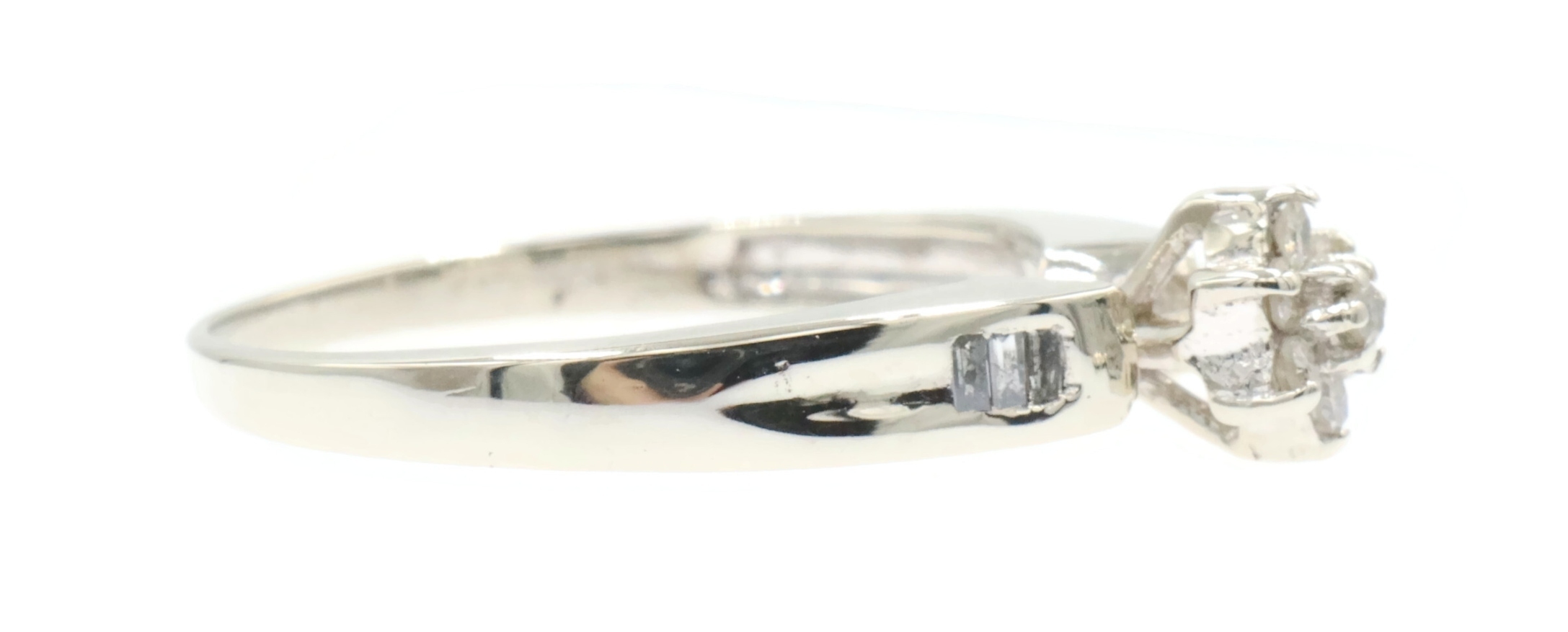 0.15 Ctw Round & Baguette Diamond 10KT White Gold Flower Cluster Engagement Ring. This ring is a size 7.