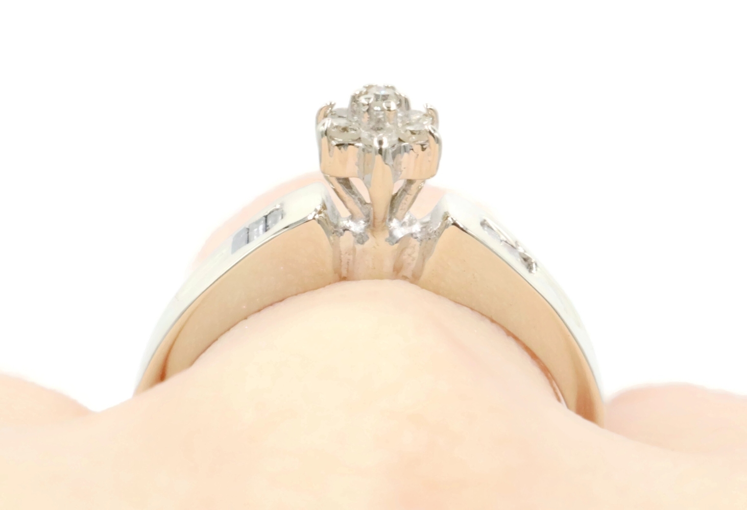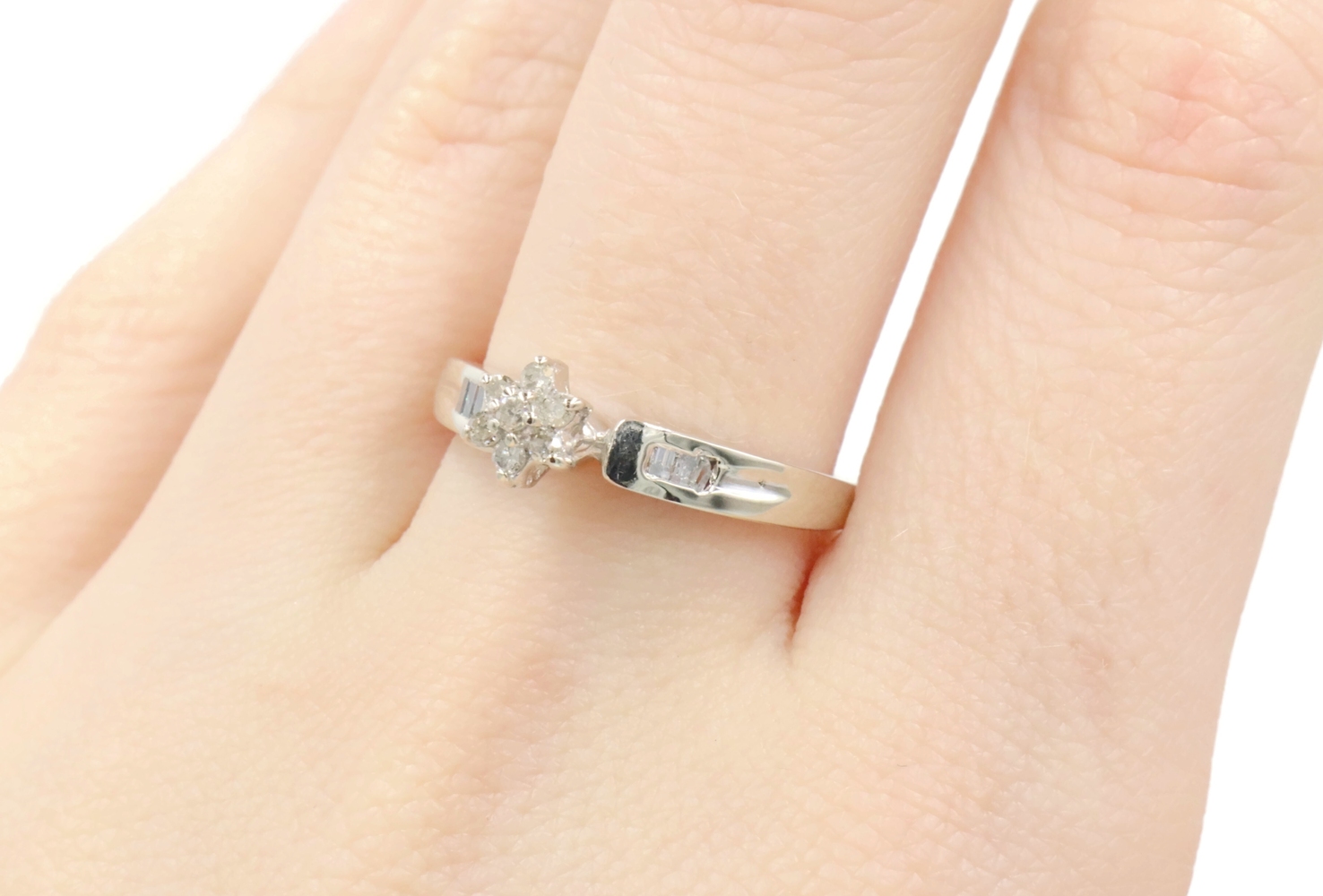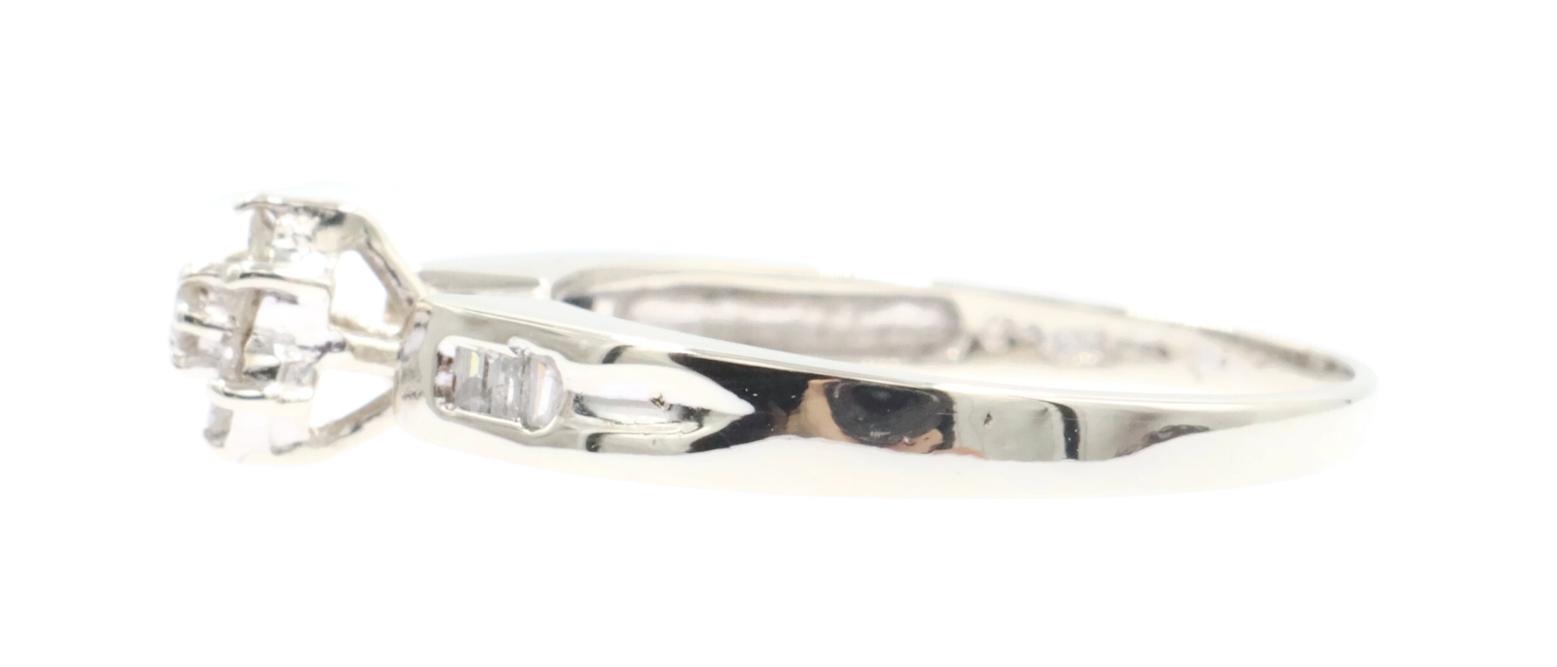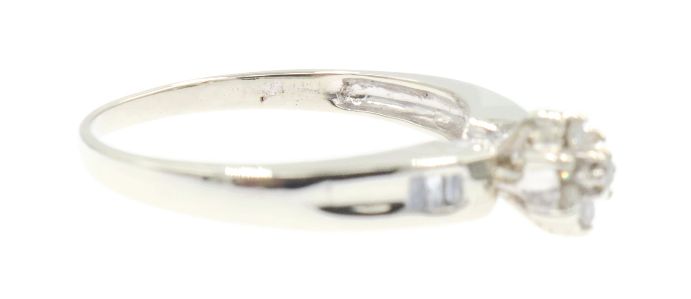 0.15 Ctw Round & Baguette Diamond 10KT White Gold Flower Cluster Engagement Ring. This ring is a size 7.