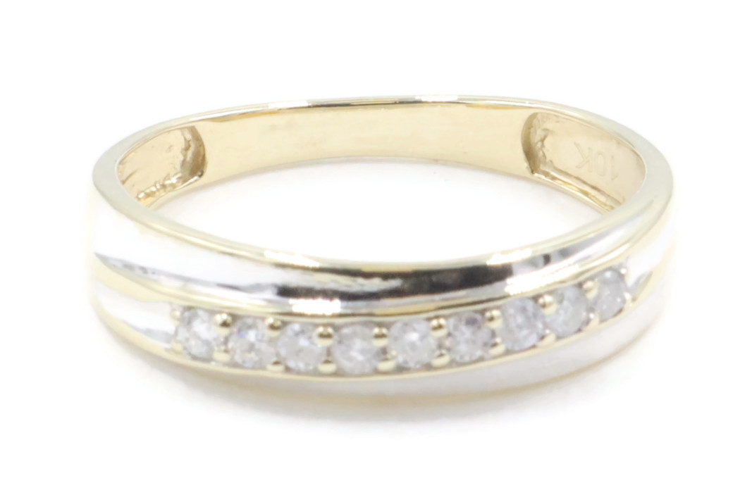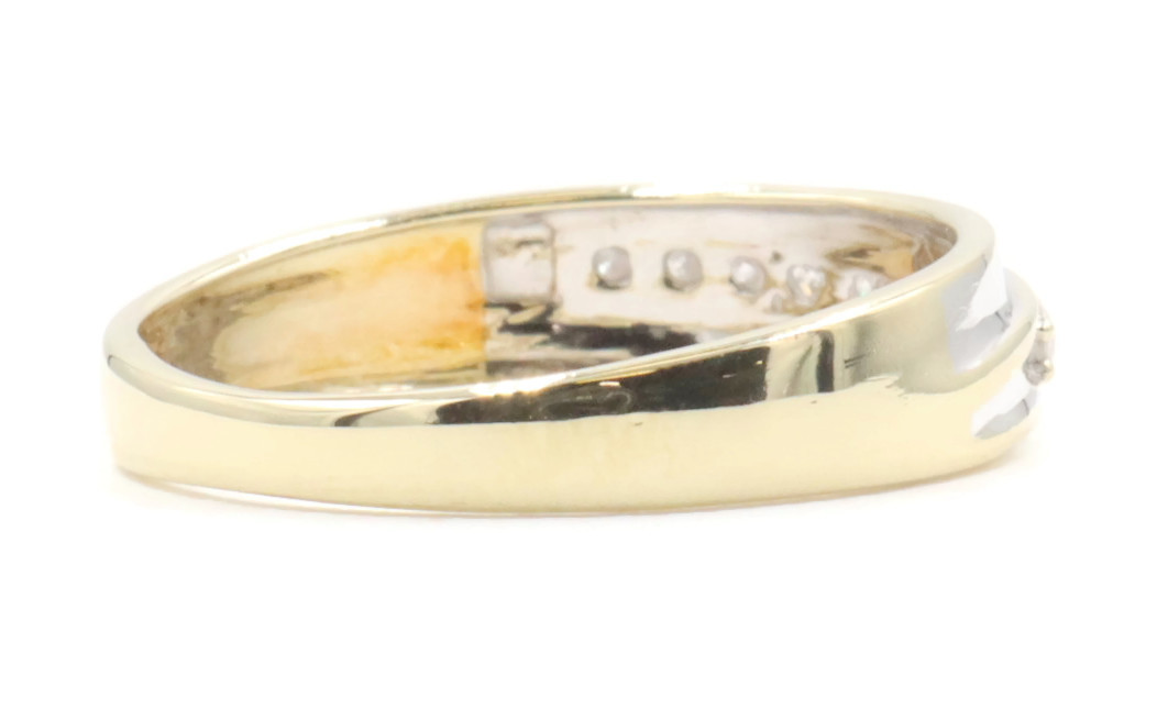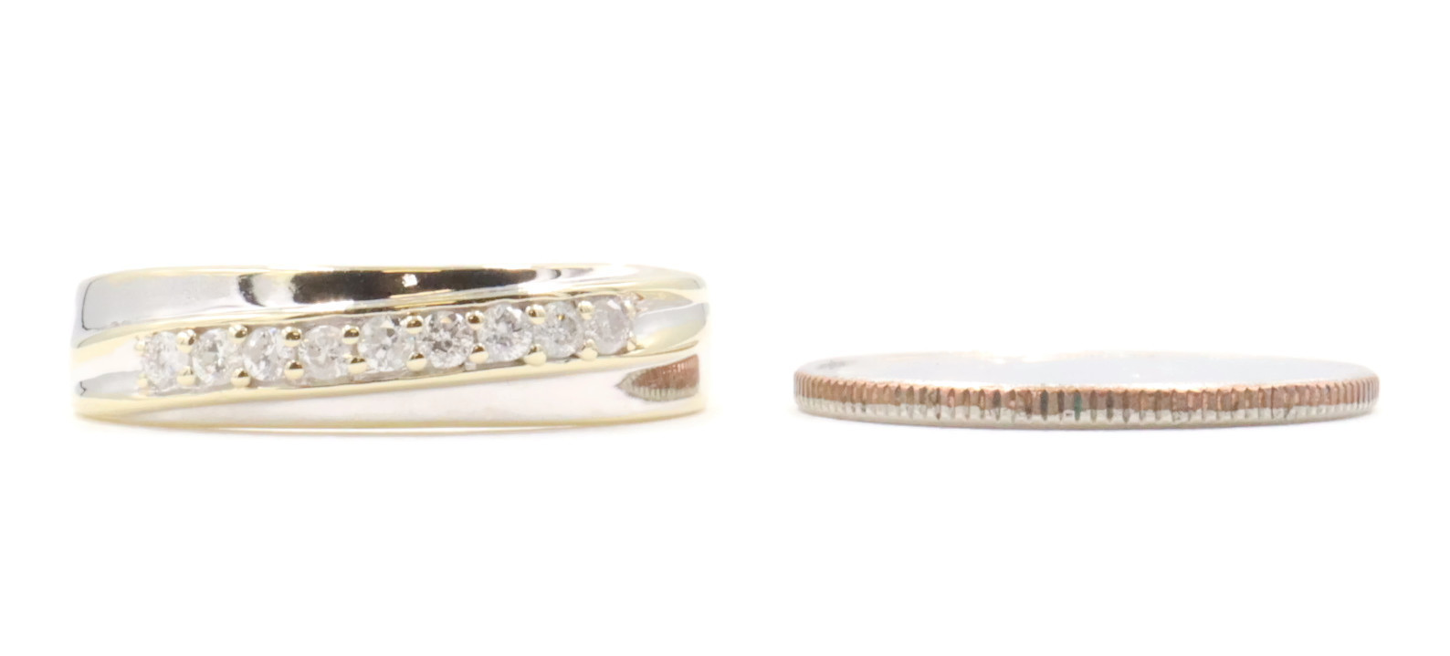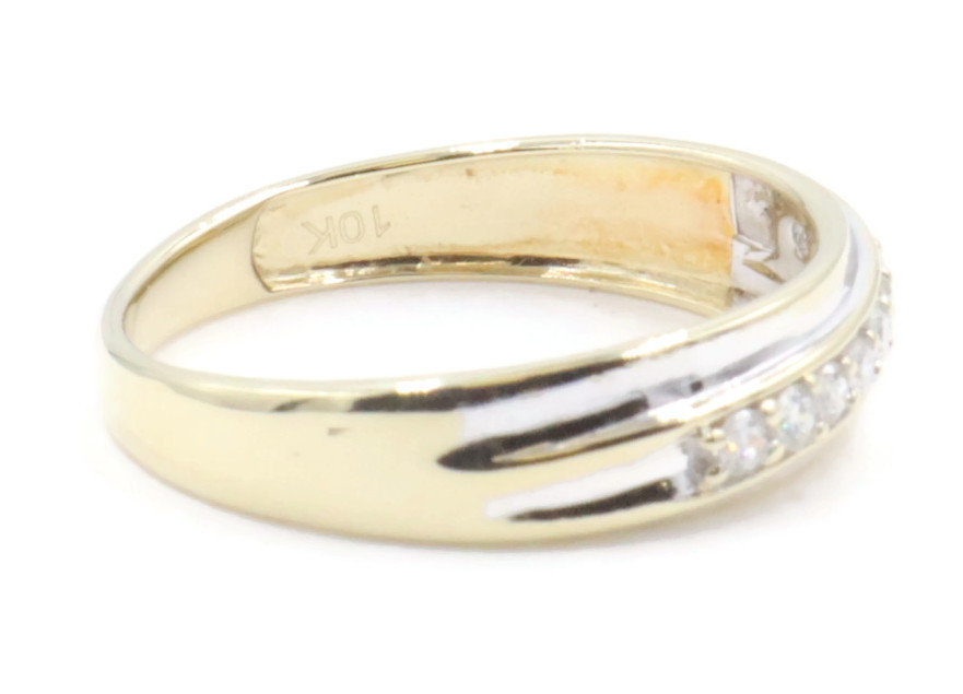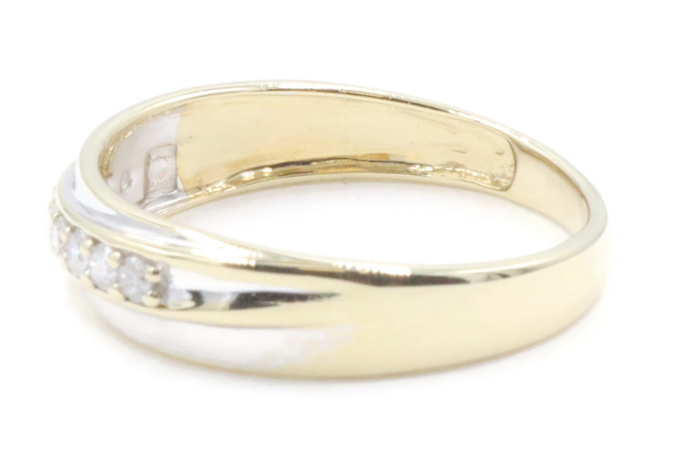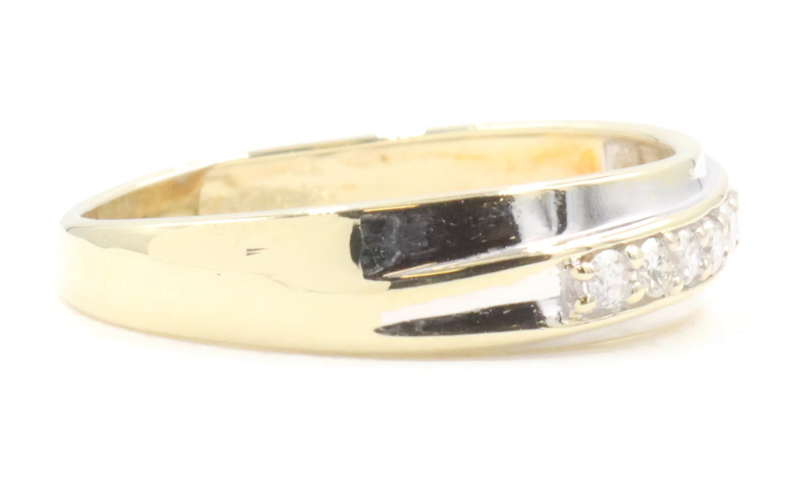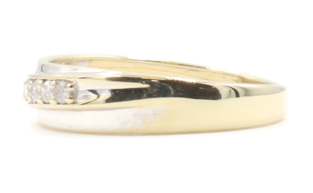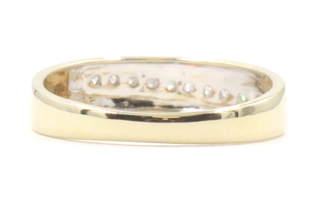 0.18 ctw Round Diamond Diagonal 10KT Yellow & White Gold 4.8mm Wedding Band Ring. This ring is a size 6 3/4.
