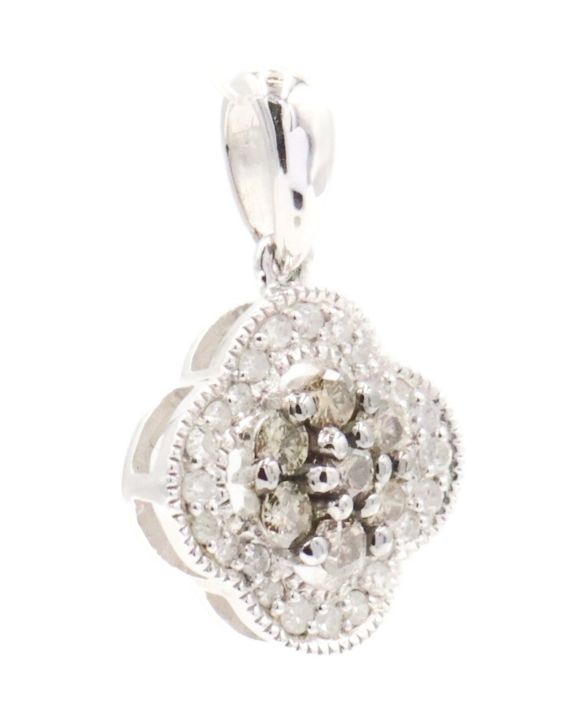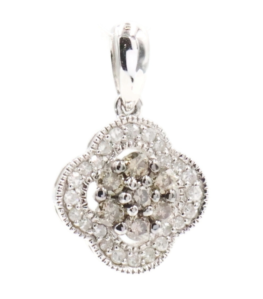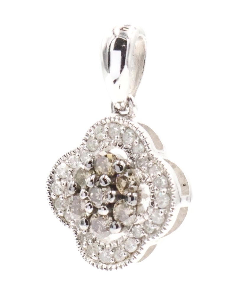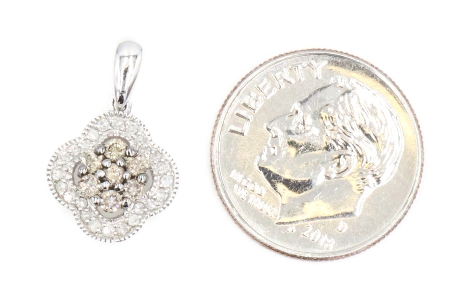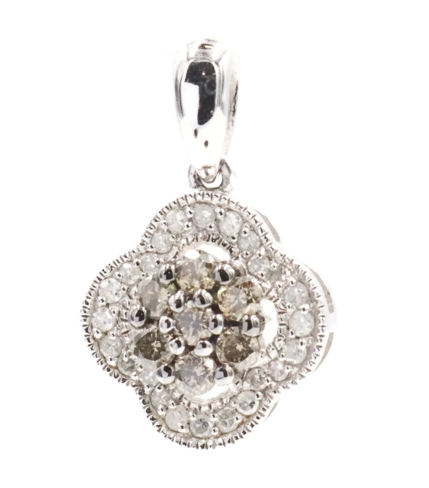 0.38 Ctw Champagne & White Diamond 10KT Gold 17.7mm Quatrefoil Cluster Pendant. This pendant is approximately 17.7mm in length (including the bail) and 10.9mm in width.