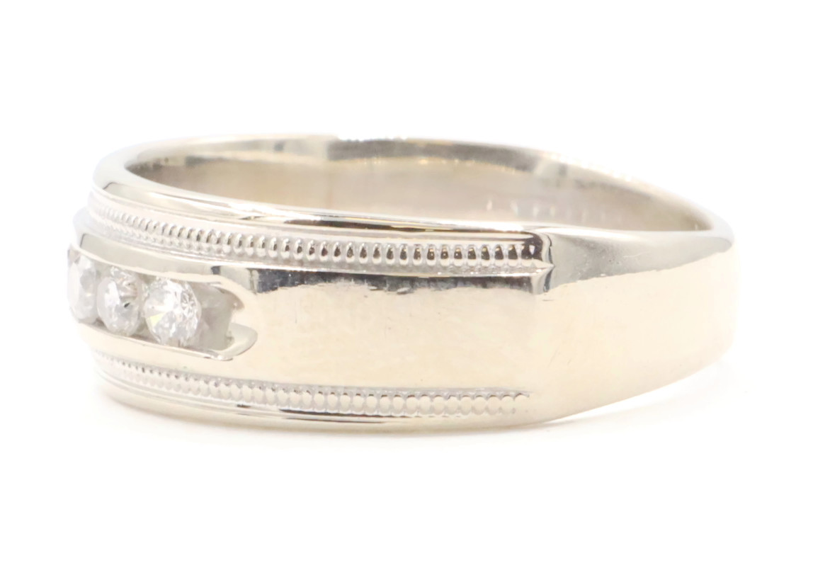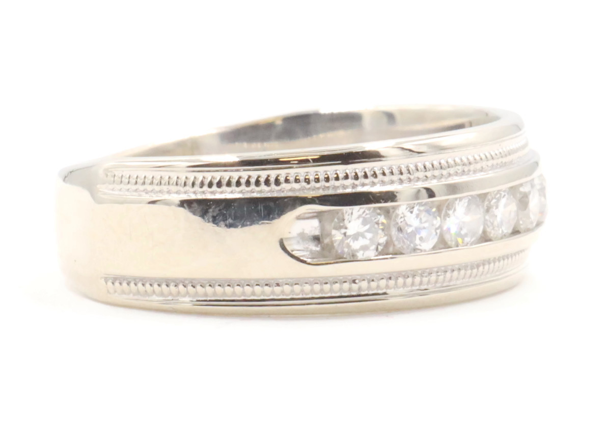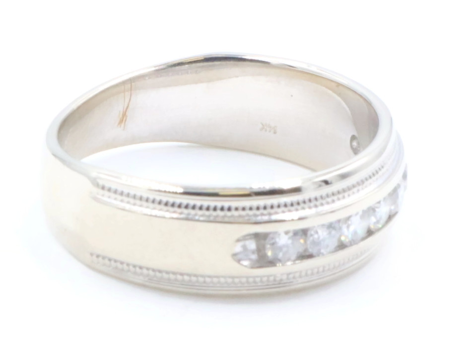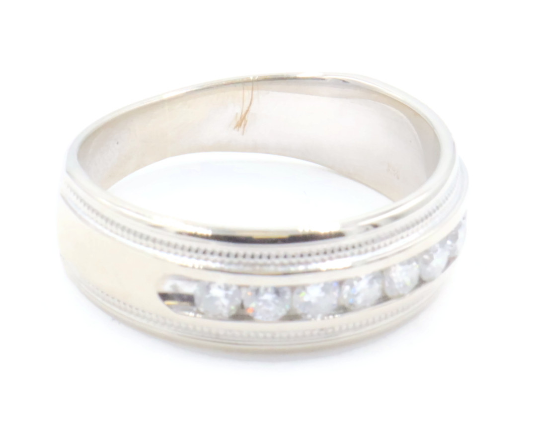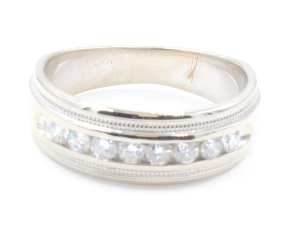0.55 ctw Round Diamond 14KT White Gold 7.5mm Channel Band Milgrain Wedding Band. This ring is a size 9.