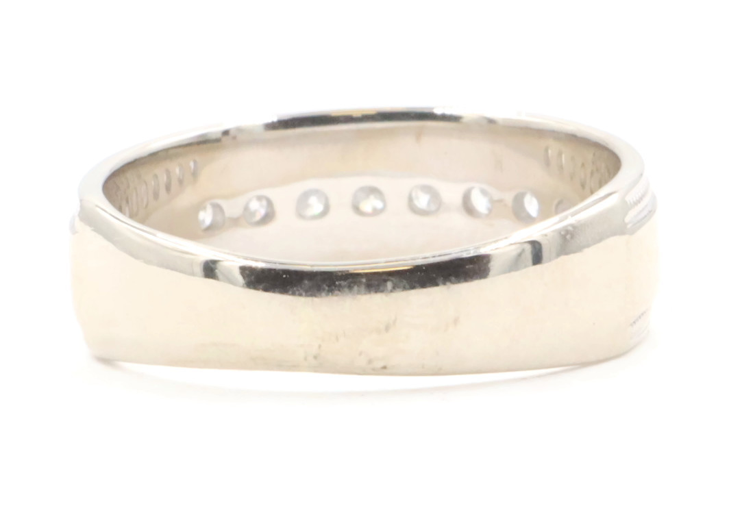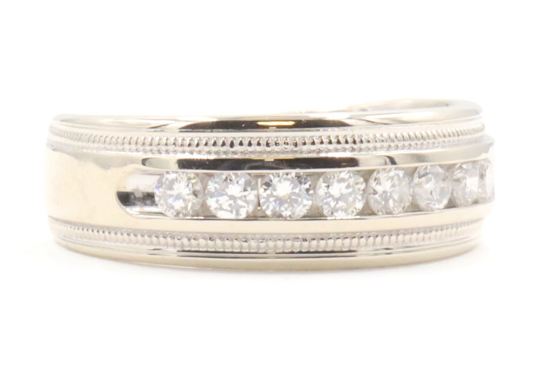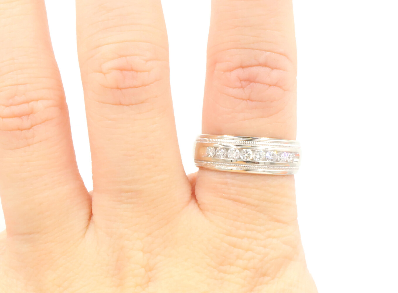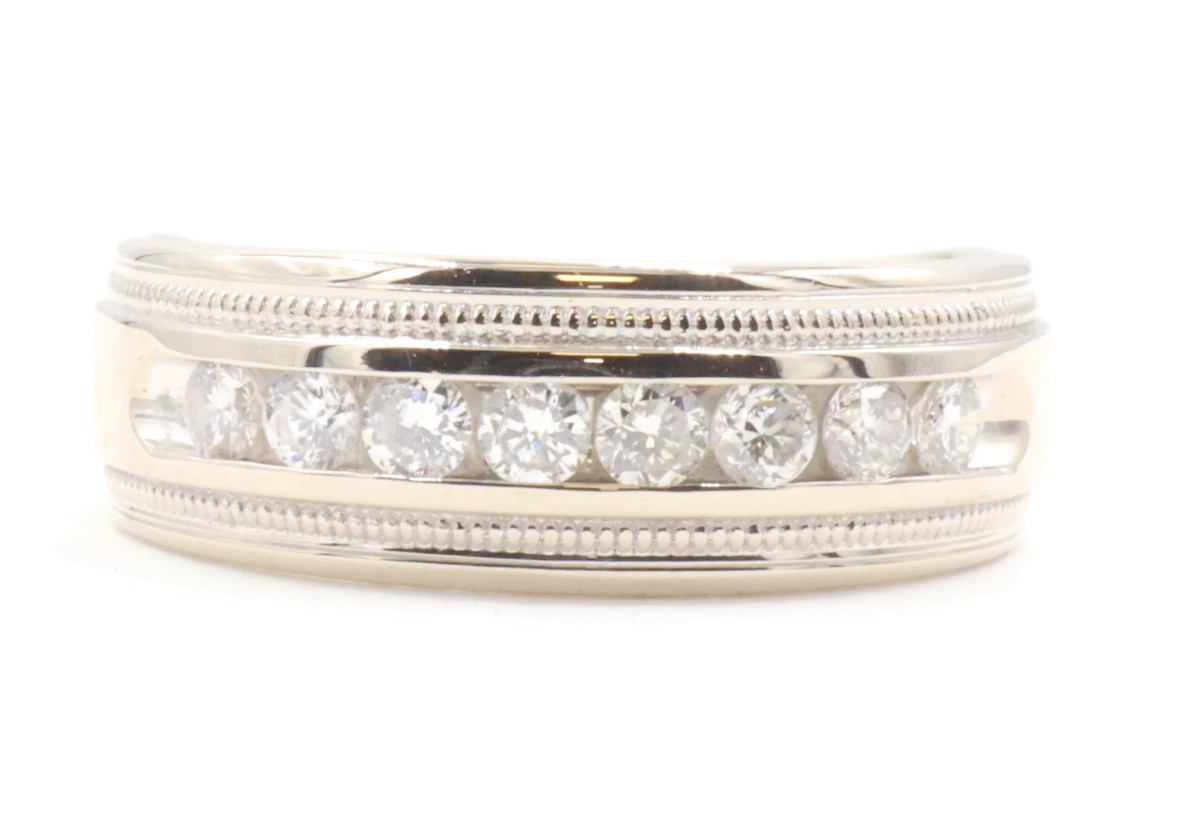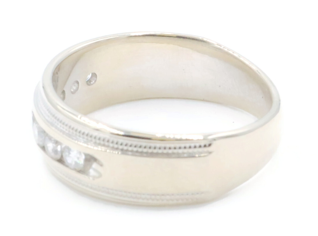 0.55 ctw Round Diamond 14KT White Gold 7.5mm Channel Band Milgrain Wedding Band. This ring is a size 9.