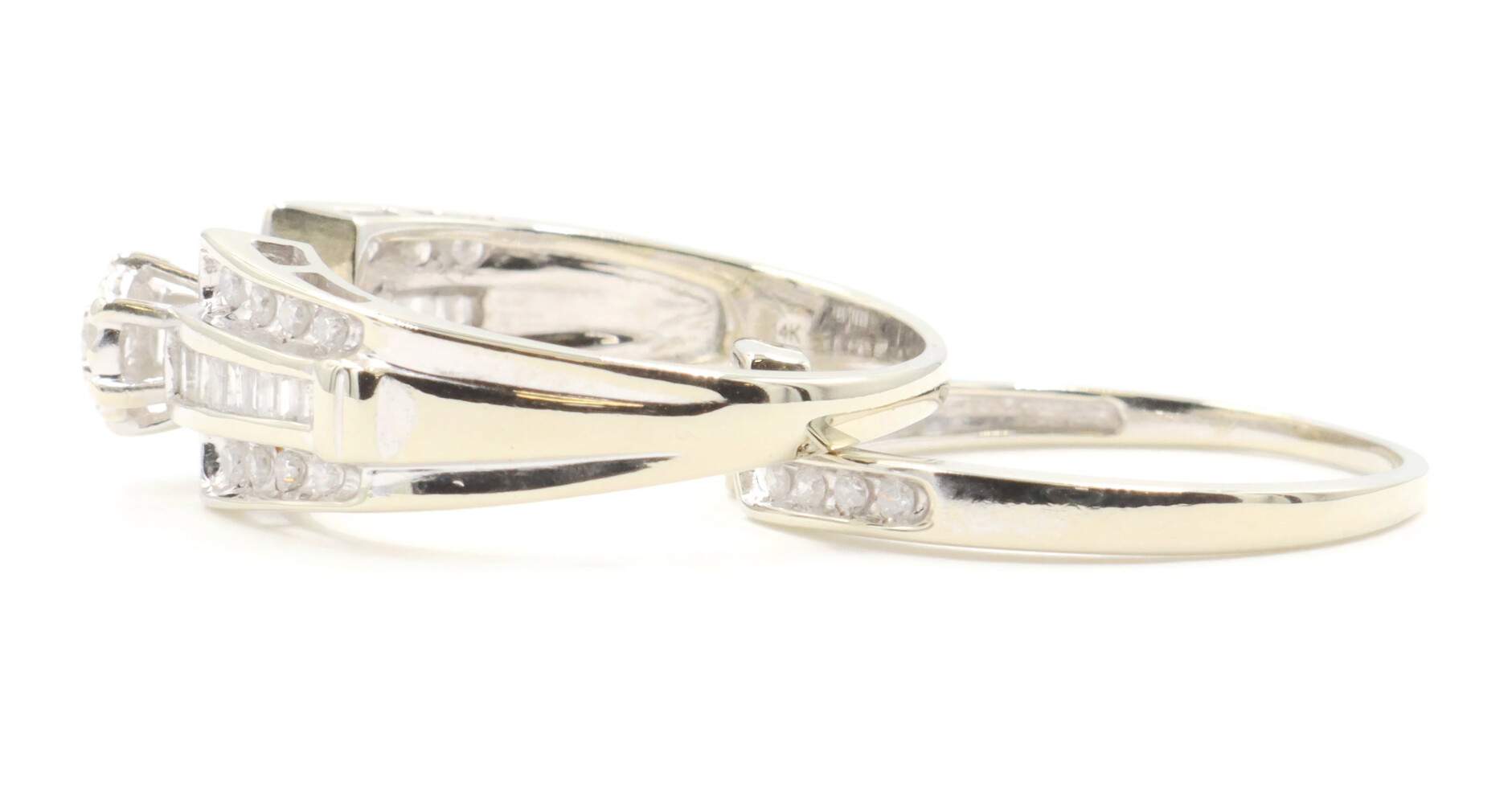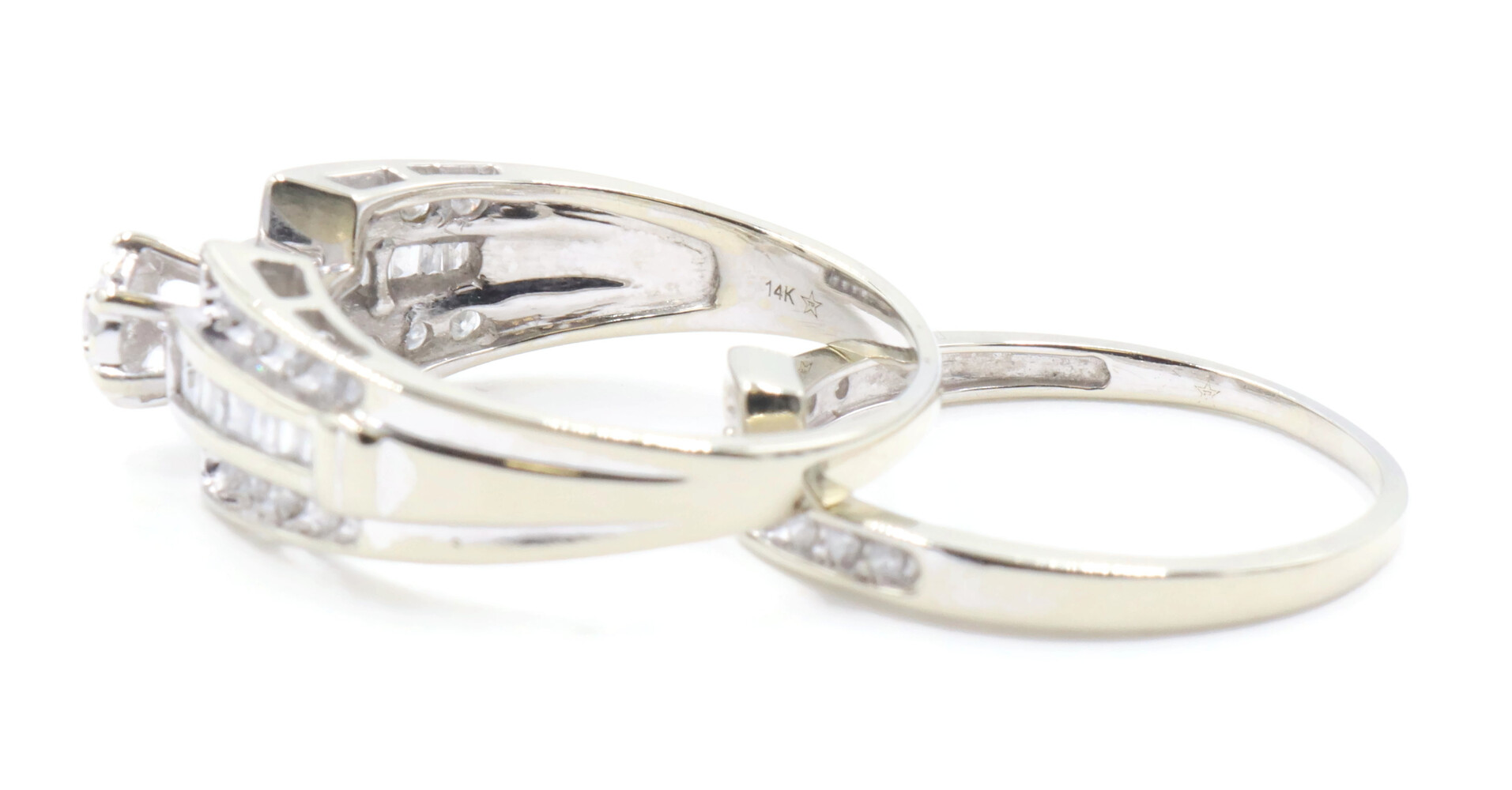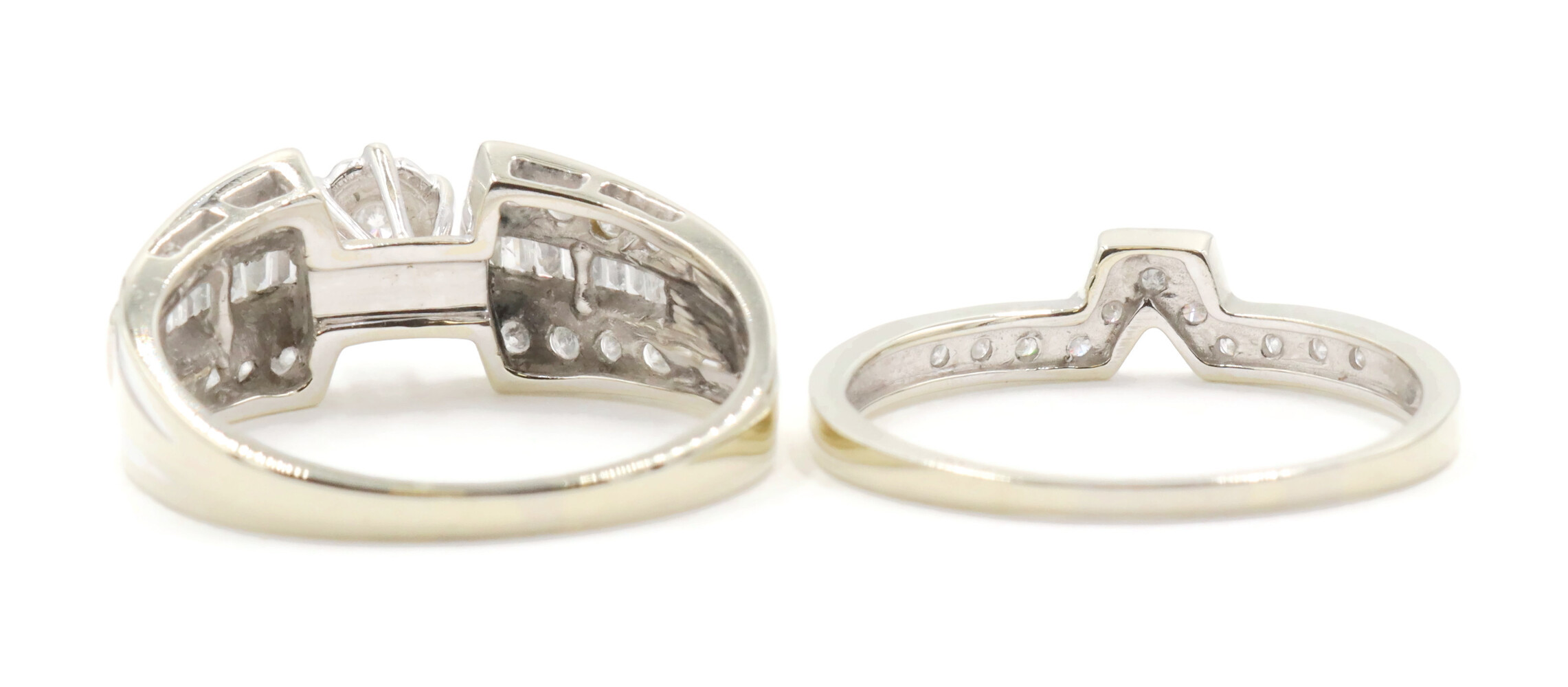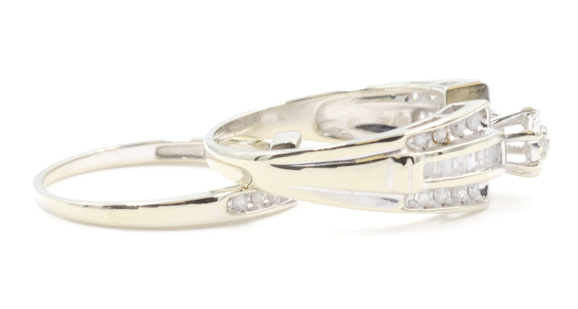 0.65 ctw Round and Baguette Channel Set 14KT White Gold Women's Wedding Ring Set. Both the band ring and engagement ring are a size 8 1/4.