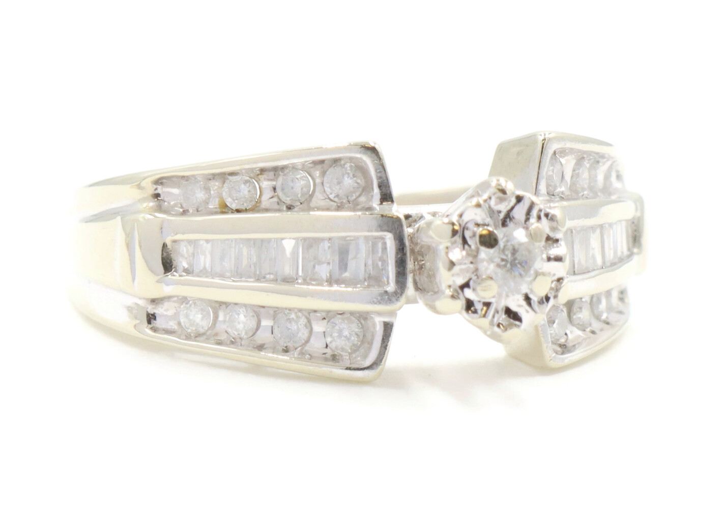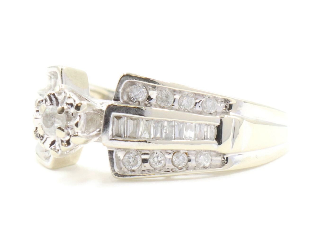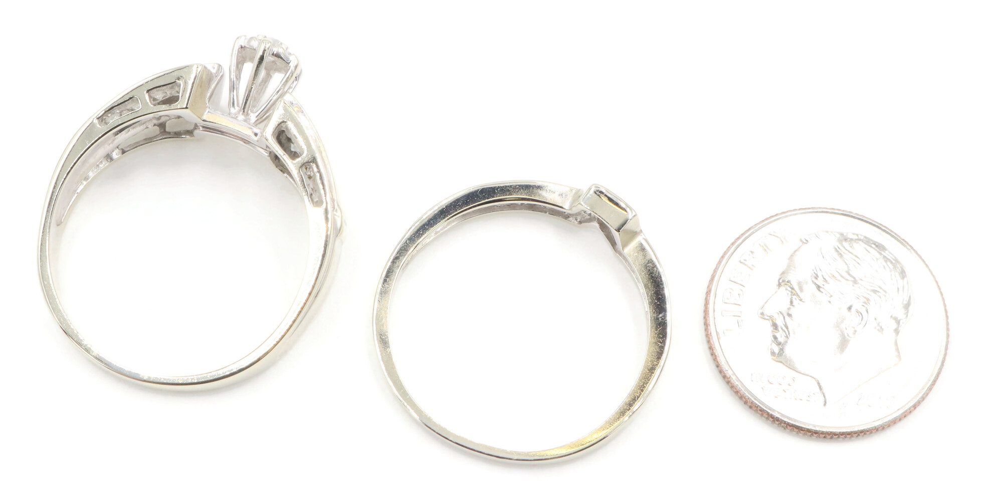 0.65 ctw Round and Baguette Channel Set 14KT White Gold Women's Wedding Ring Set. Both the band ring and engagement ring are a size 8 1/4.