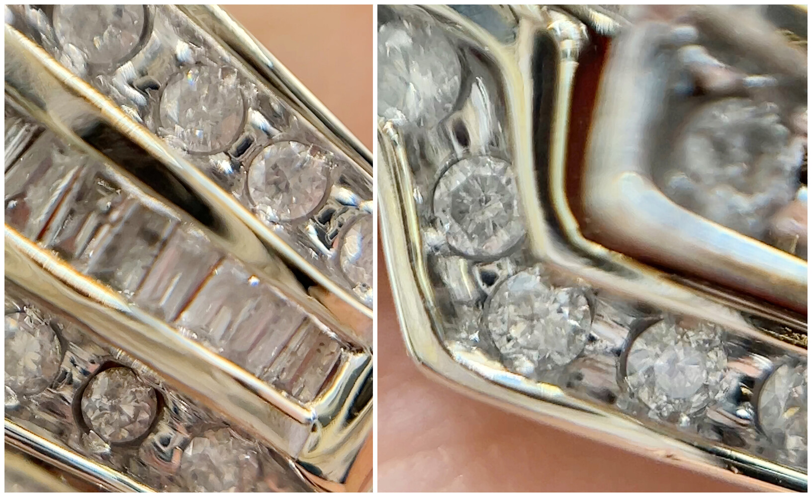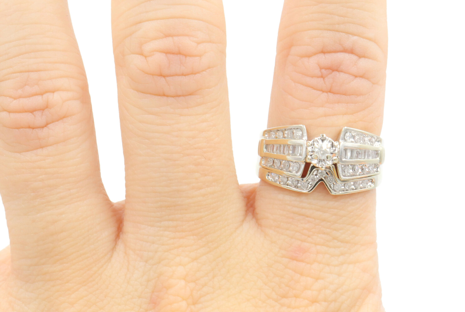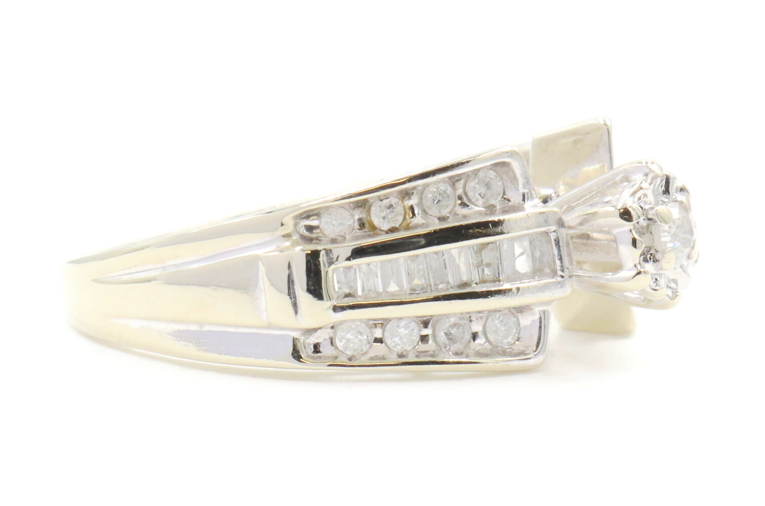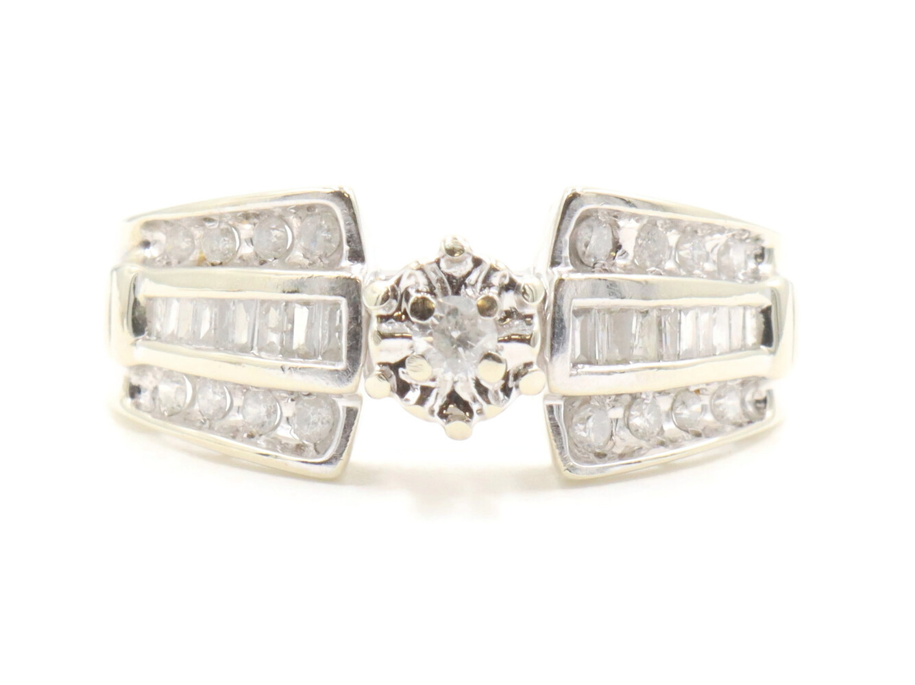 0.65 ctw Round and Baguette Channel Set 14KT White Gold Women's Wedding Ring Set. Both the band ring and engagement ring are a size 8 1/4.
