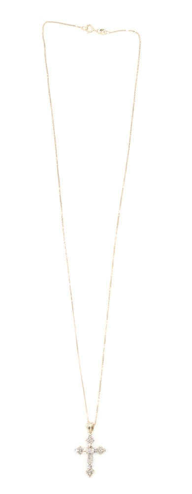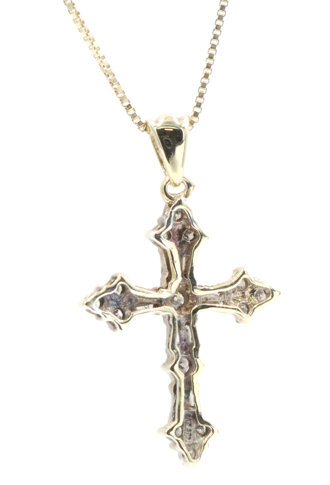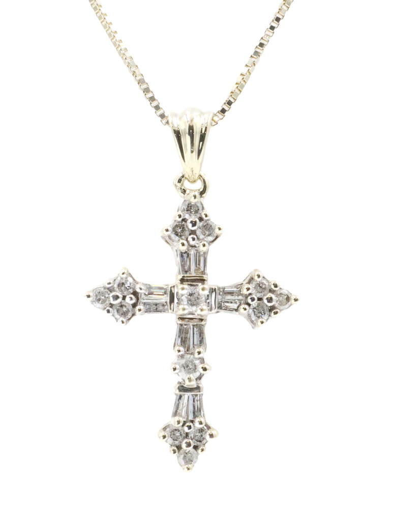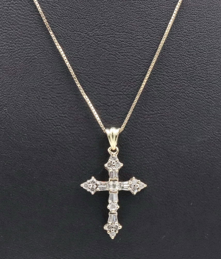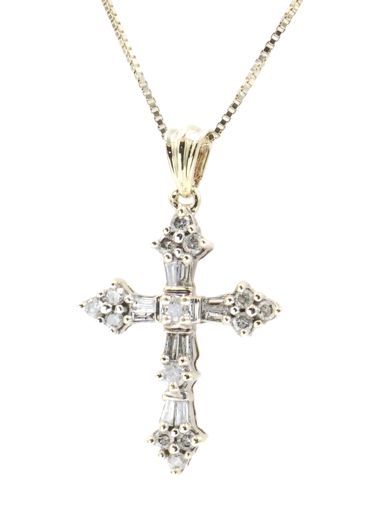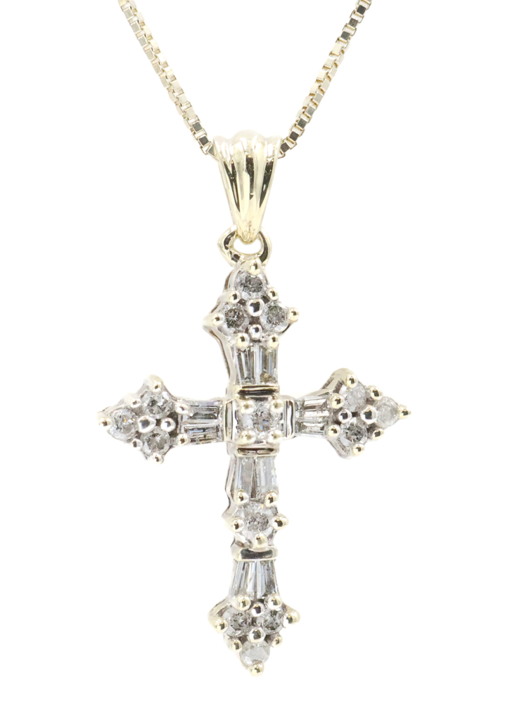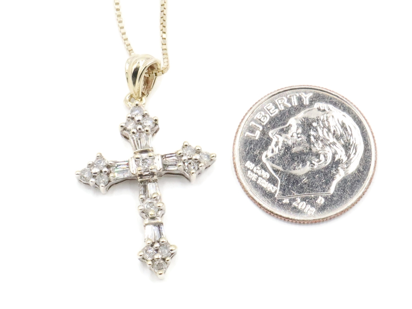 0.65 ctw Round & Baguette Diamond 10KT Gold Cross Pendant on 20.5" 14KT Necklace. The pendant is 10KT yellow gold and the necklace is 14KT yellow gold.