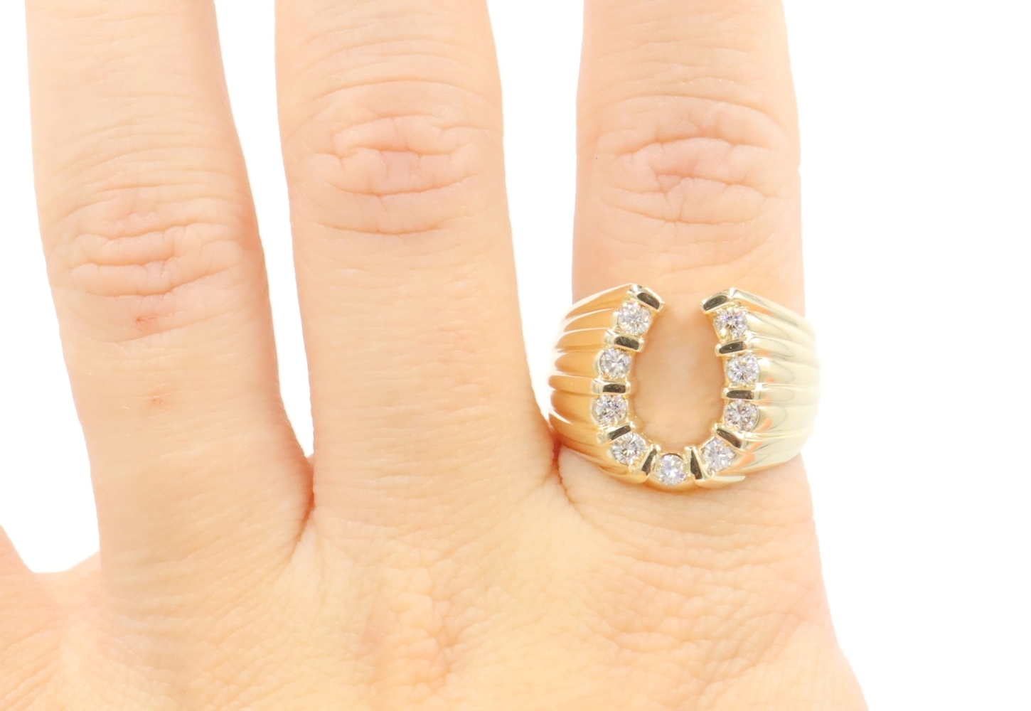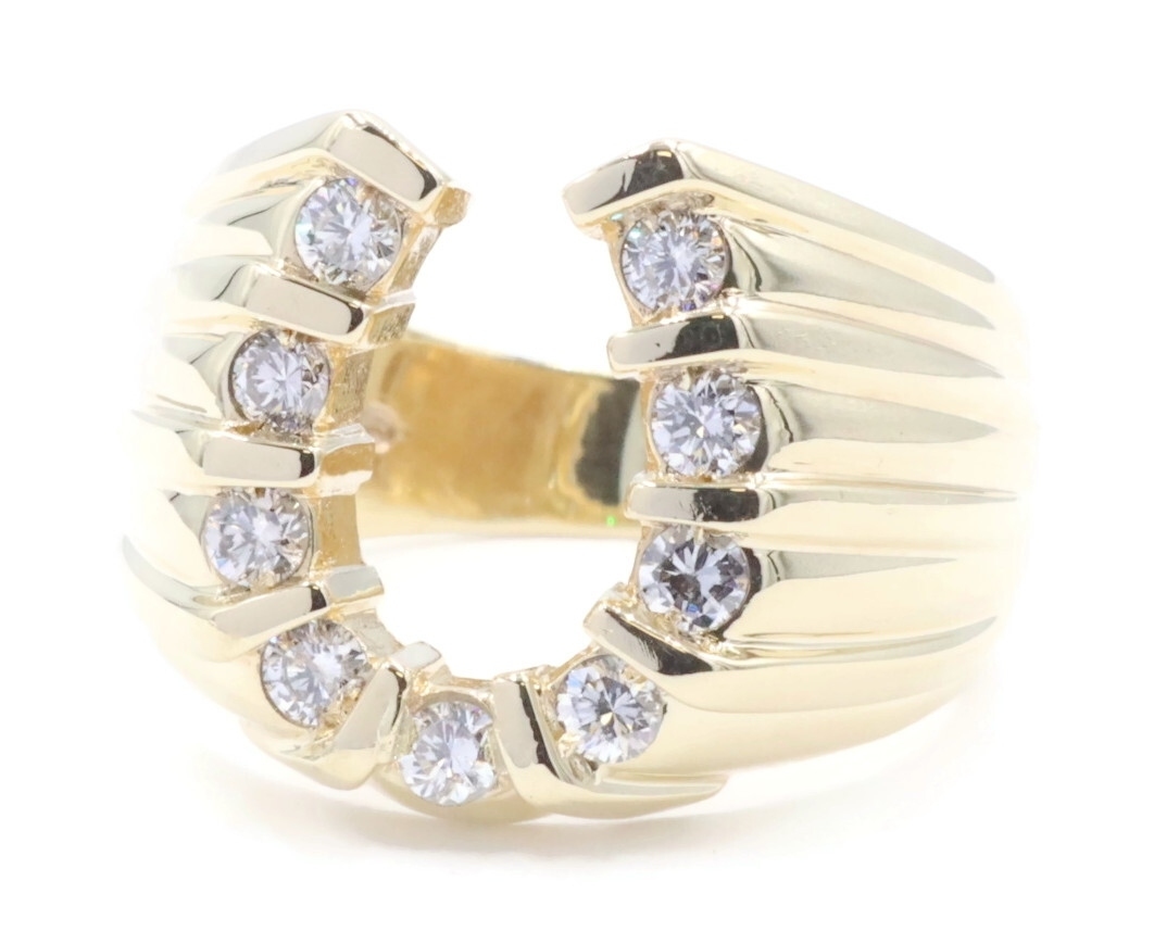 0.72 ctw Round Diamond 14KT Yellow Gold Men's Ribbed Horseshoe Estate Ring. This ring is a size 9 1/4.