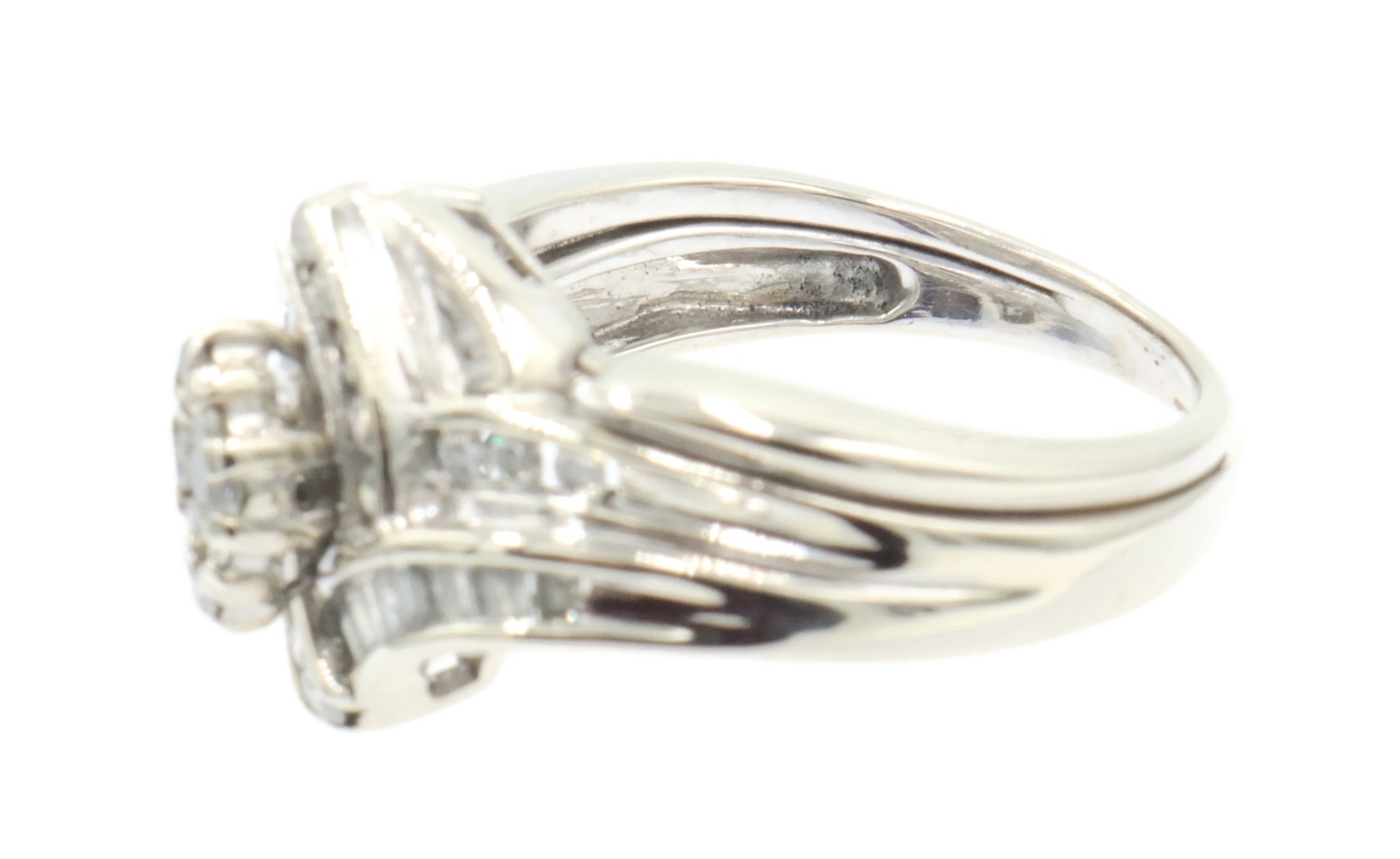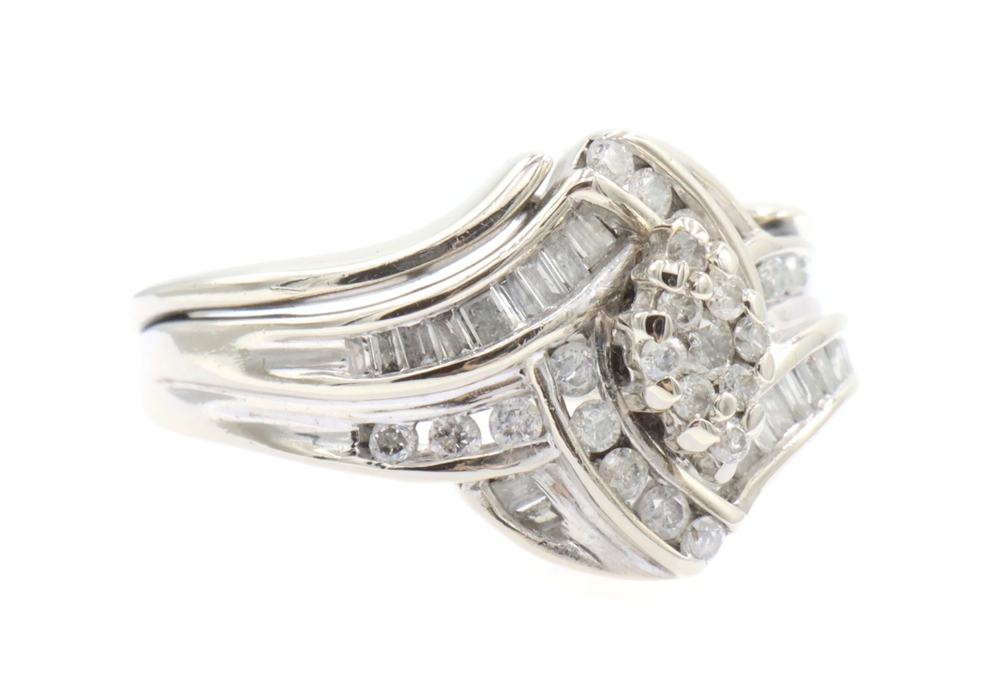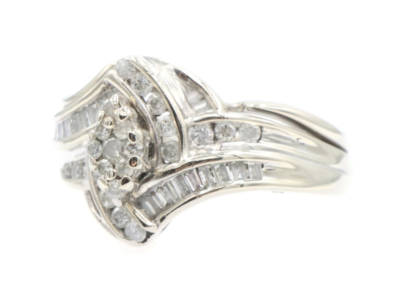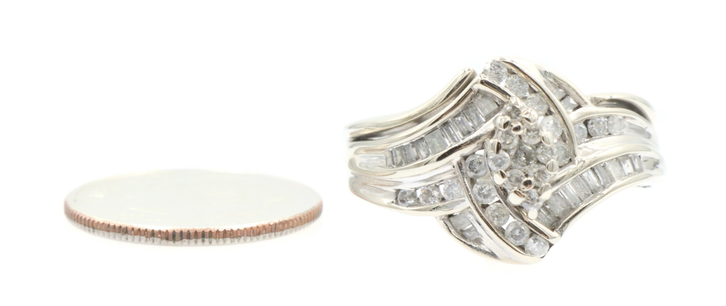 0.73 Ctw Round & Baguette Diamond 10KT White Gold Soldered Wedding Ring Set 5.5g. This wedding ring set is a size 7 and the bands have been soldered together.
