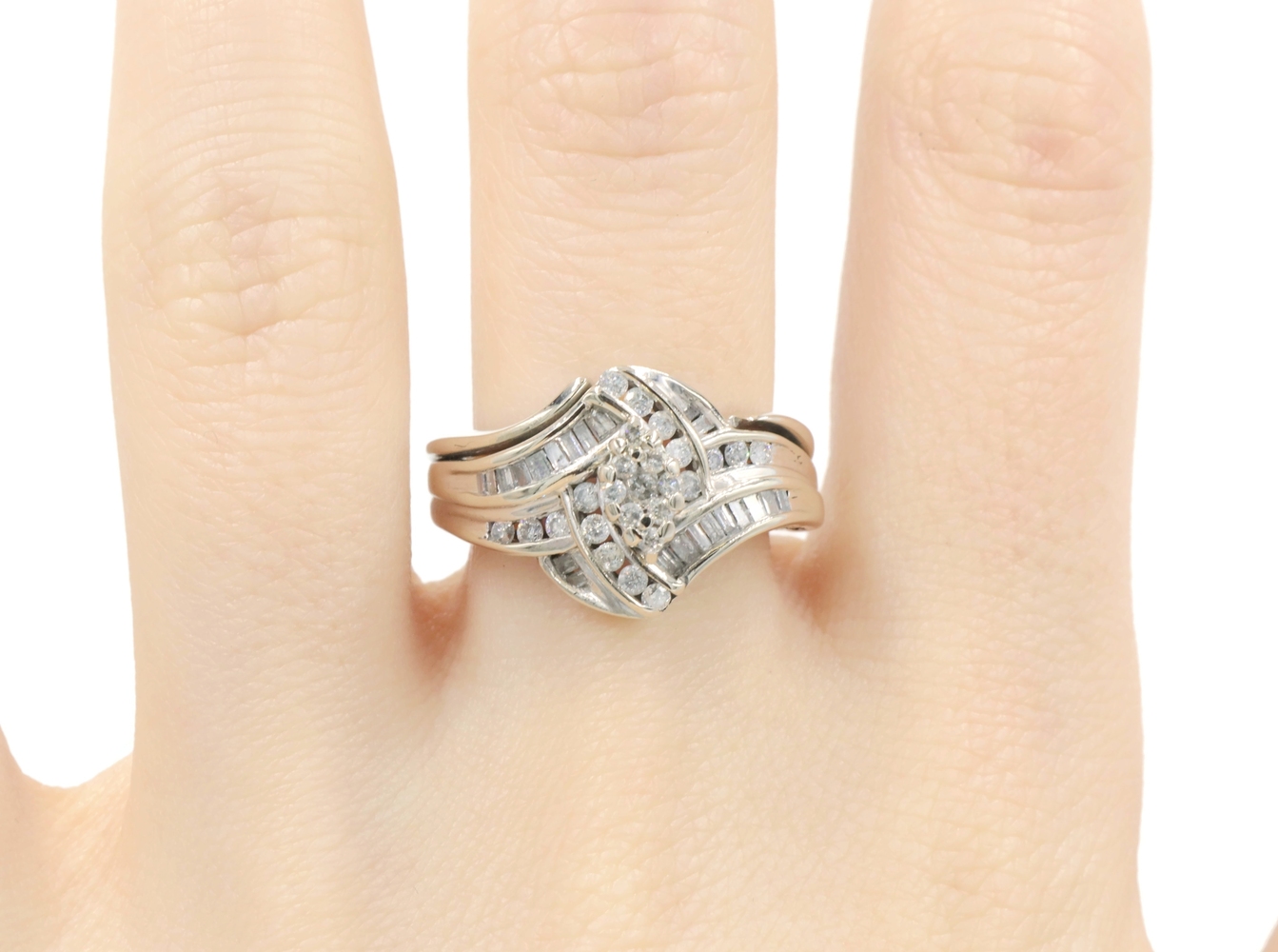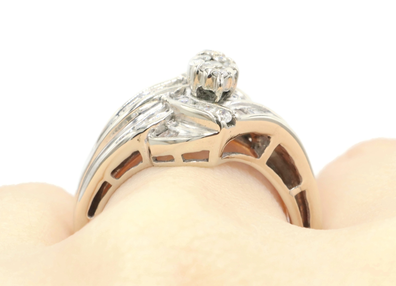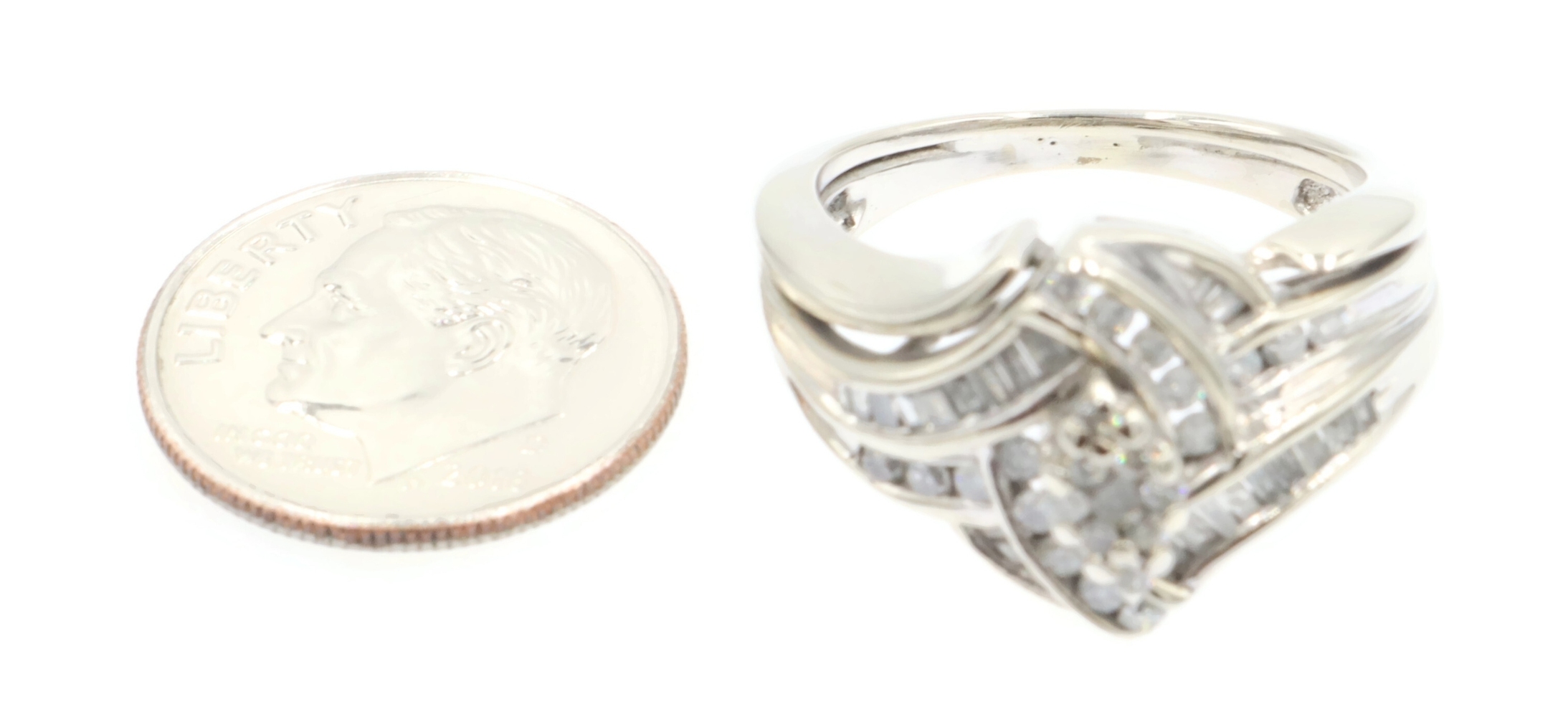 0.73 Ctw Round & Baguette Diamond 10KT White Gold Soldered Wedding Ring Set 5.5g. This wedding ring set is a size 7 and the bands have been soldered together.