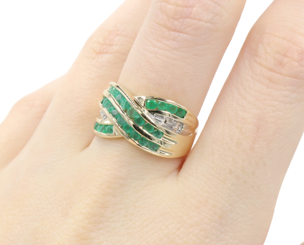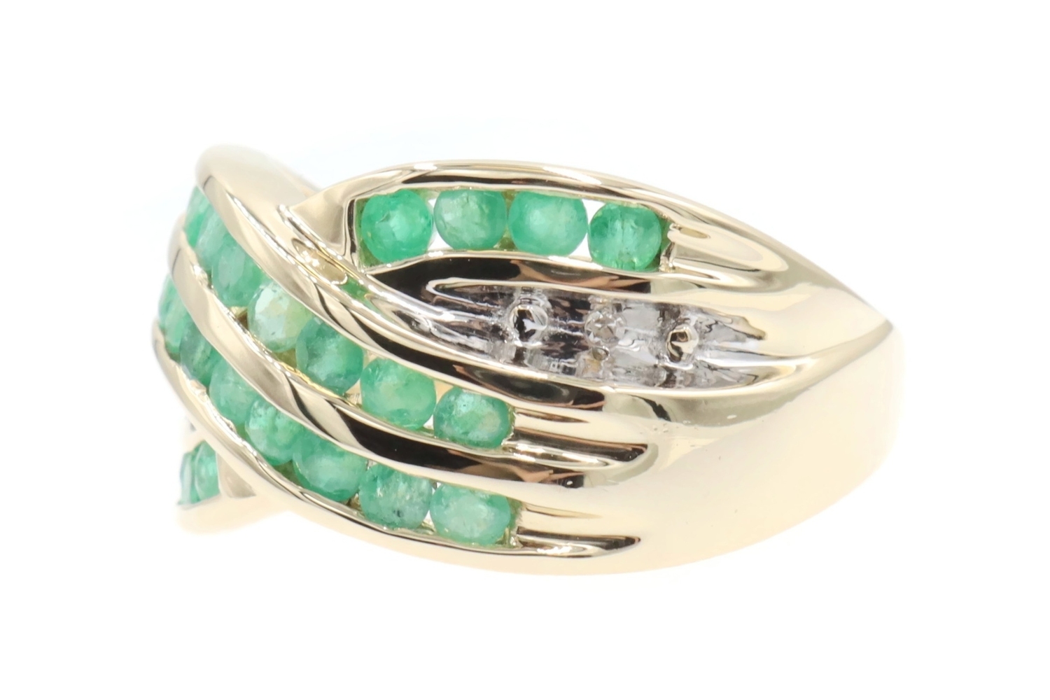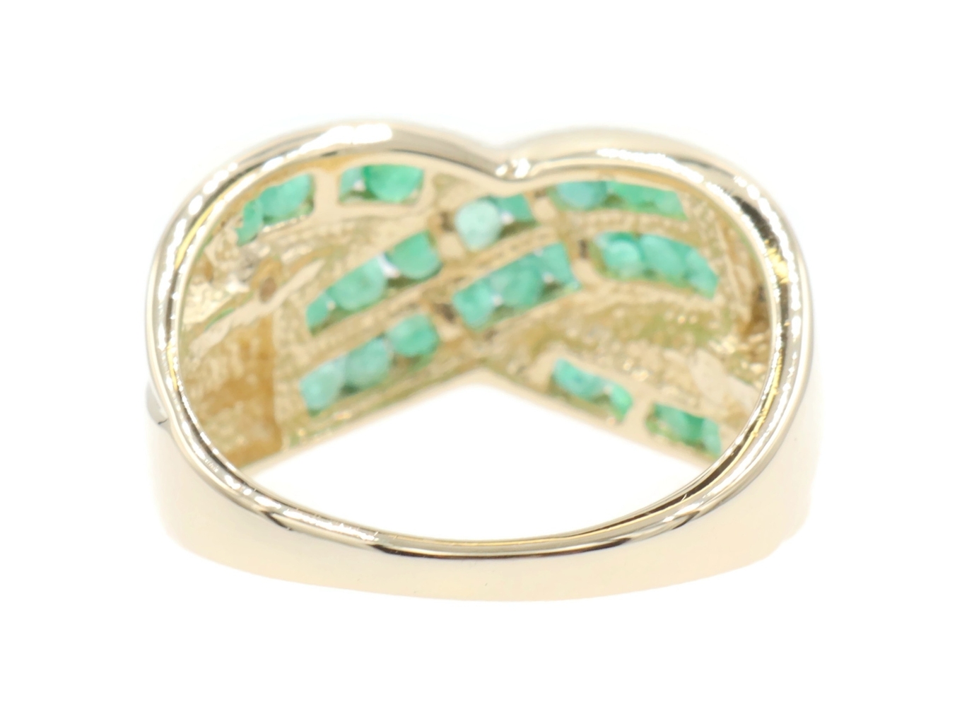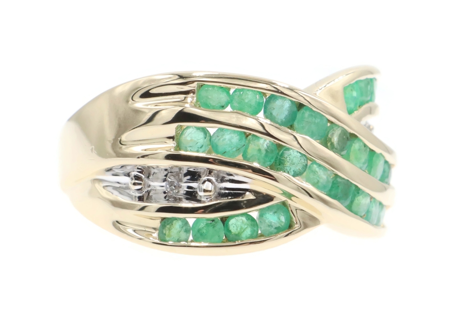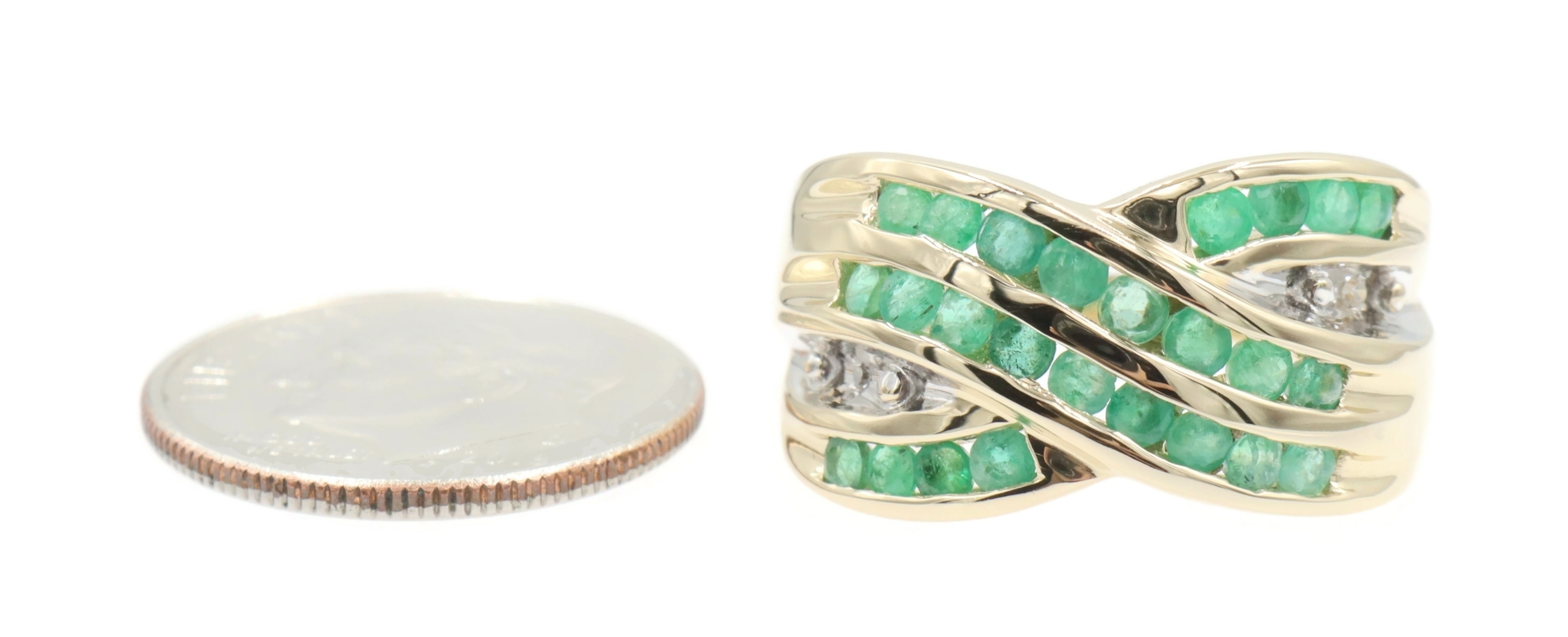 0.75 Ctw Round Natural Emerald & Diamond 10KT Yellow Gold Crossover Ring 3.95g. This ring is a size 7.
