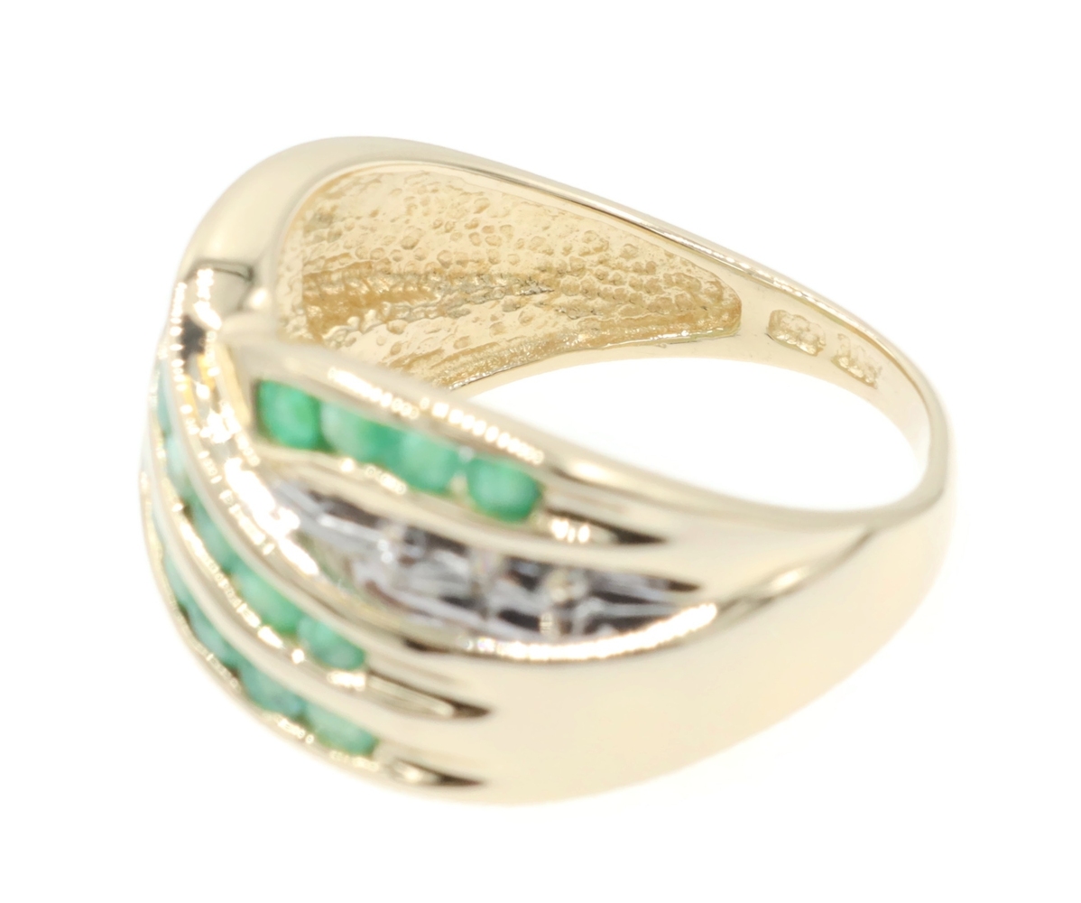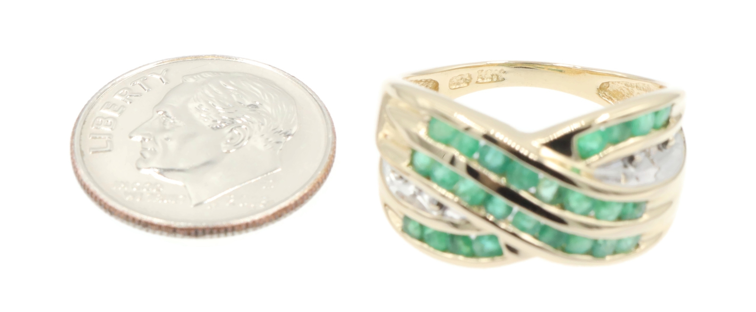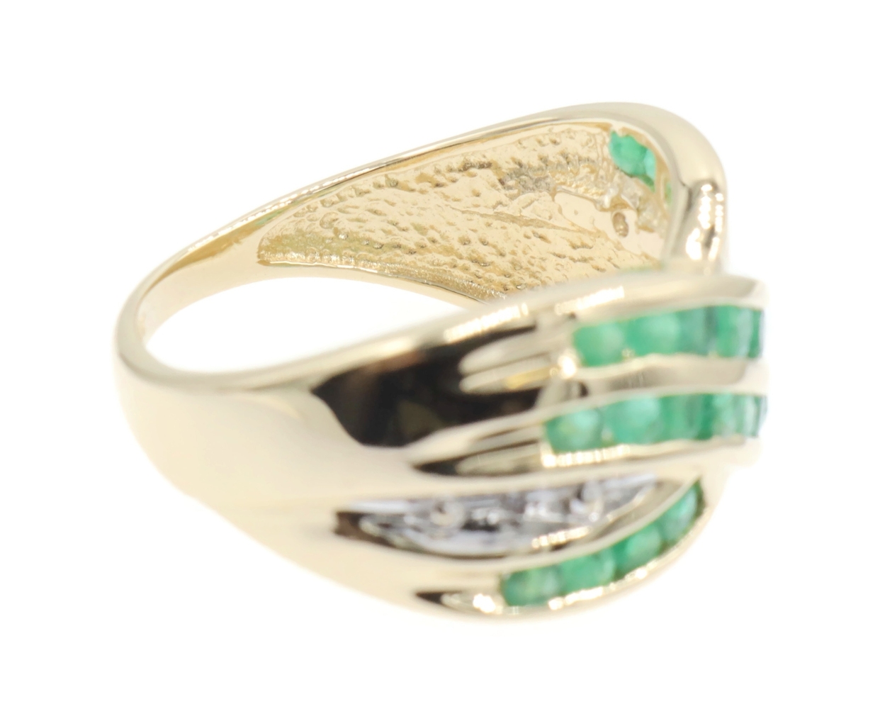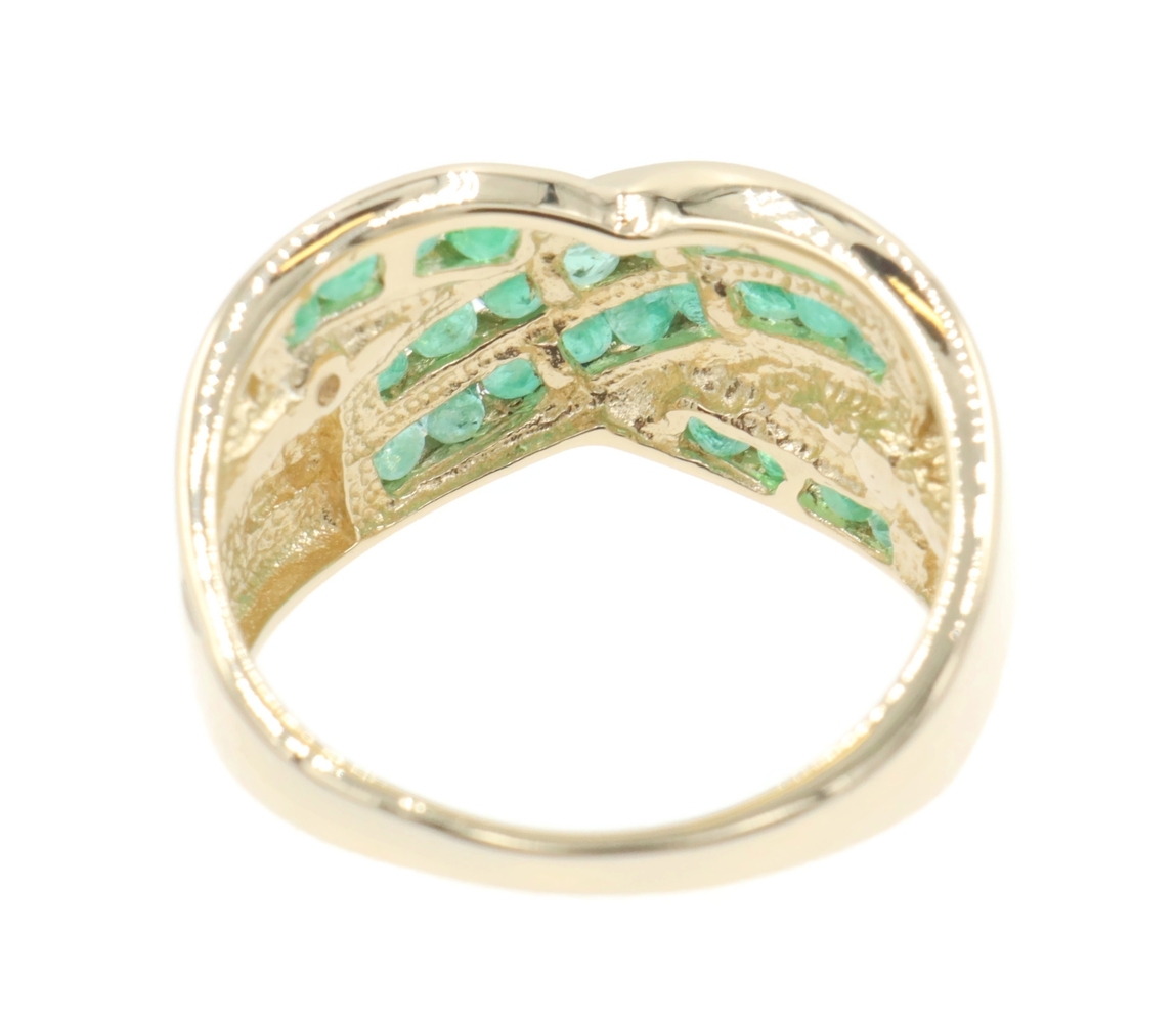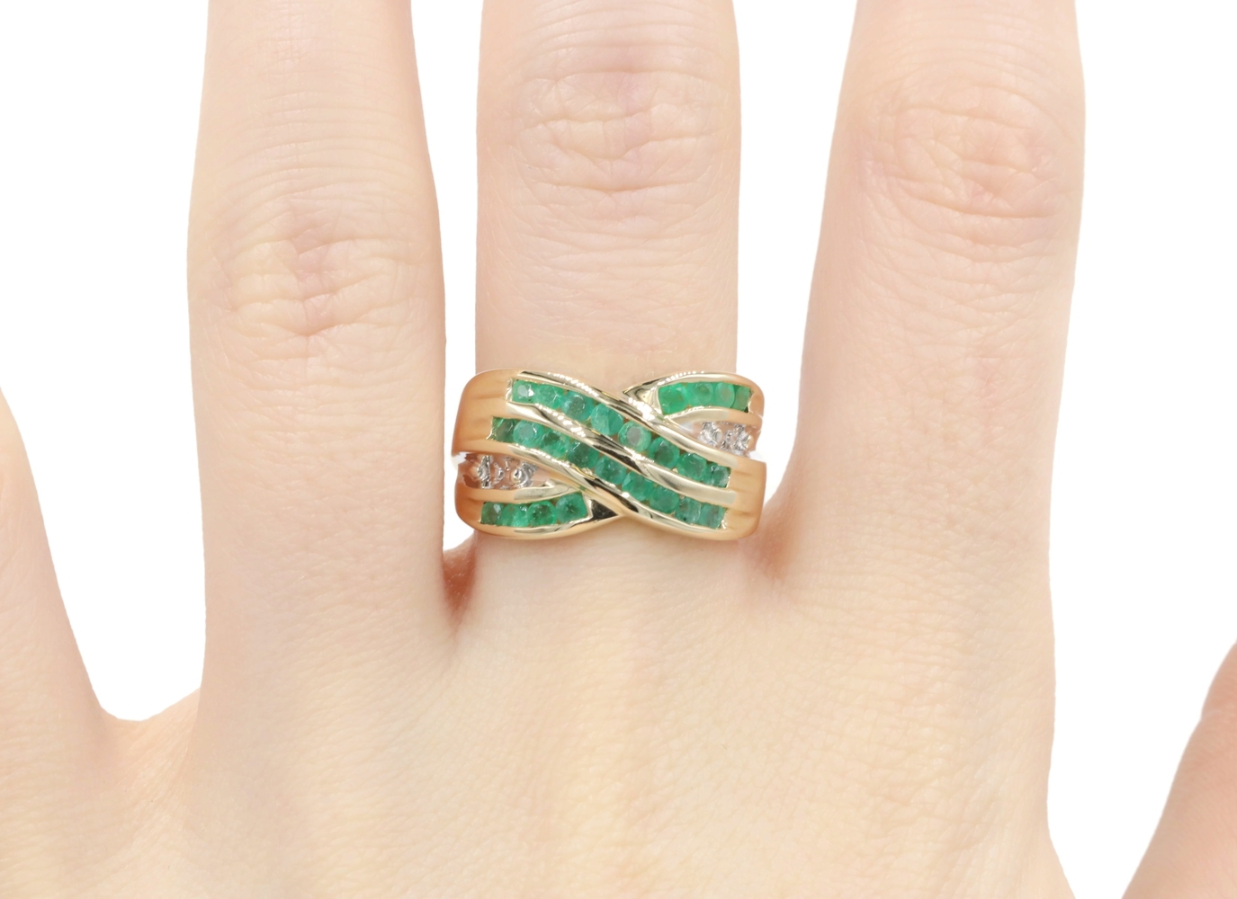 0.75 Ctw Round Natural Emerald & Diamond 10KT Yellow Gold Crossover Ring 3.95g. This ring is a size 7.
