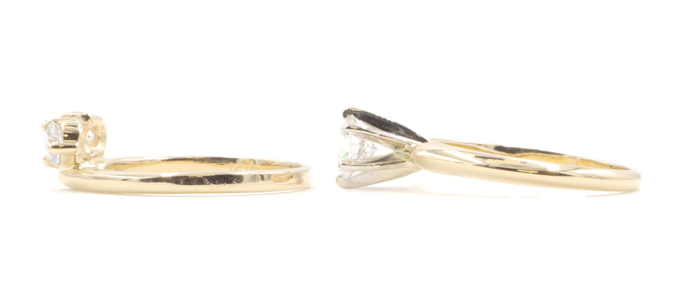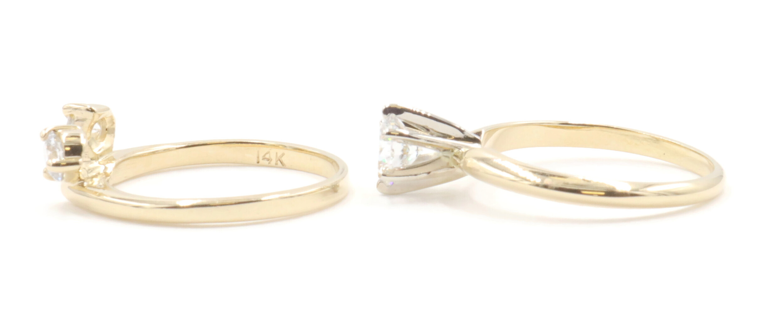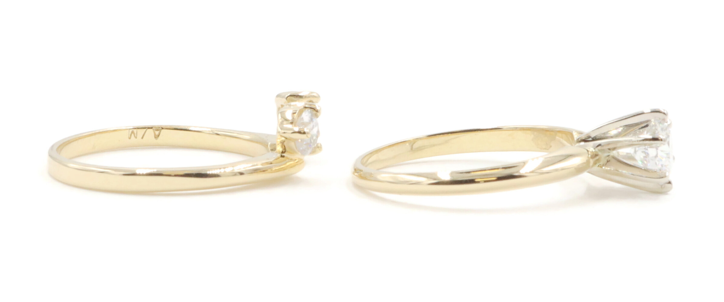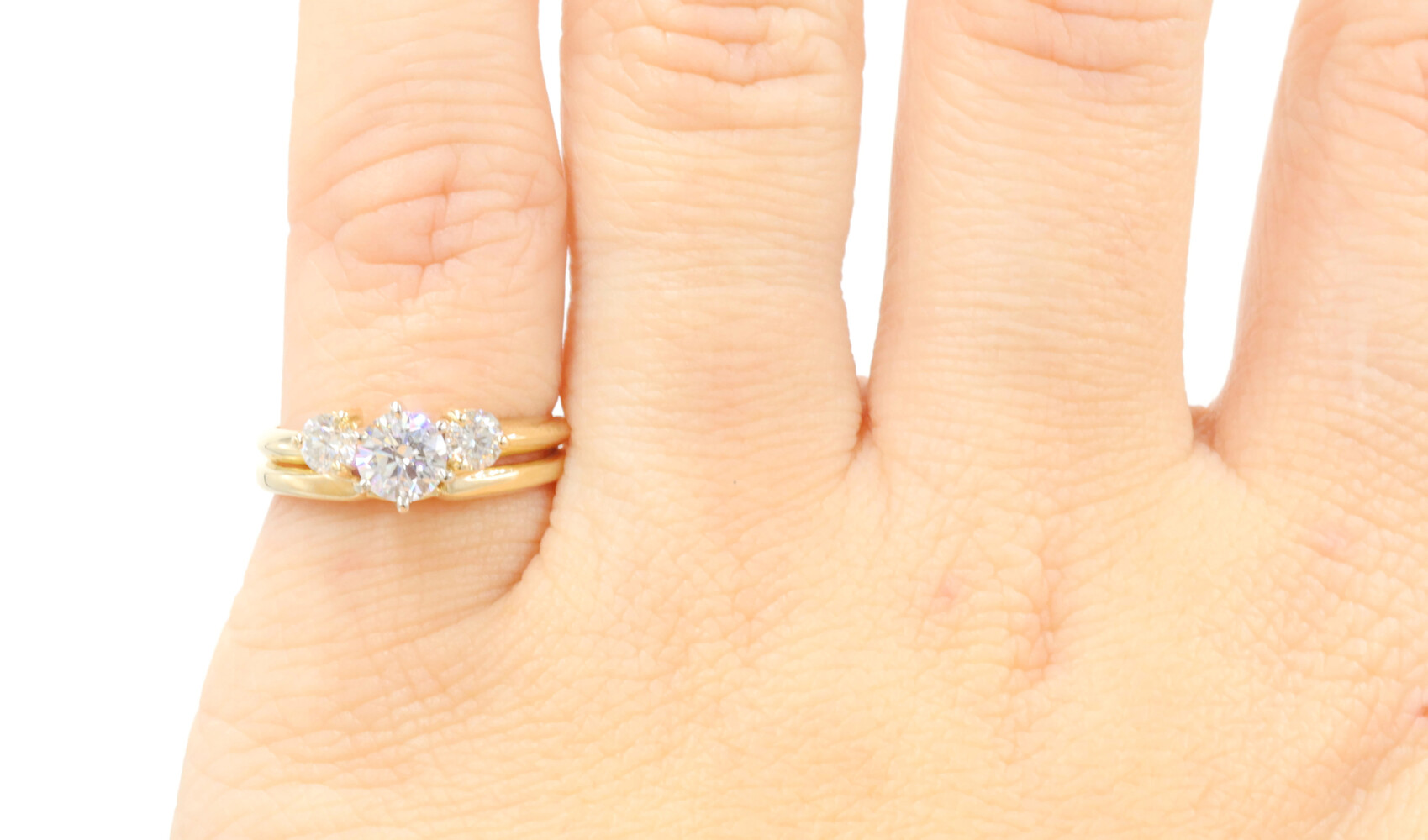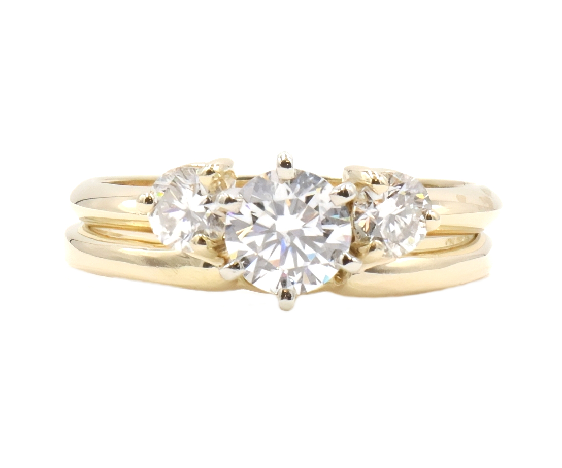 0.84 ctw Round Diamond Past Present Future 14Kt Yellow Gold Wedding Ring Set. Both the engagement ring and band ring are a size 5 1/4.
