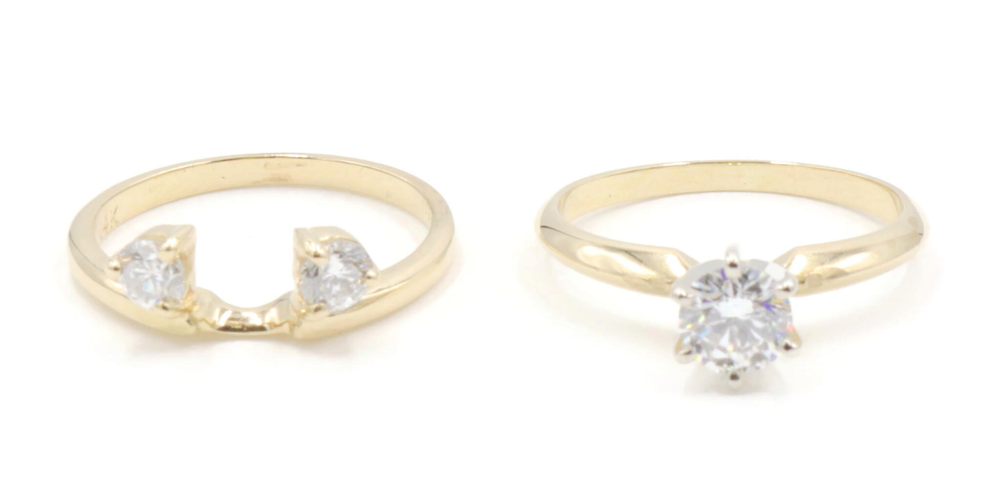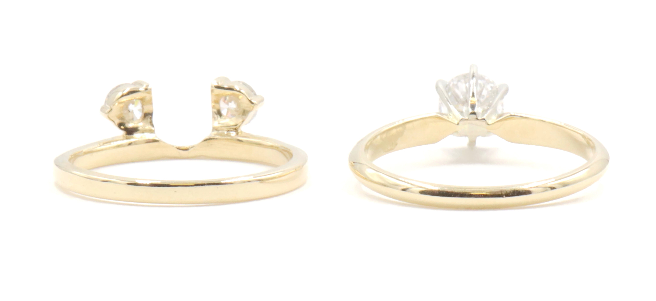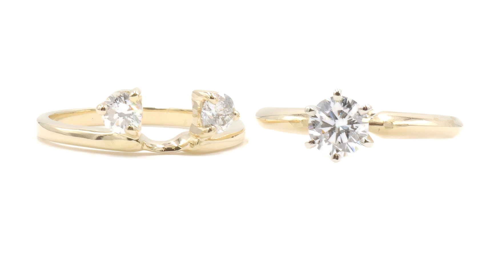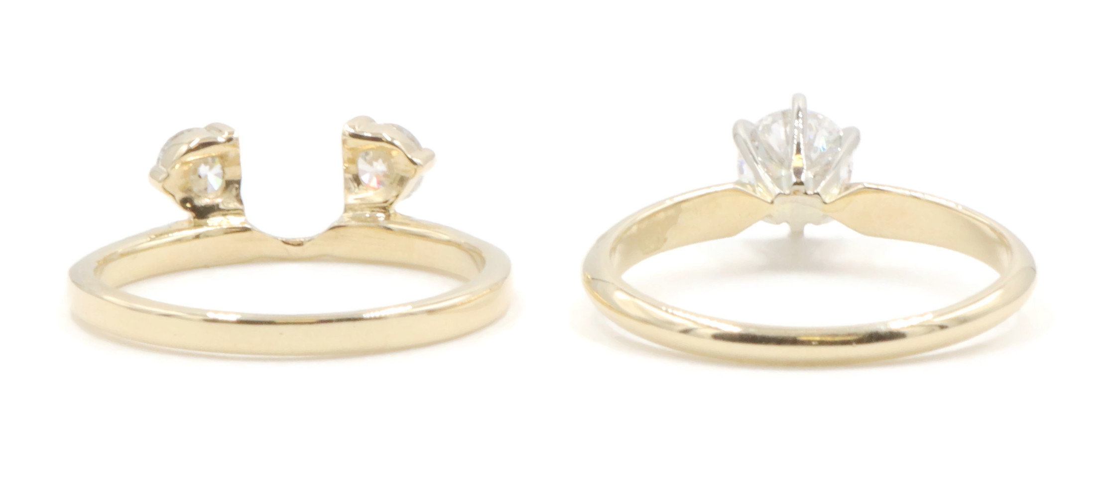 0.84 ctw Round Diamond Past Present Future 14Kt Yellow Gold Wedding Ring Set. Both the engagement ring and band ring are a size 5 1/4.