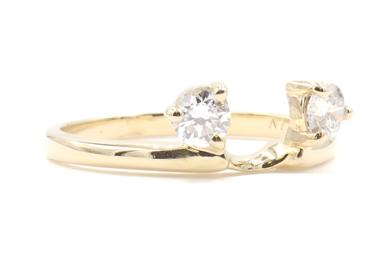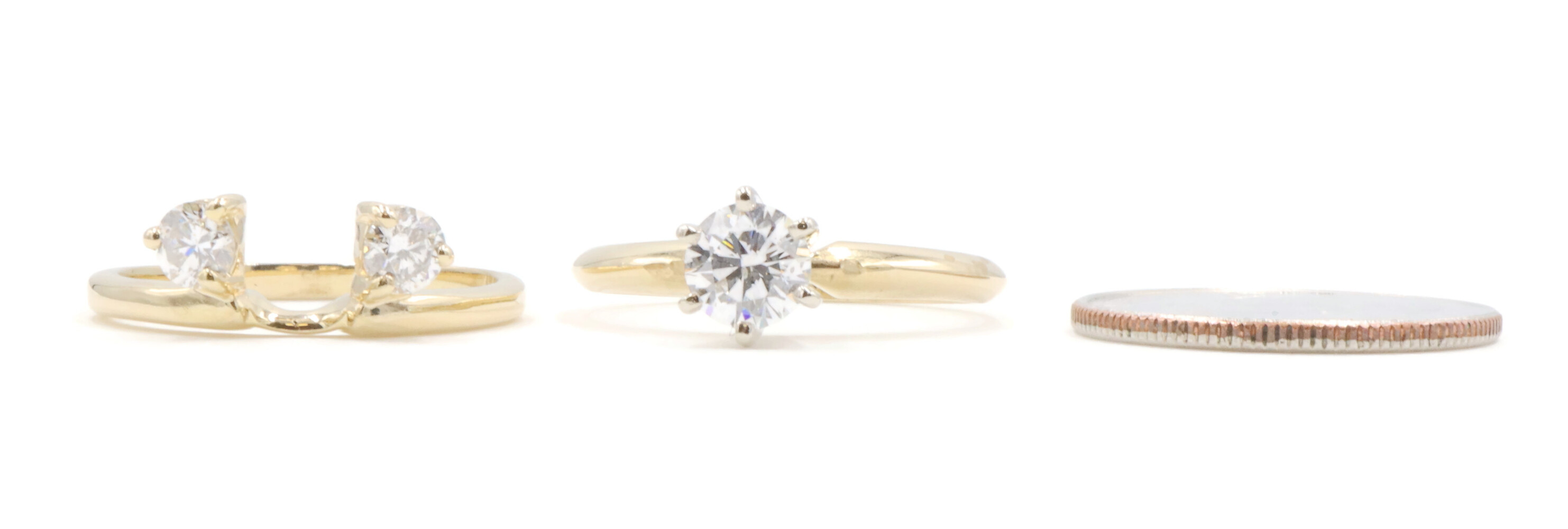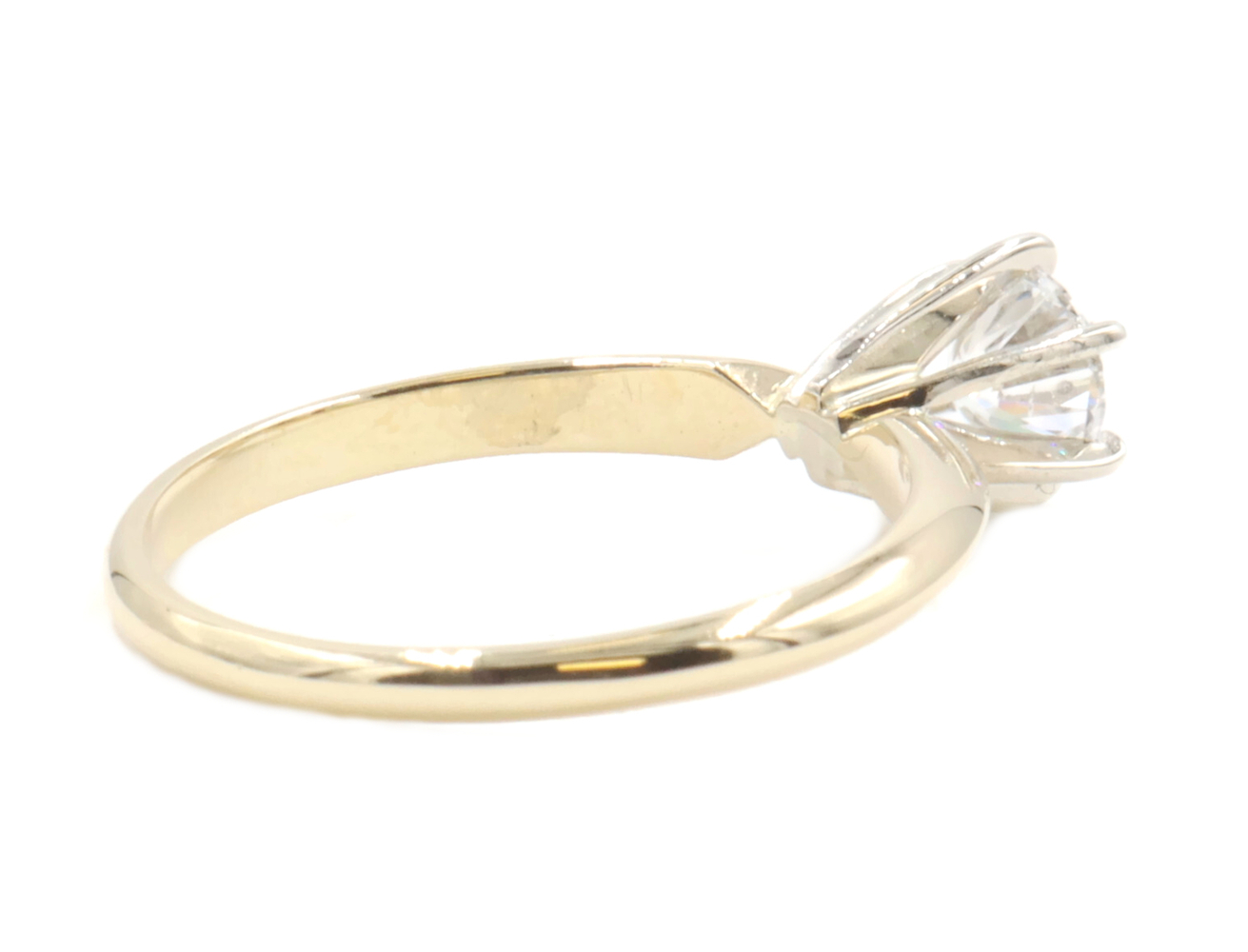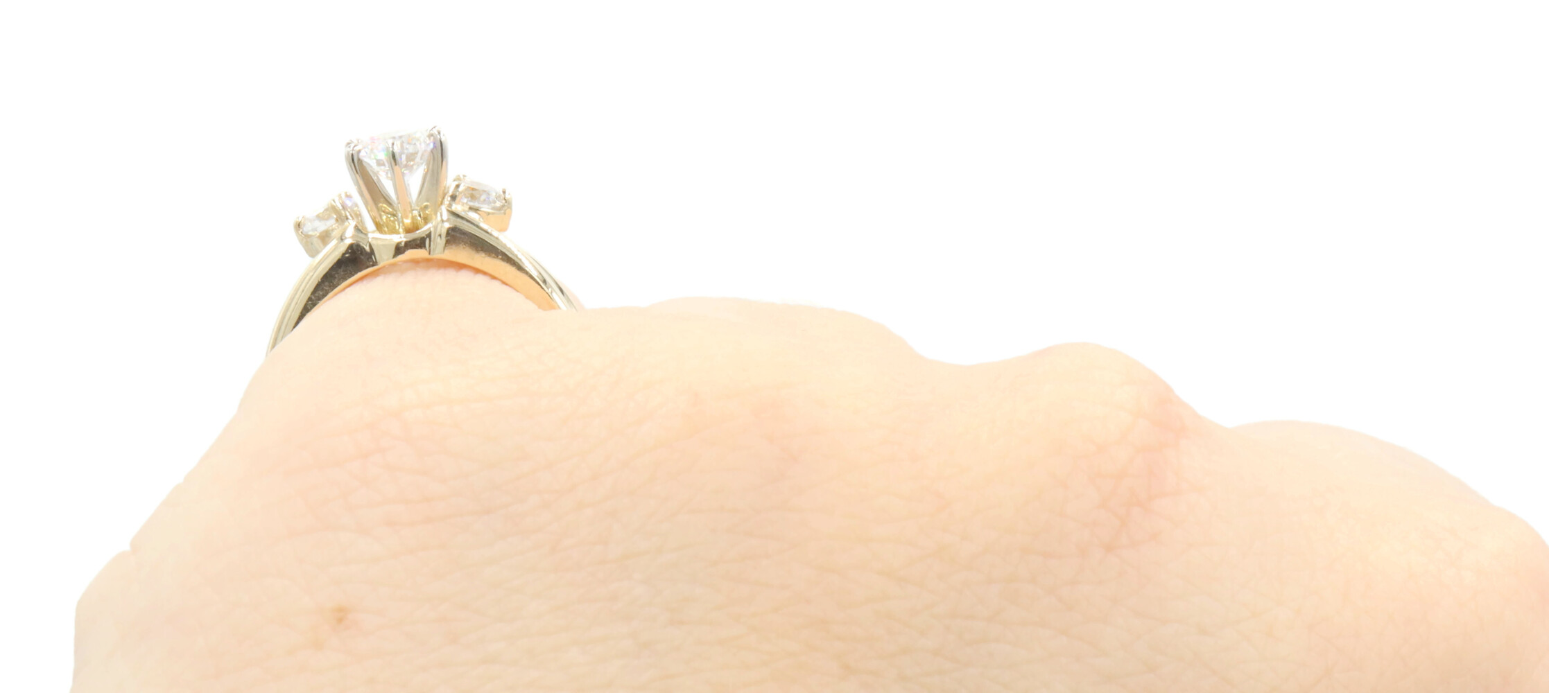 0.84 ctw Round Diamond Past Present Future 14Kt Yellow Gold Wedding Ring Set. Both the engagement ring and band ring are a size 5 1/4.