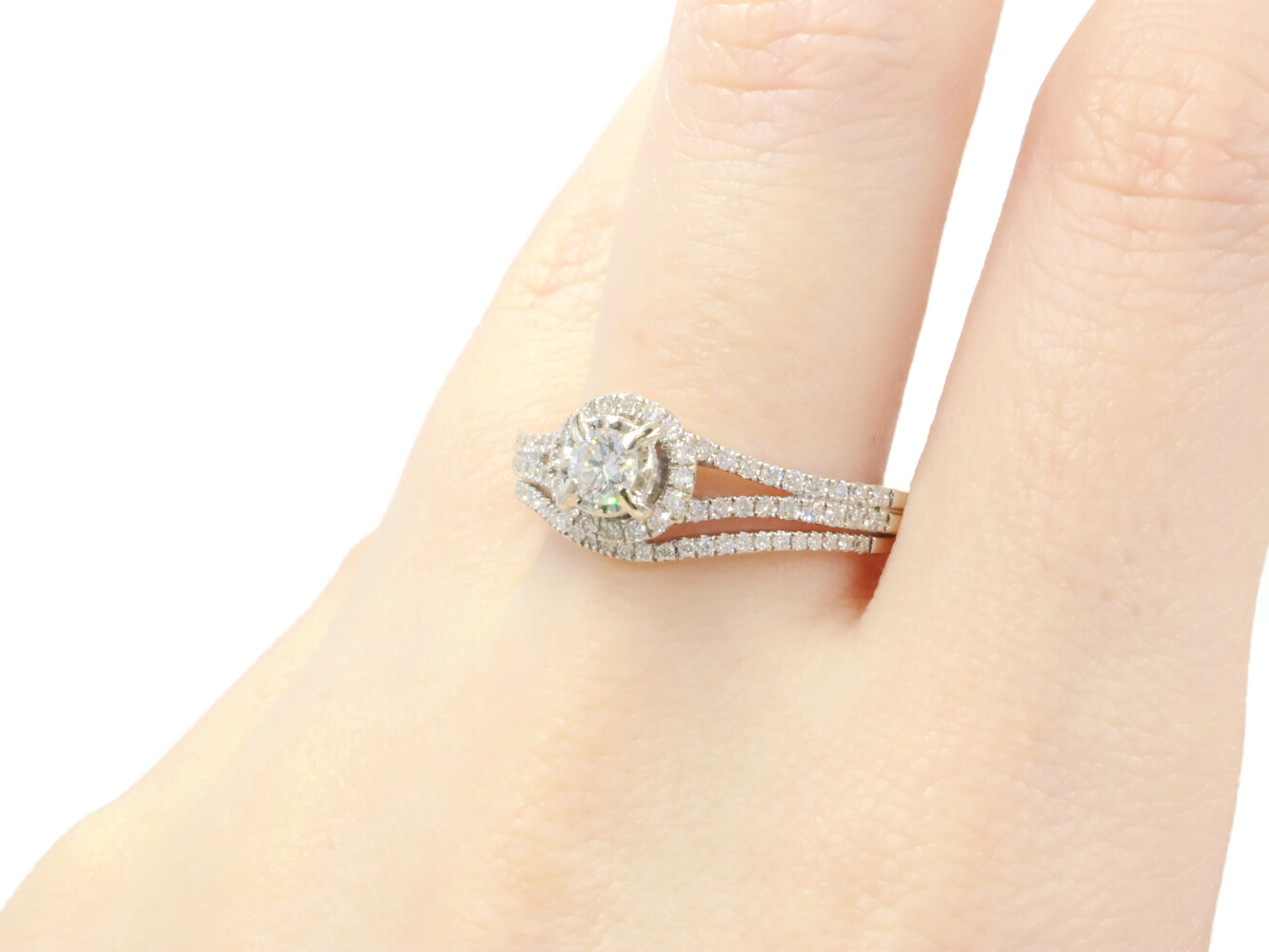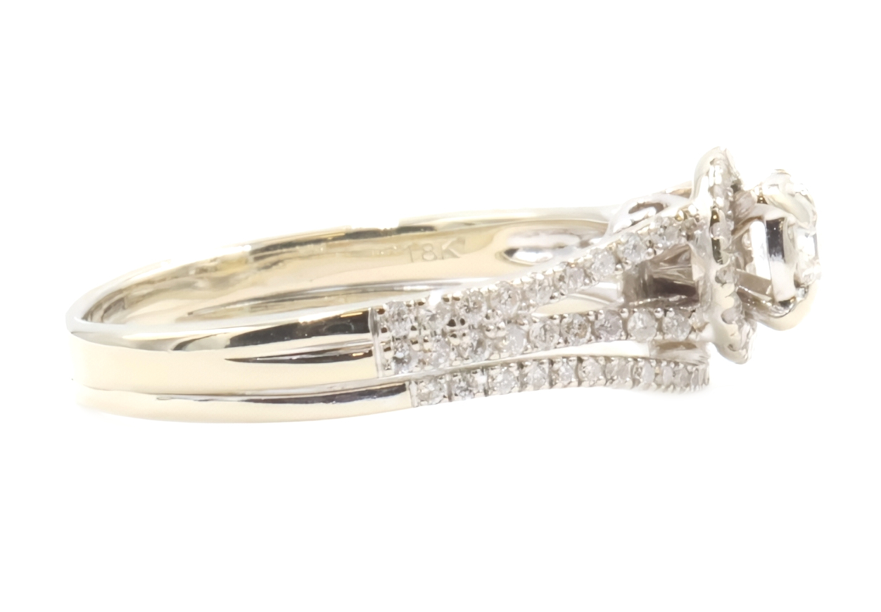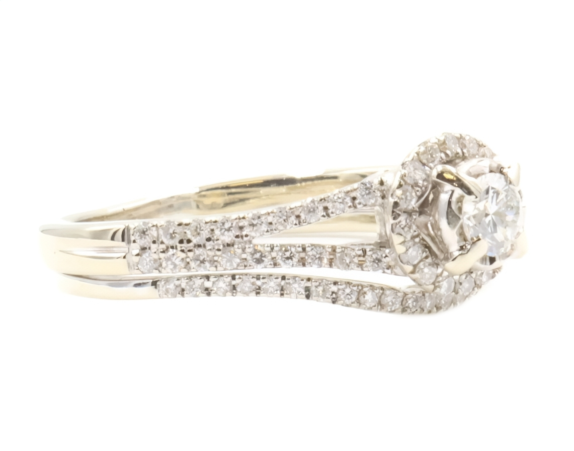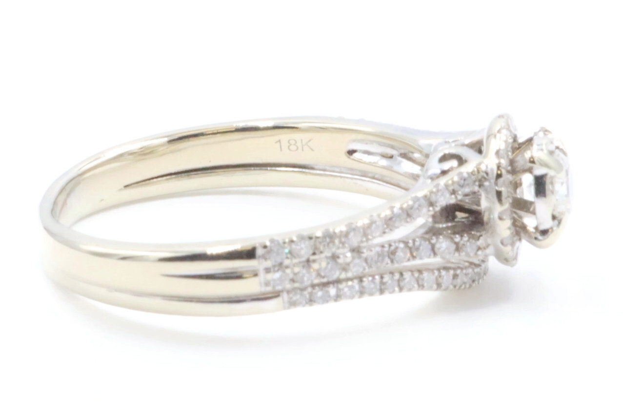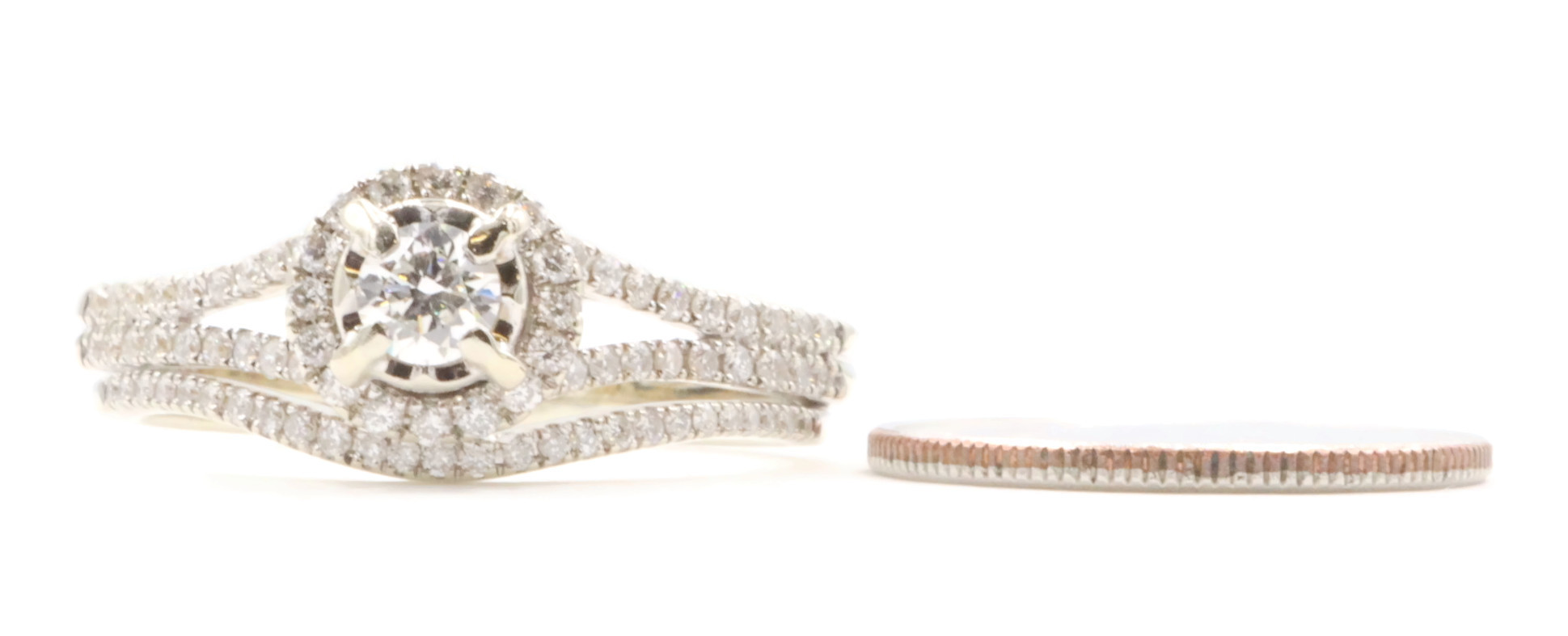 0.85 ctw Round Diamond Halo 18KT & 14KT White Gold Women's Wedding Ring Set. The engagement ring is 18KT white gold and the band ring is 14KT white gold. This ring is a size 9.