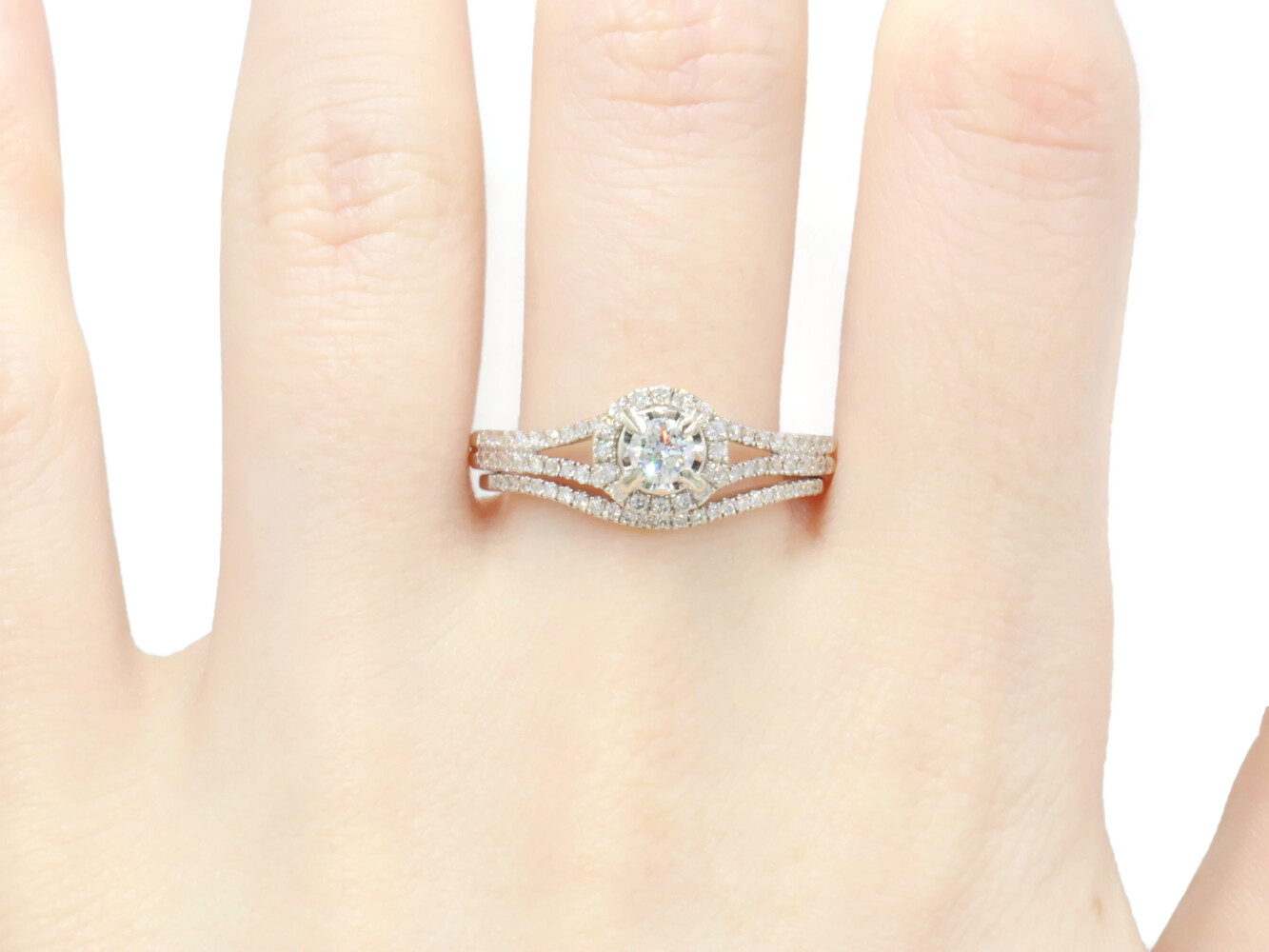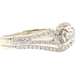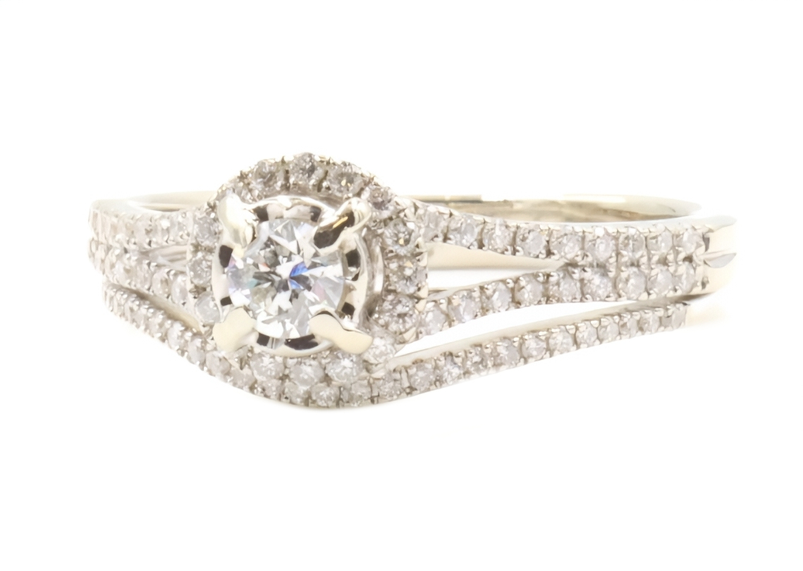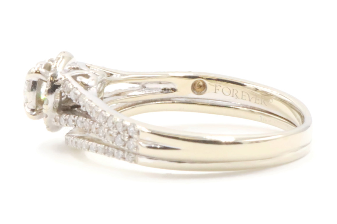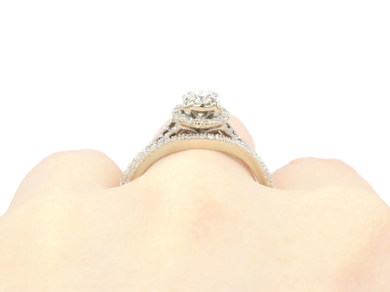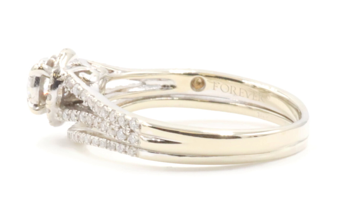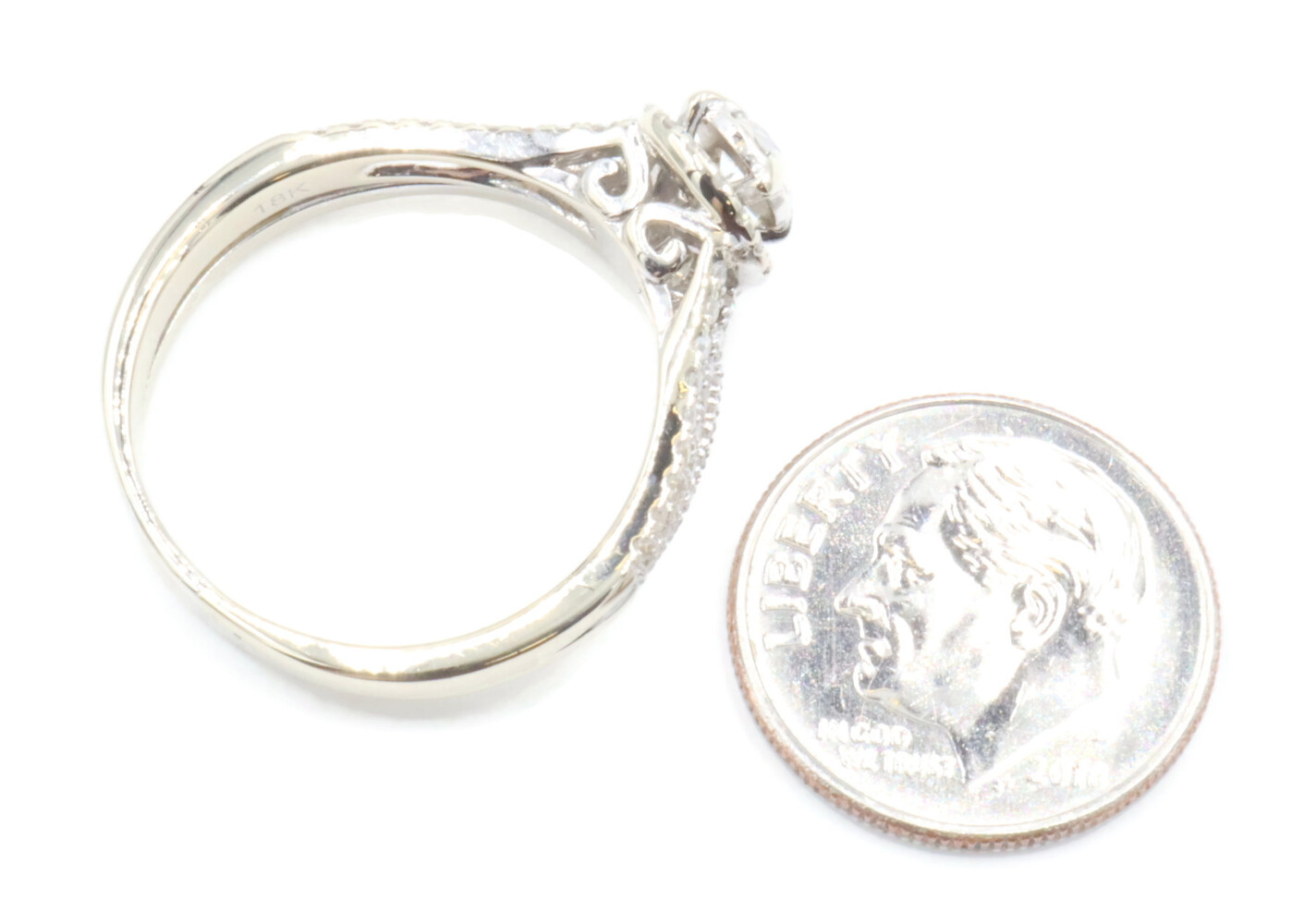 0.85 ctw Round Diamond Halo 18KT & 14KT White Gold Women's Wedding Ring Set. The engagement ring is 18KT white gold and the band ring is 14KT white gold. This ring is a size 9.
