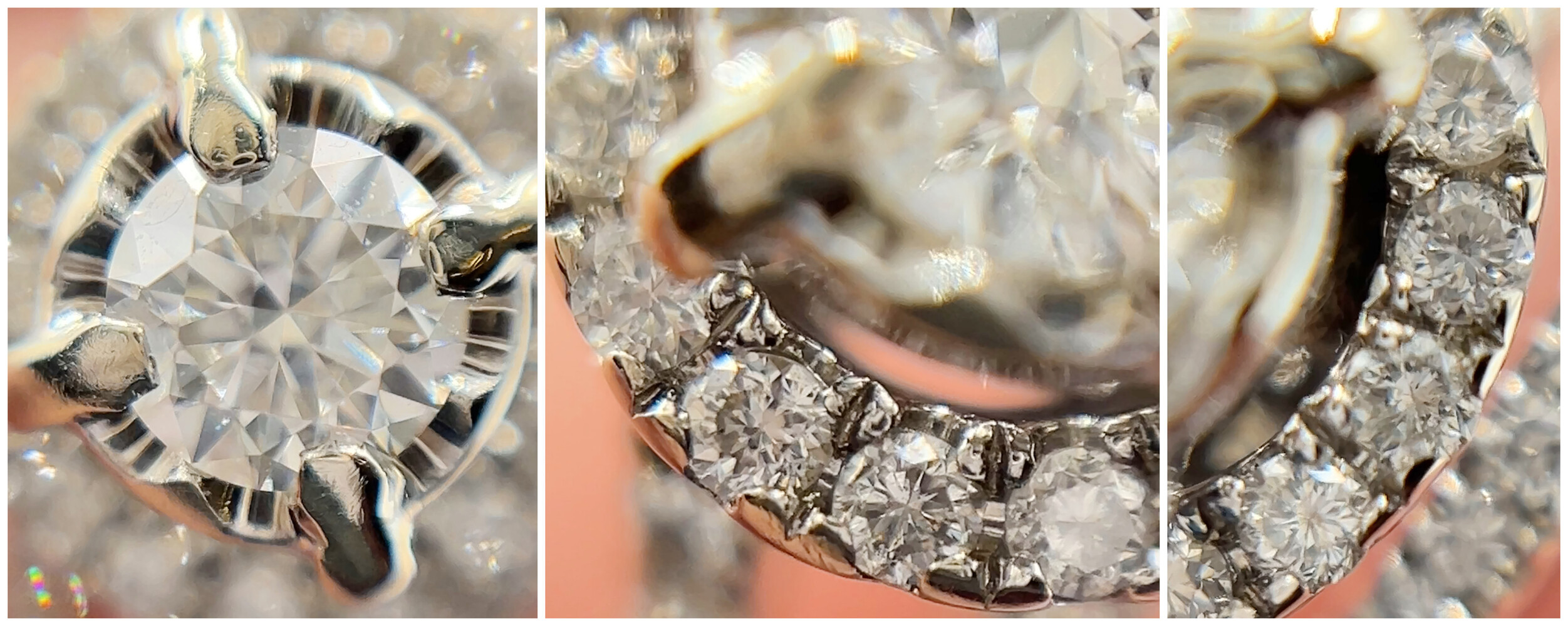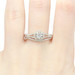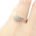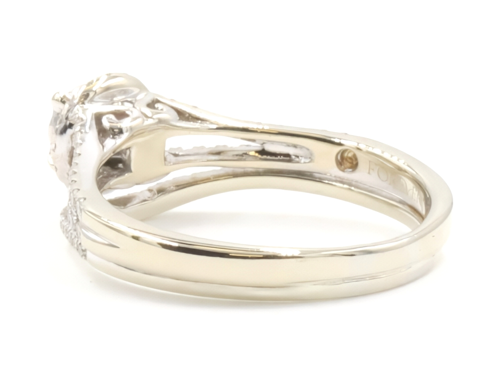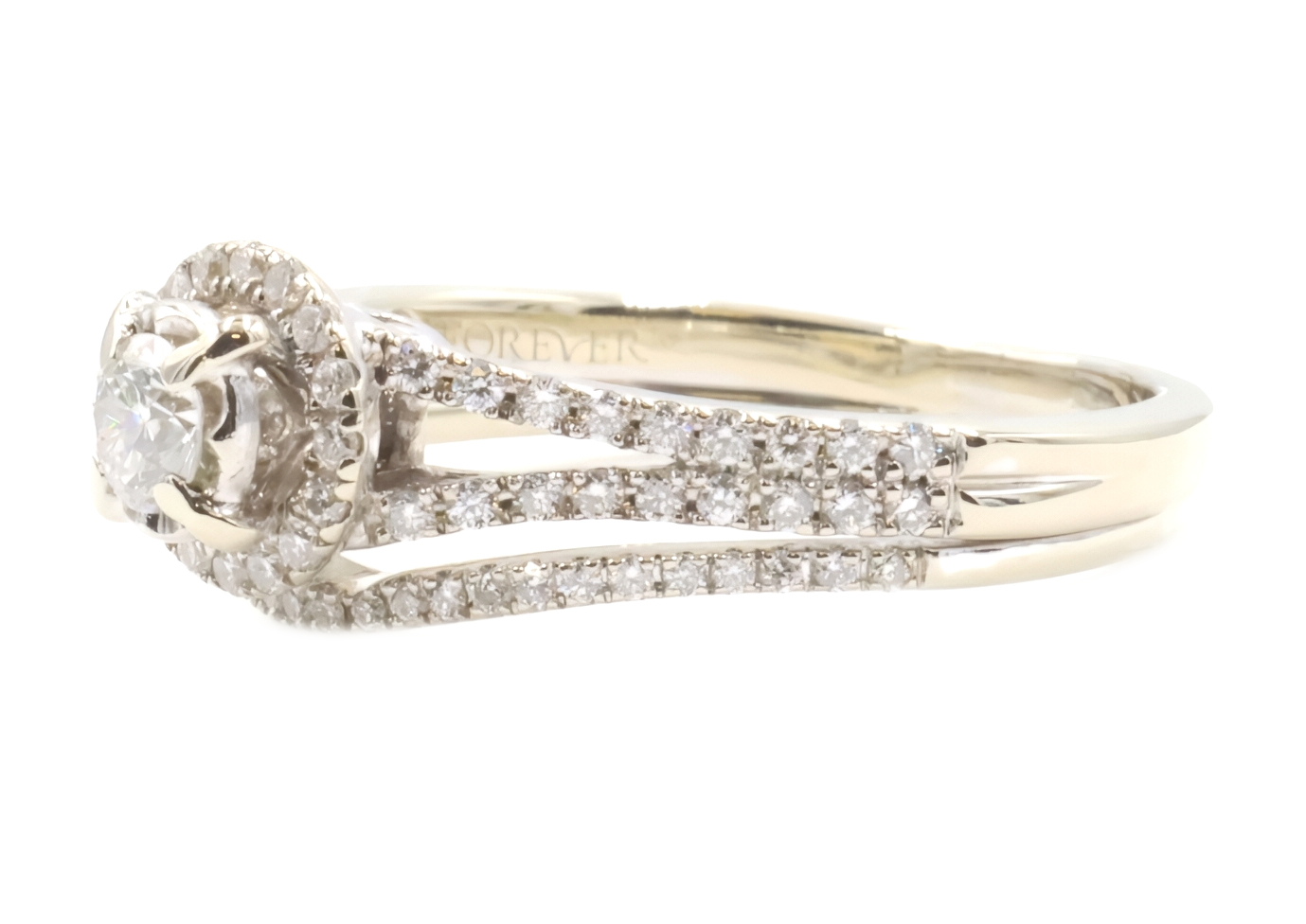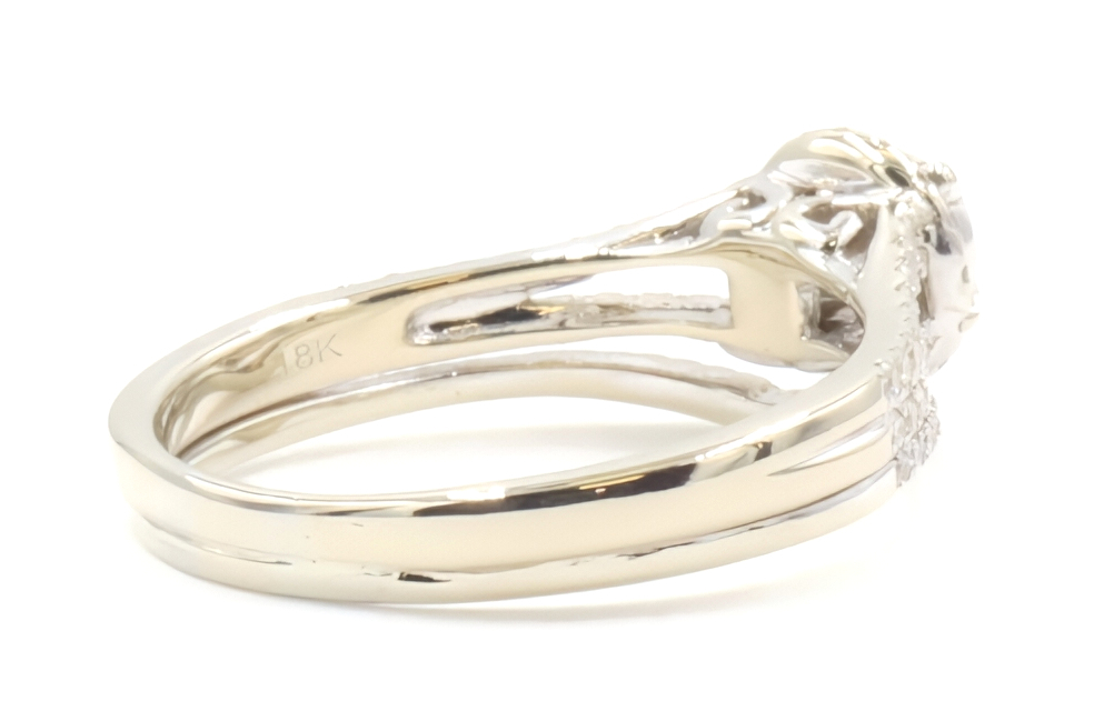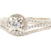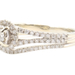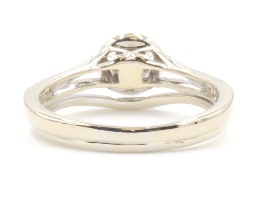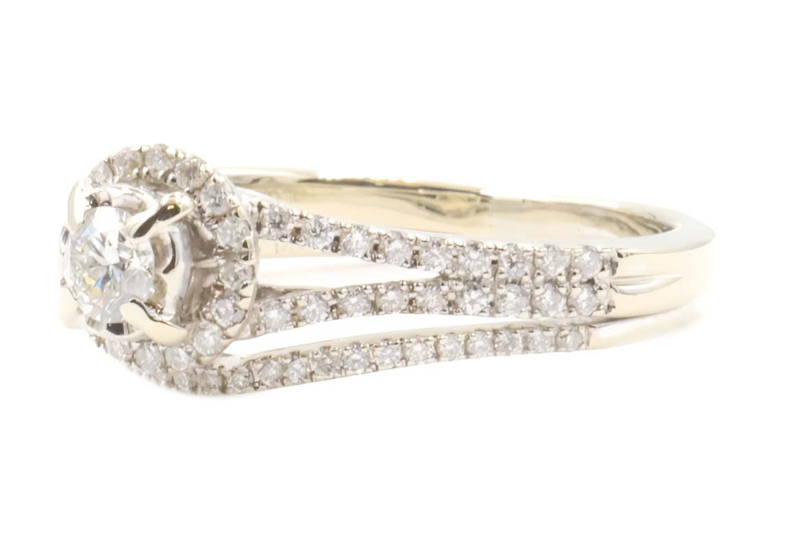 0.85 ctw Round Diamond Halo 18KT & 14KT White Gold Women's Wedding Ring Set. The engagement ring is 18KT white gold and the band ring is 14KT white gold. This ring is a size 9.