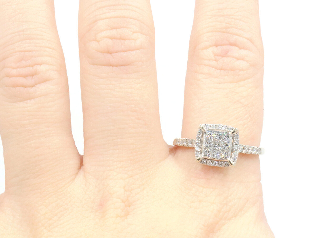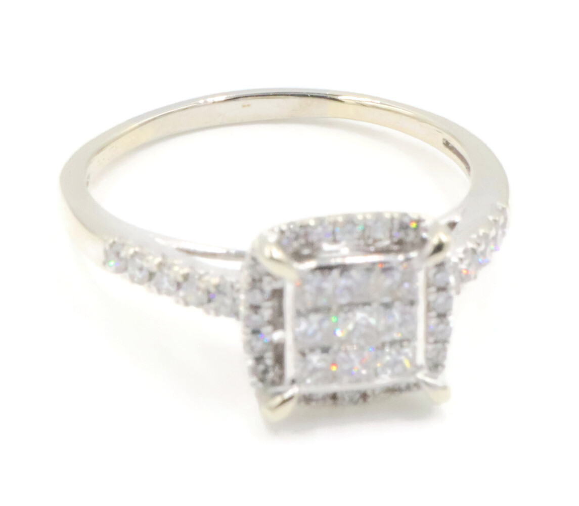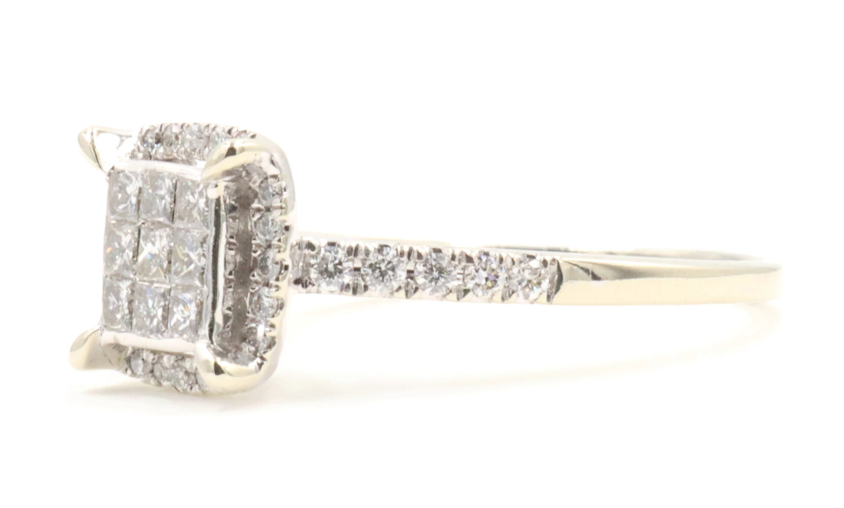 0.94 Ctw Princess & Round Diamond 14KT White Gold Square Halo Engagement Ring. This ring is a size 9 1/4.