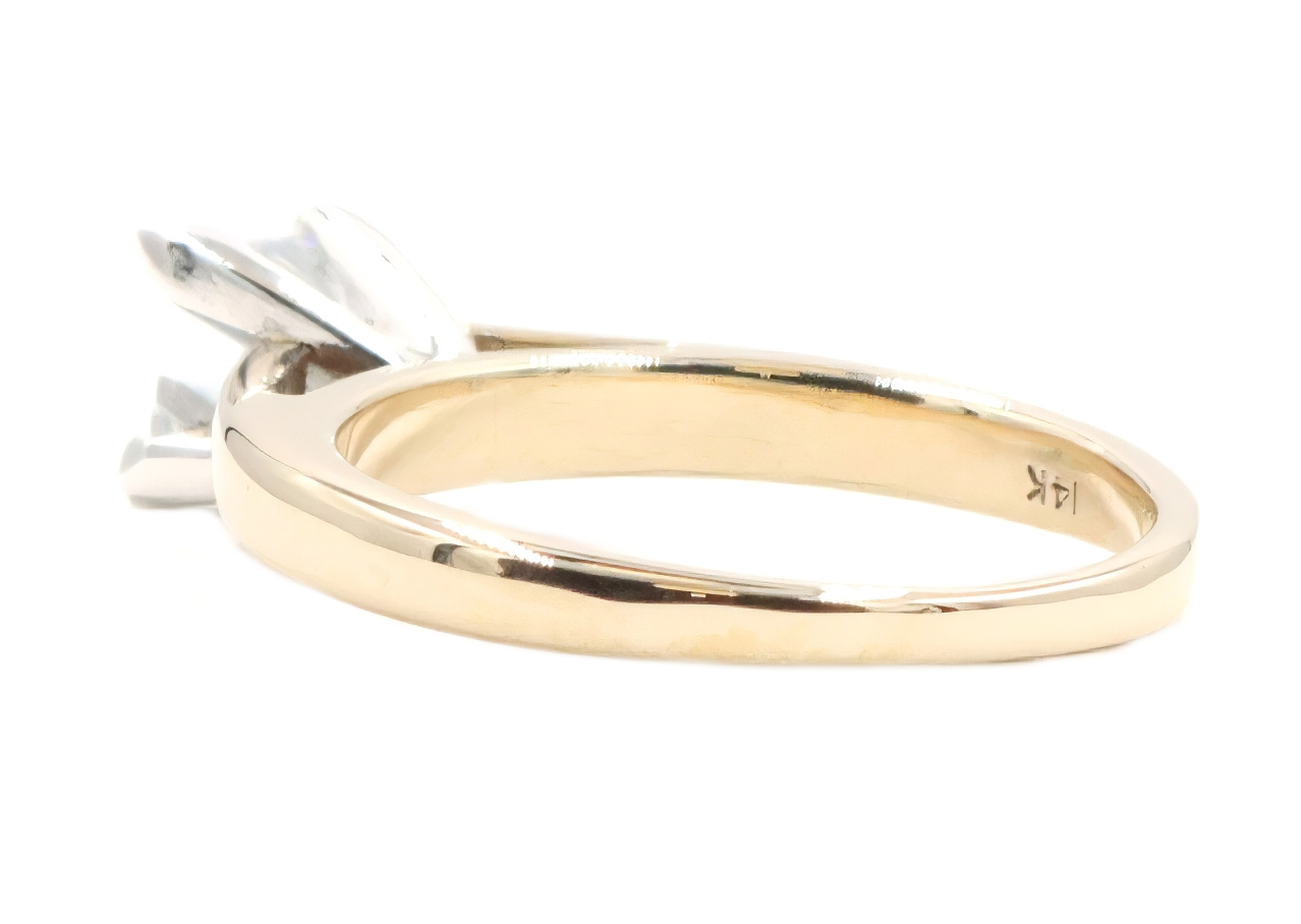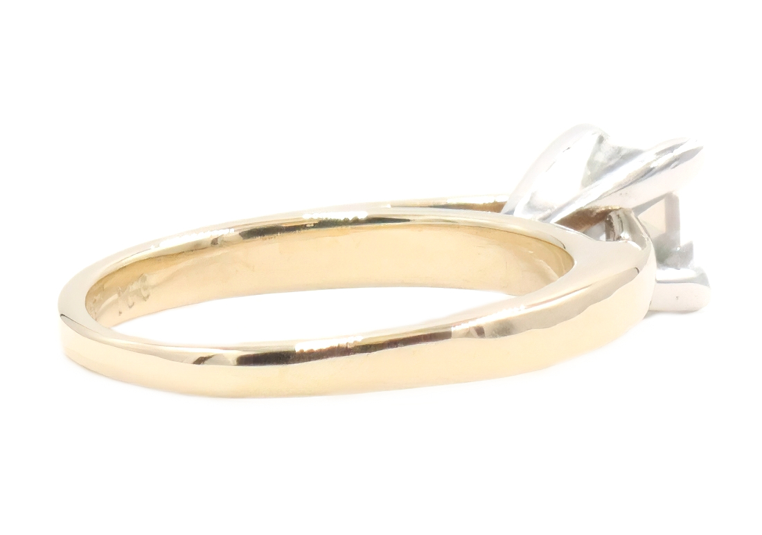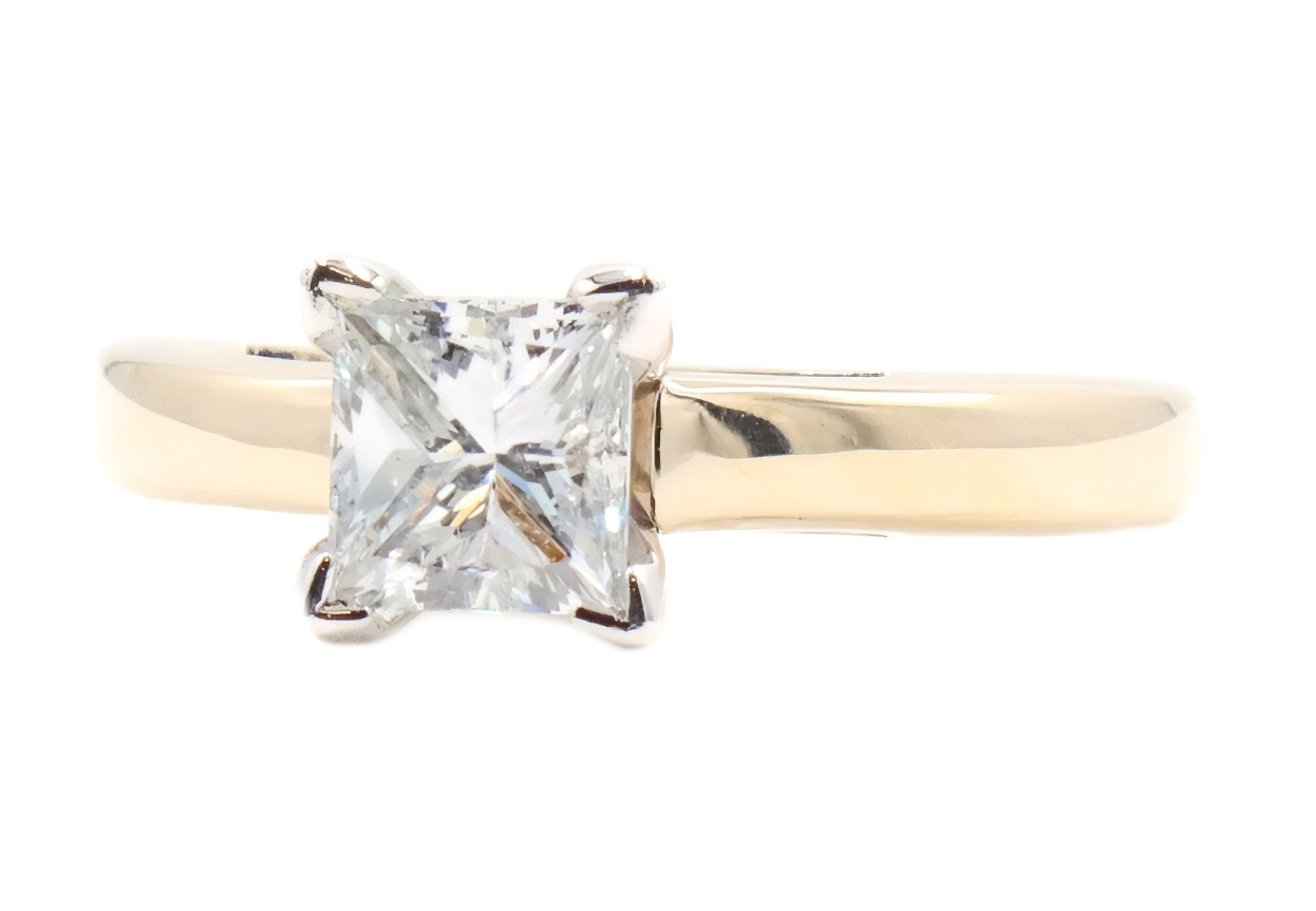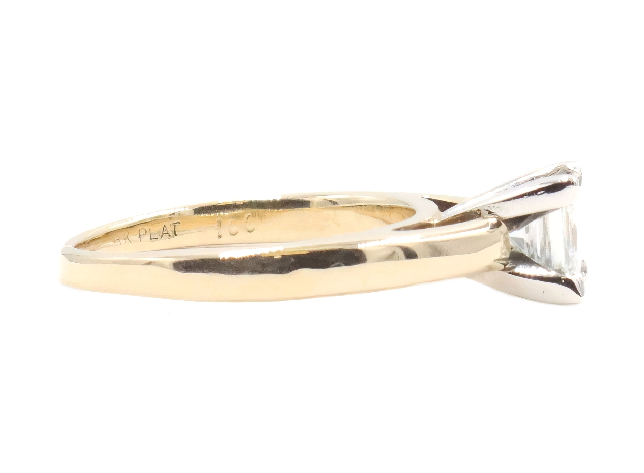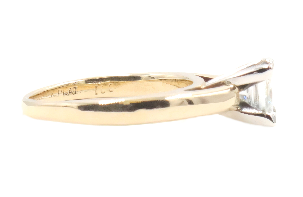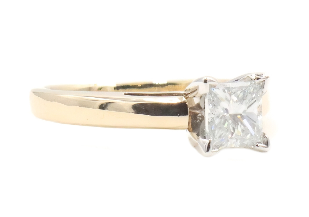 1.00 Ct Solitaire Princess Diamond 14KT Yellow Gold & Platinum Engagement Ring. This ring is a size 7 1/2. Featuring one beautiful princess-cut diamond with a total carat weight of 1.00 ct. This diamond has a clarity of SI1, a color of J, and a good cut. There is an inscription on this diamond that reads "IGI 31698827." This ring has been graded and certified by JAGi.
