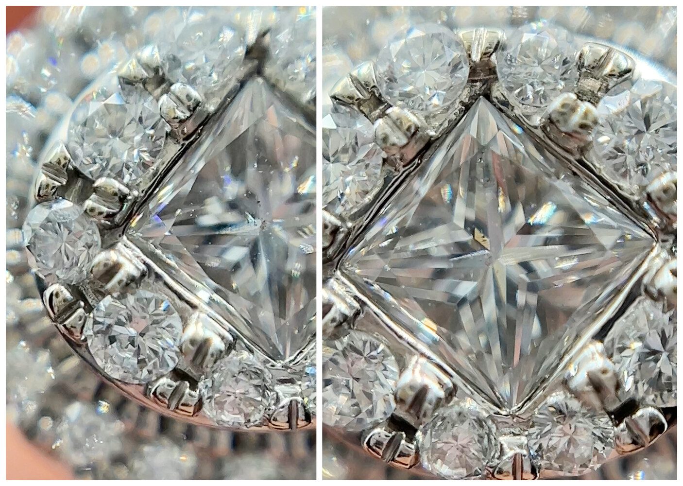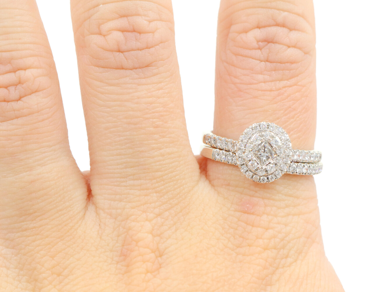 1.22 Ctw Princess & Round Diamond 14KT White Gold Oval Double Halo Wedding Set. Both the engagement ring and the wedding band are a size 10.