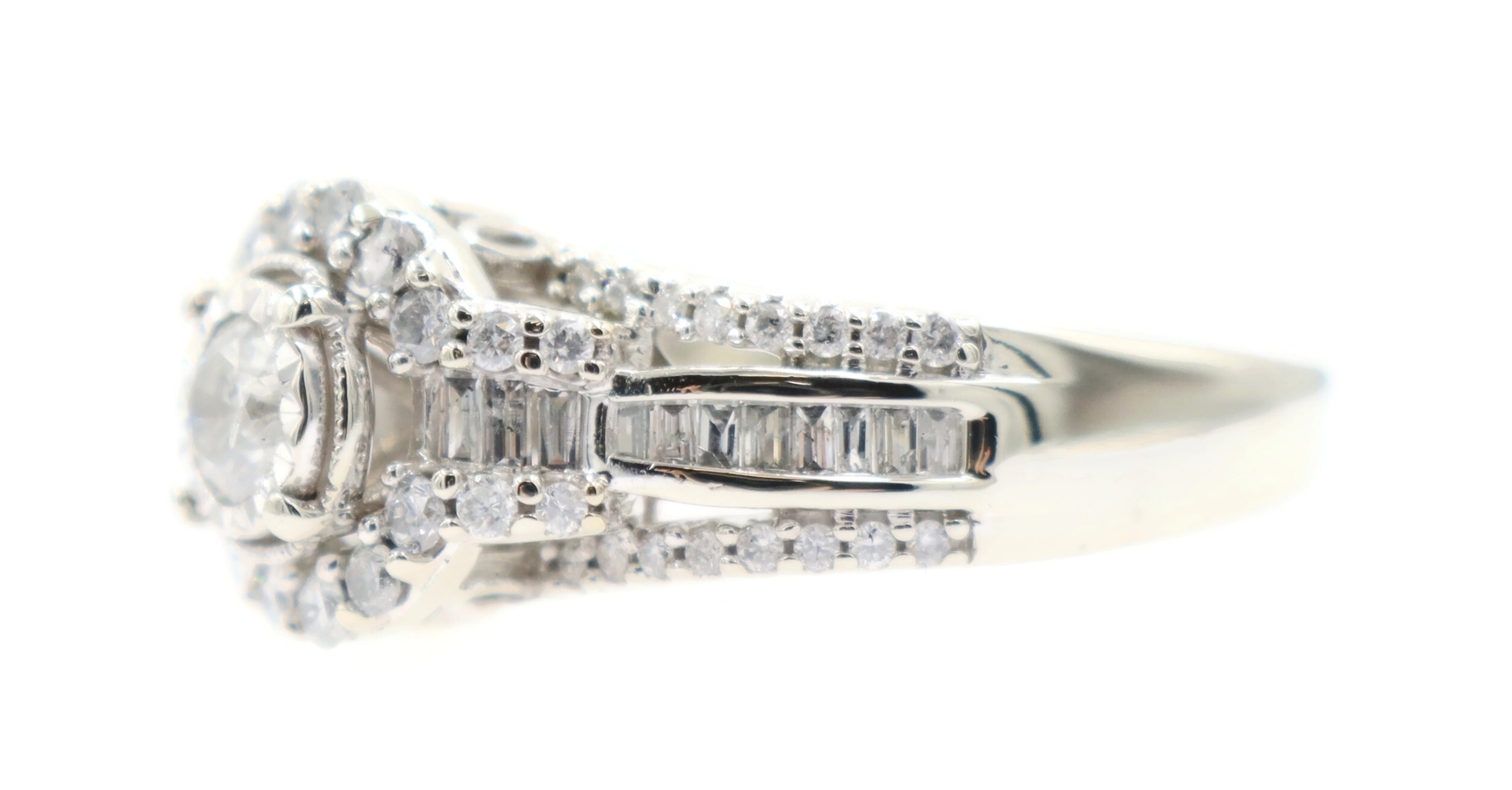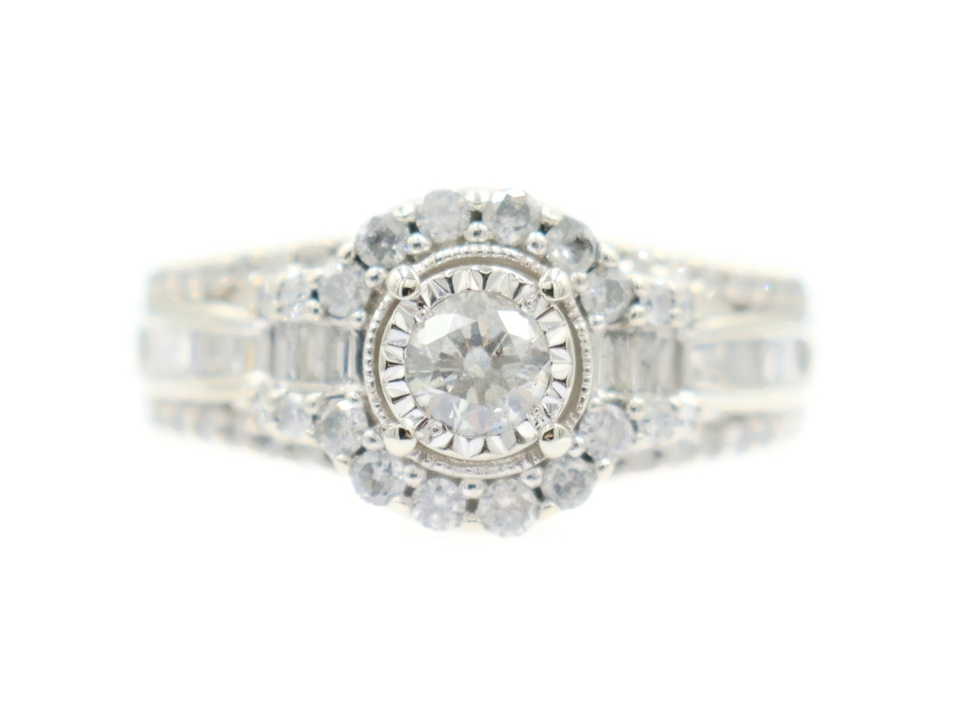 1.30 Ctw Round & Baguette Diamond 10KT White Gold Halo Engagement Ring 5.8g ZEI. This ring is a size 9.