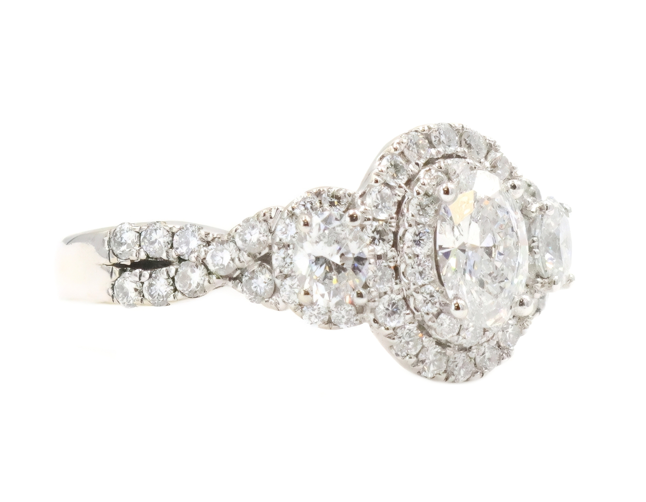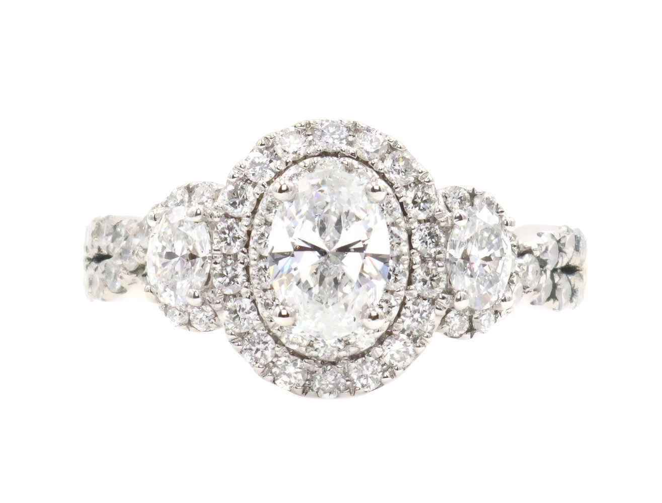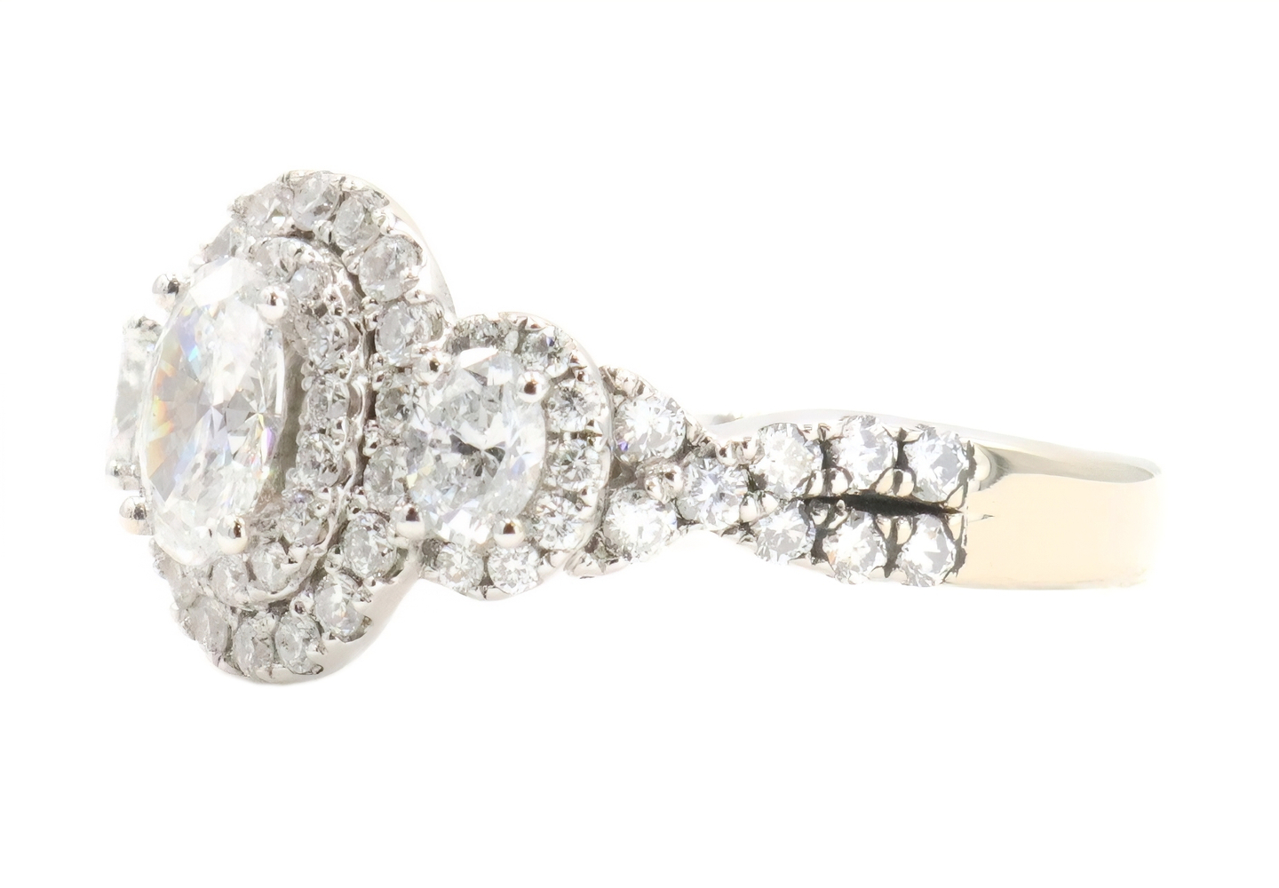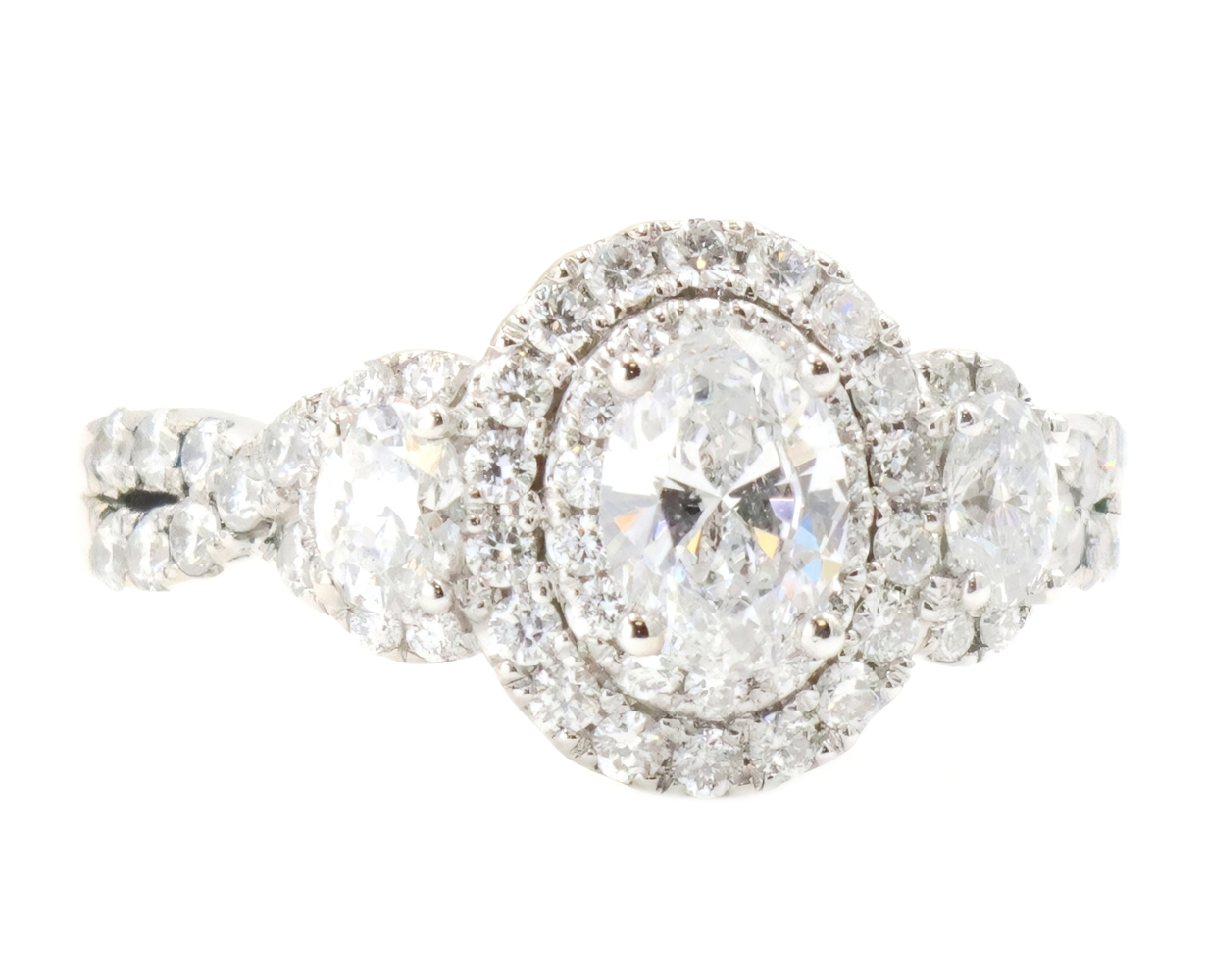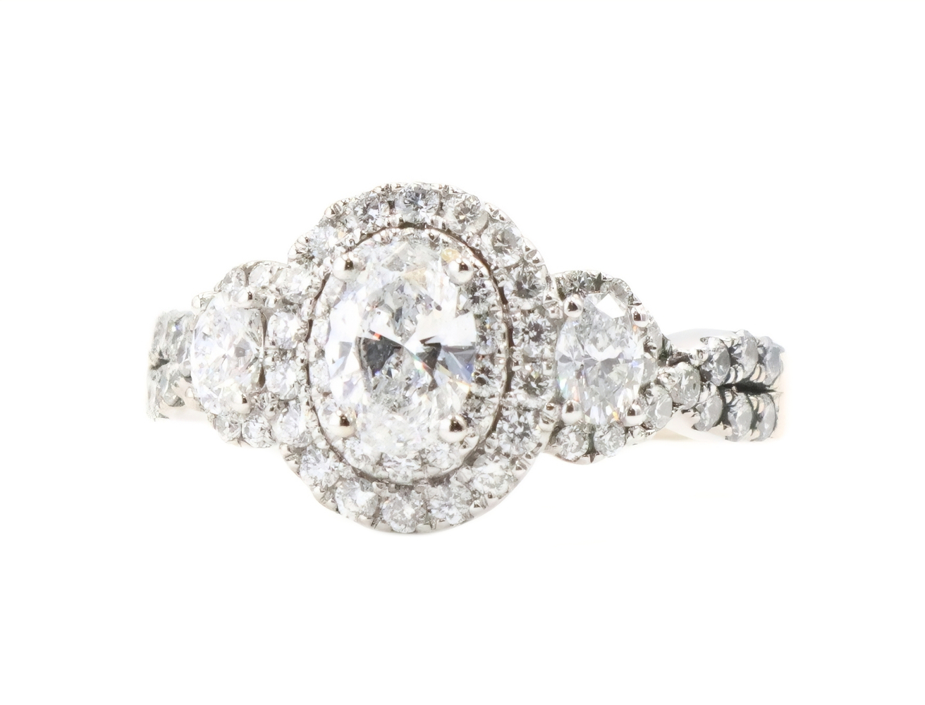1.60 cttw Oval & Round Cut Diamond Past, Present, Future 14KT White Gold Ring. This ring is a size 7 3/4. Featuring one stunning oval cut diamond in the center of the ring with a carat weight of 0.67 ct. This diamond has a SI2 clarity with a G color. This engagement ring also features an additional 2 oval cut diamonds and 66 round brilliant cut diamonds with a total approximate carat weight of 0.93 cttw. These diamonds have a clarity range of VS2 t SI2 with a a color range of G to H.
