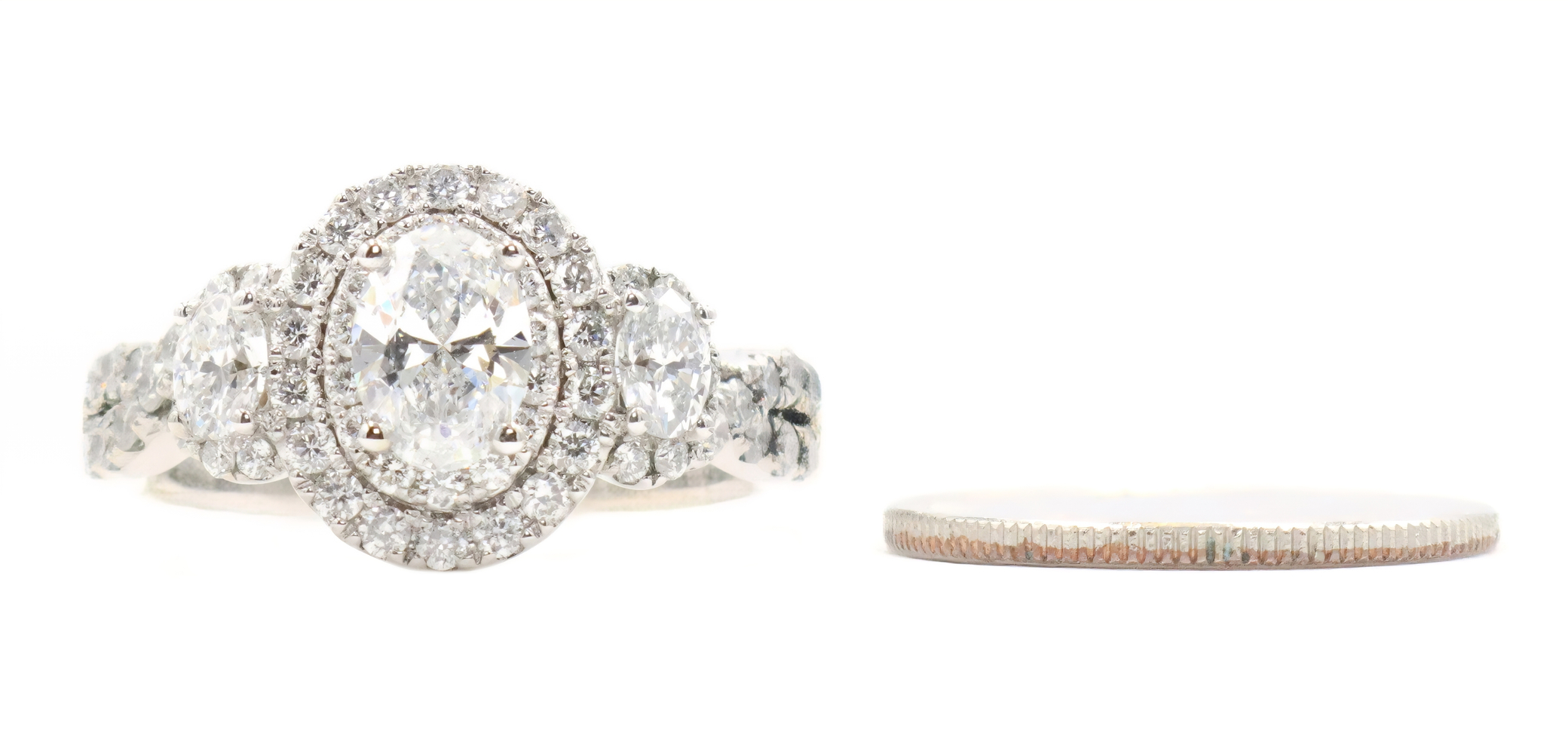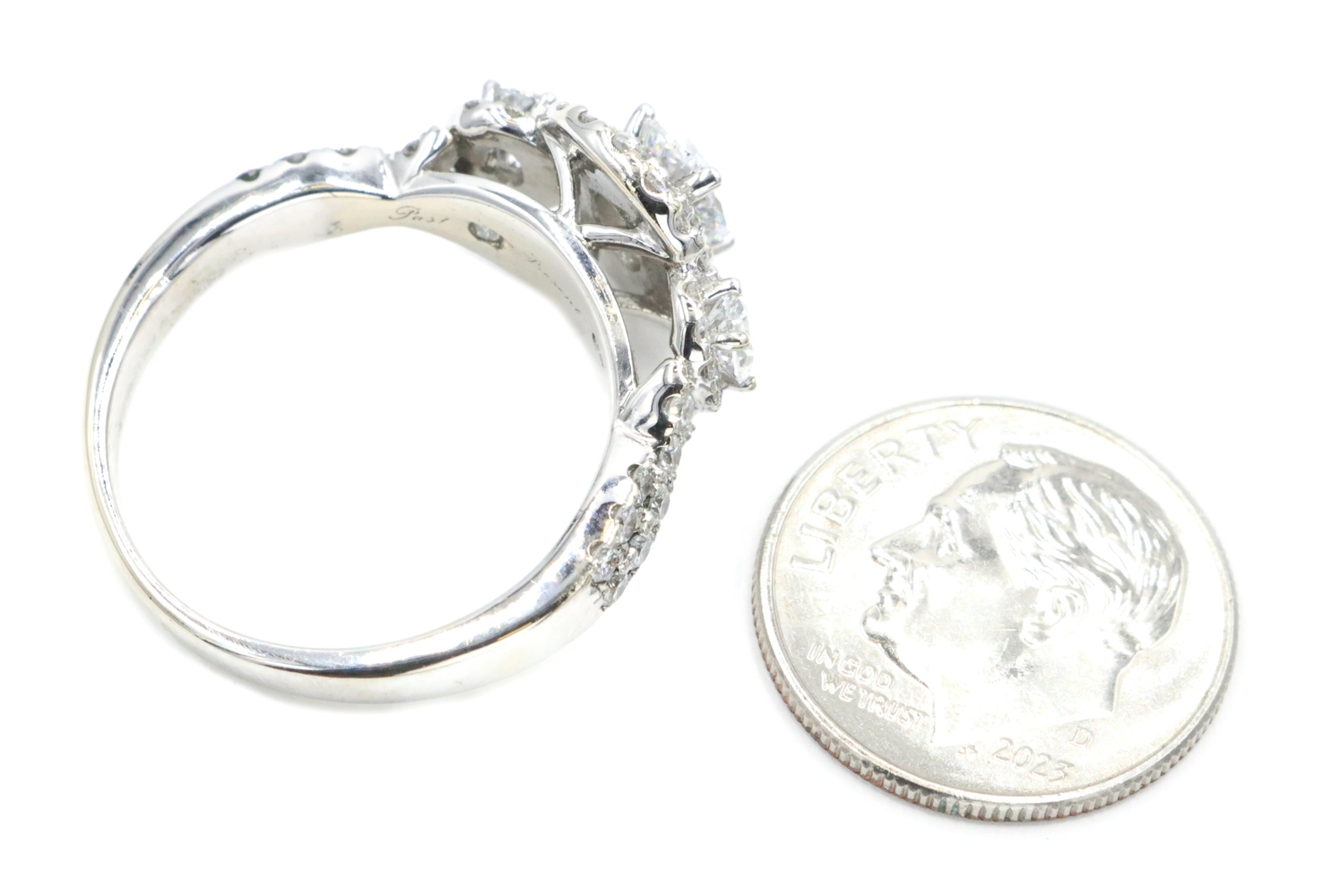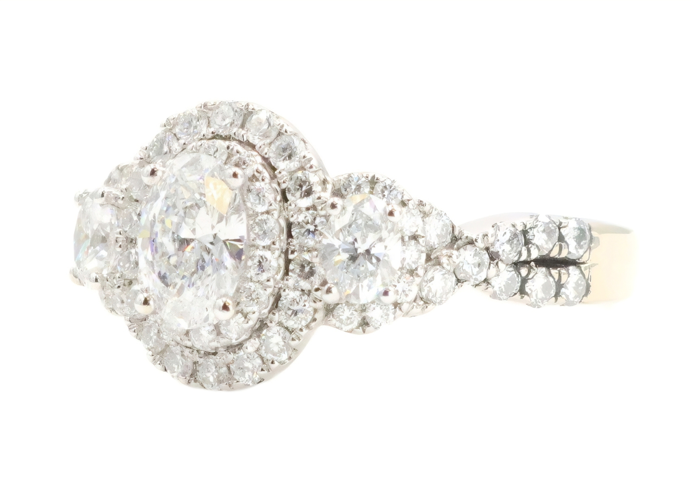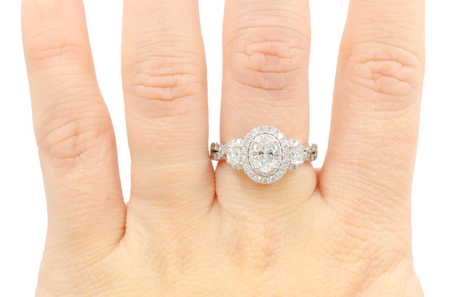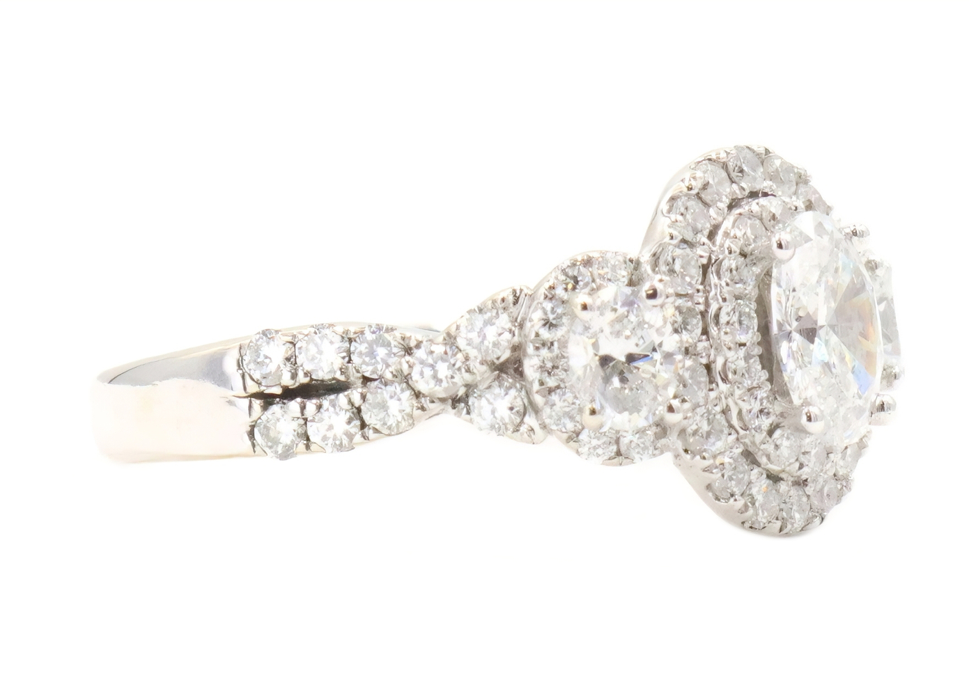 1.60 cttw Oval & Round Cut Diamond Past, Present, Future 14KT White Gold Ring. This ring is a size 7 3/4. Featuring one stunning oval cut diamond in the center of the ring with a carat weight of 0.67 ct. This diamond has a SI2 clarity with a G color. This engagement ring also features an additional 2 oval cut diamonds and 66 round brilliant cut diamonds with a total approximate carat weight of 0.93 cttw. These diamonds have a clarity range of VS2 t SI2 with a a color range of G to H.