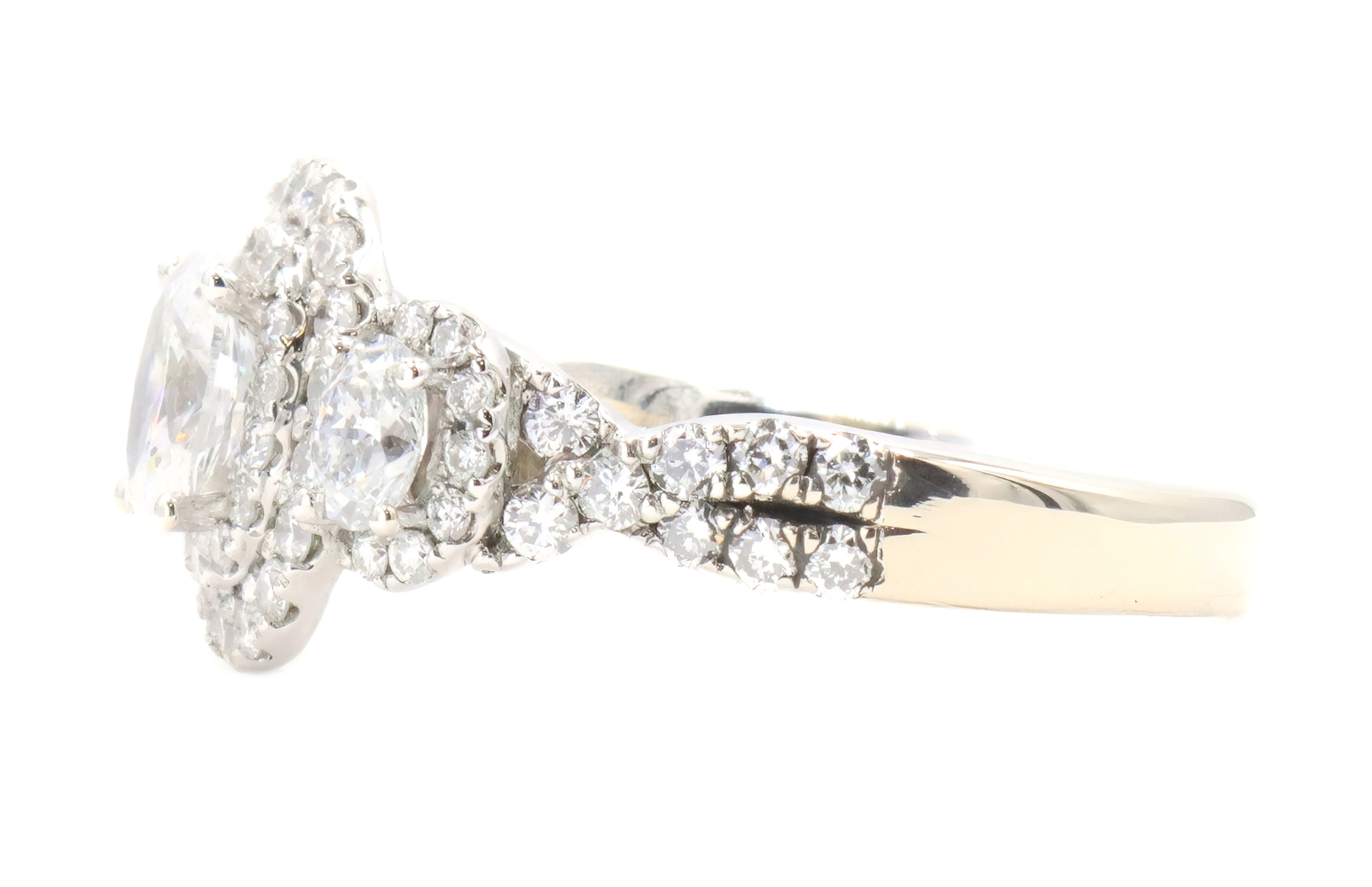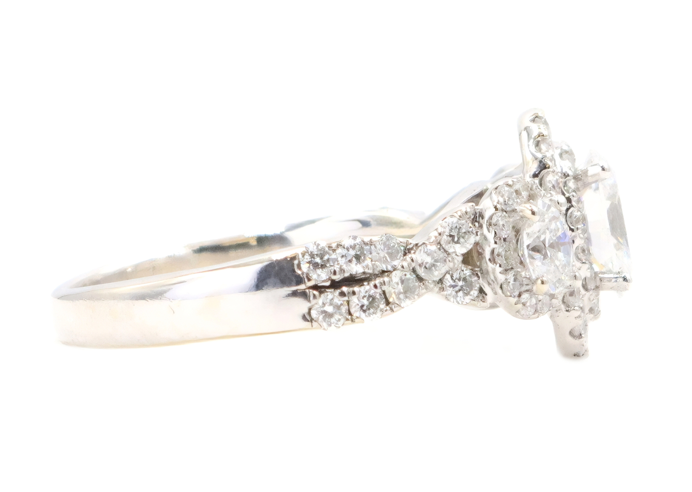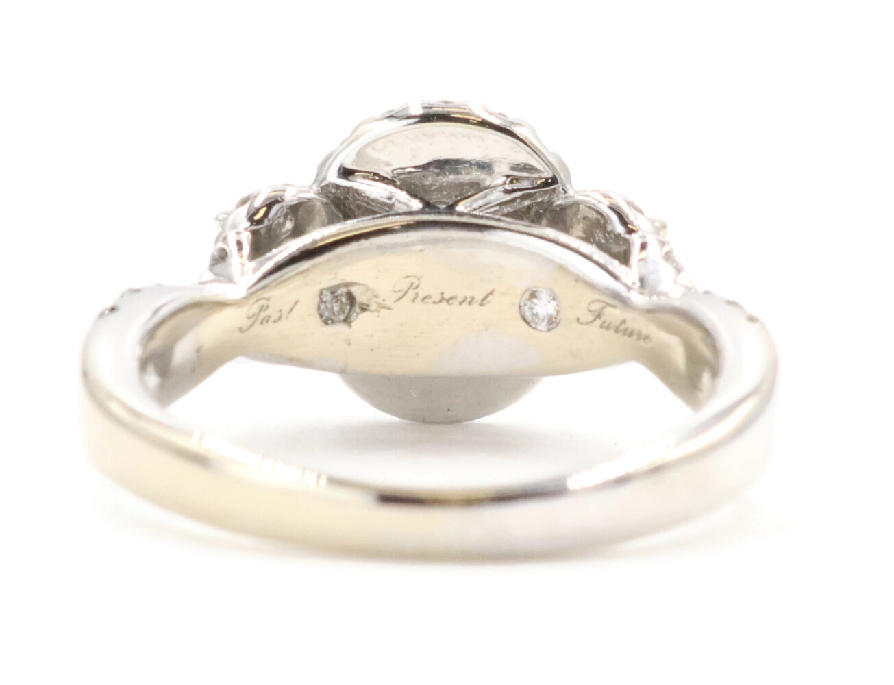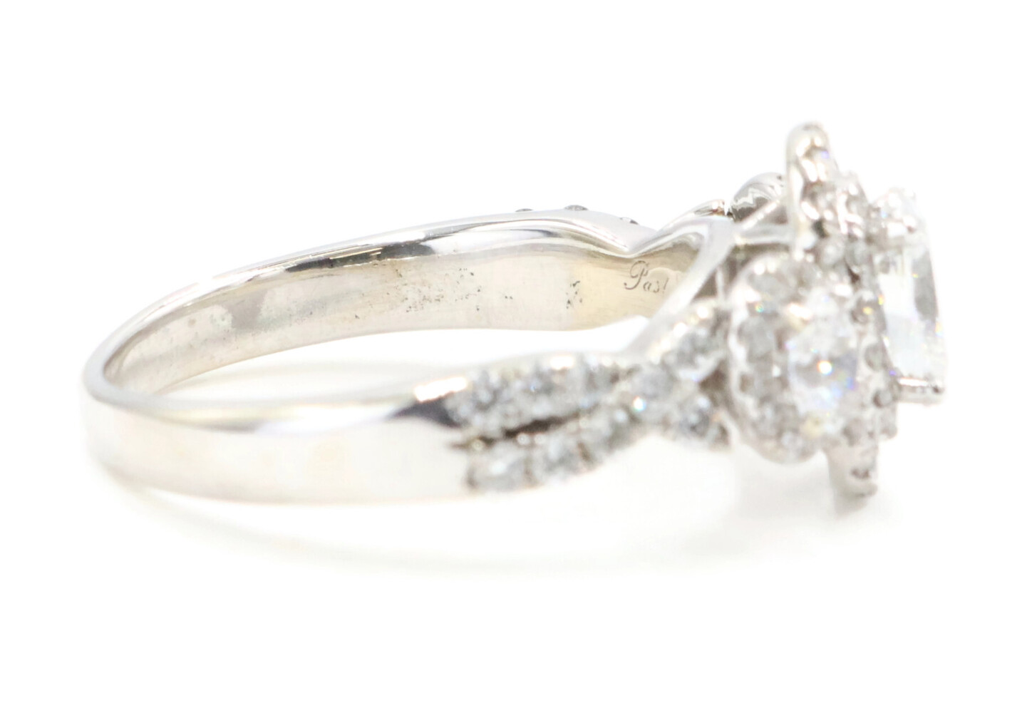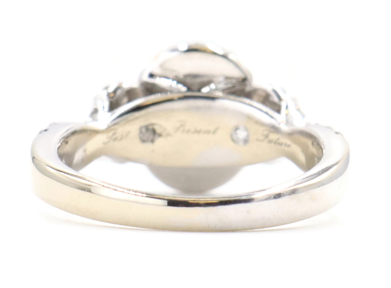 1.60 cttw Oval & Round Cut Diamond Past, Present, Future 14KT White Gold Ring. This ring is a size 7 3/4. Featuring one stunning oval cut diamond in the center of the ring with a carat weight of 0.67 ct. This diamond has a SI2 clarity with a G color. This engagement ring also features an additional 2 oval cut diamonds and 66 round brilliant cut diamonds with a total approximate carat weight of 0.93 cttw. These diamonds have a clarity range of VS2 t SI2 with a a color range of G to H.