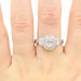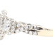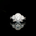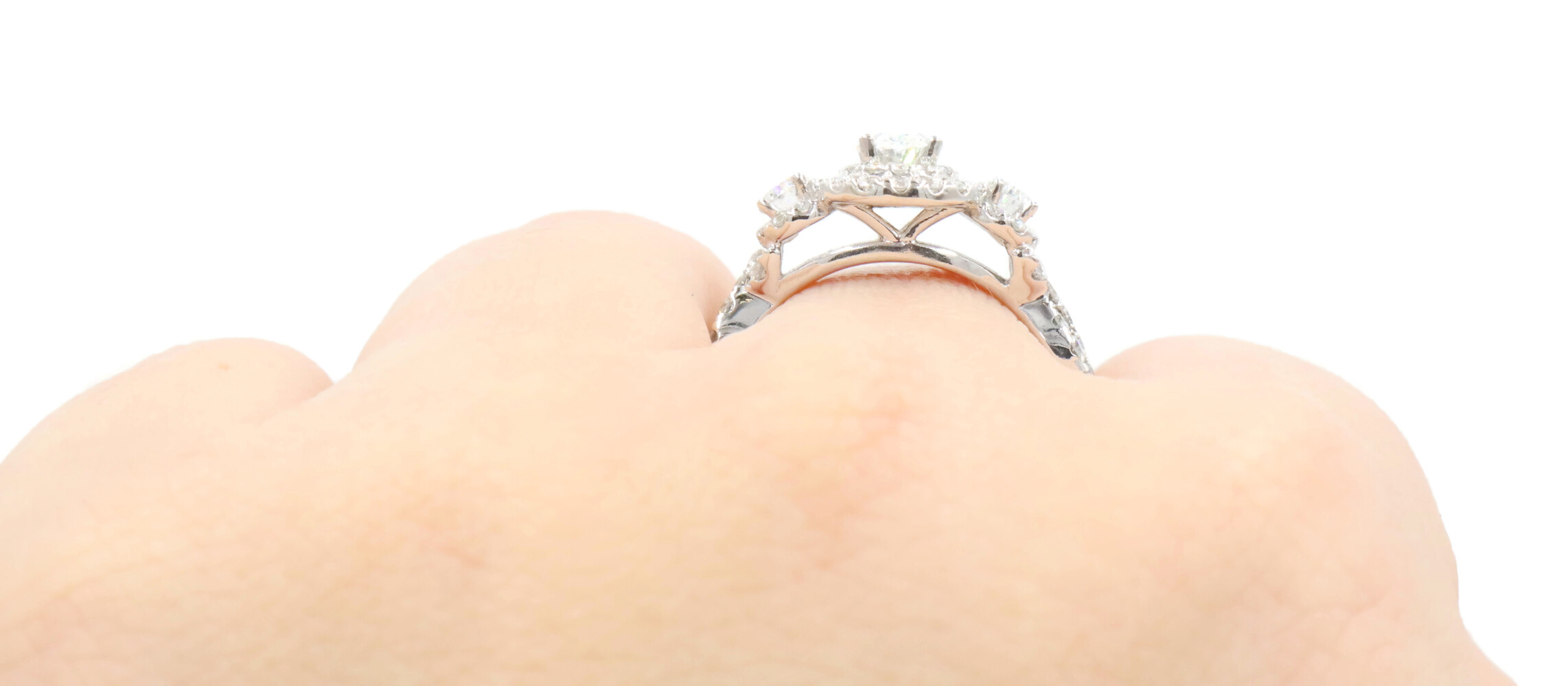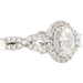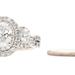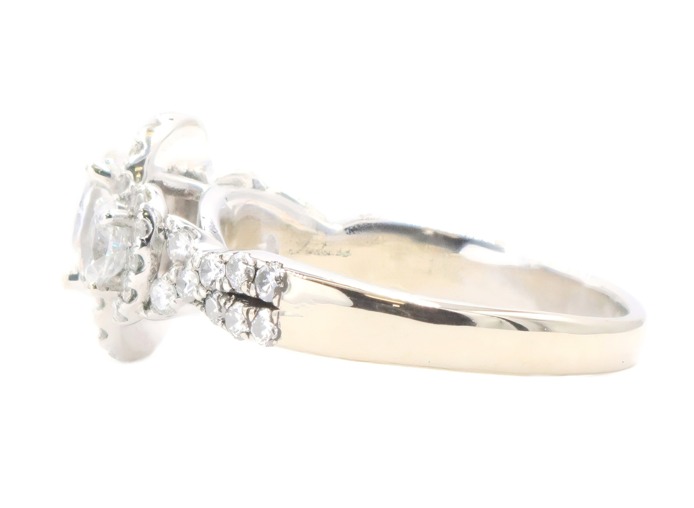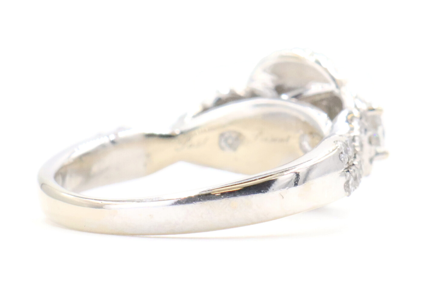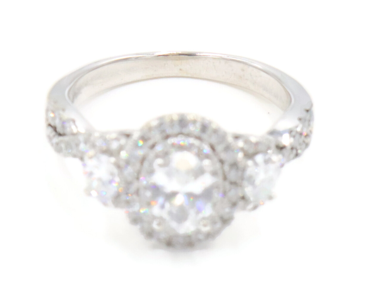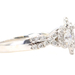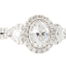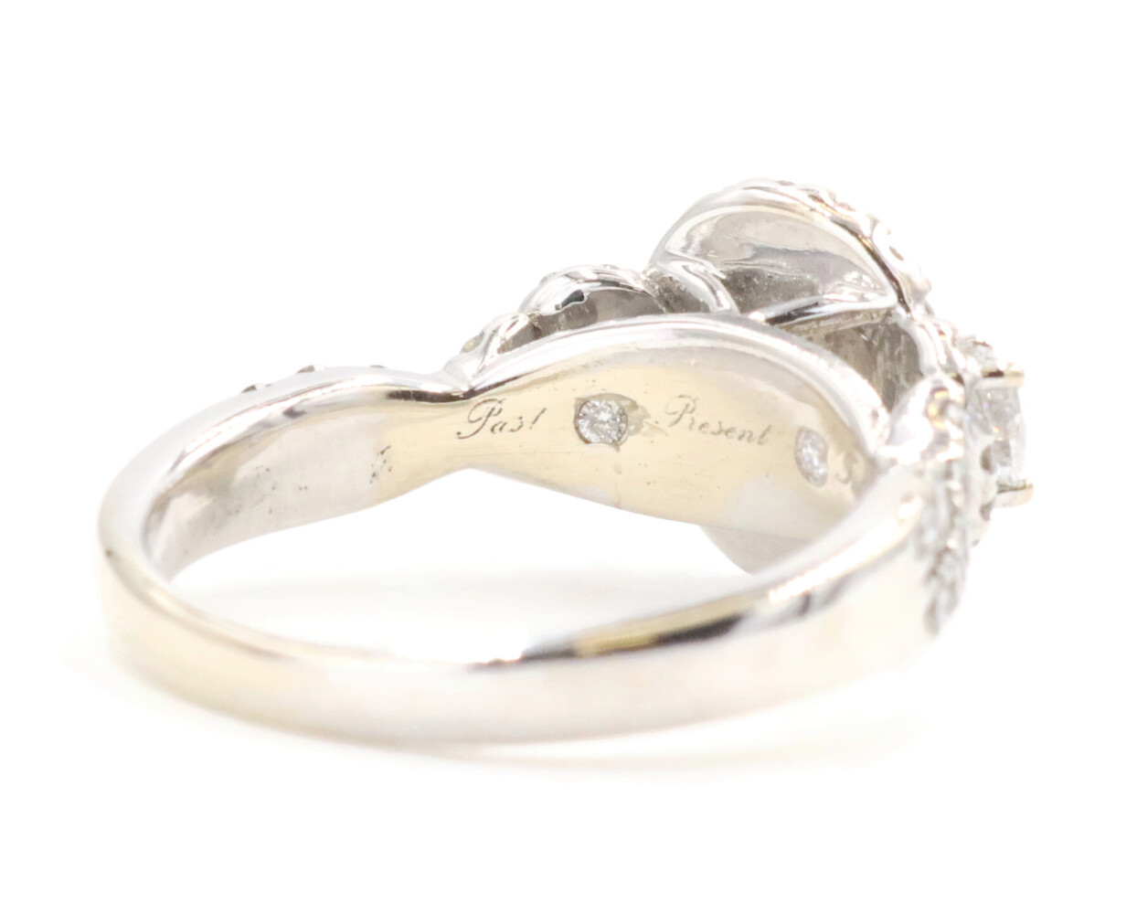 1.60 cttw Oval & Round Cut Diamond Past, Present, Future 14KT White Gold Ring. This ring is a size 7 3/4. Featuring one stunning oval cut diamond in the center of the ring with a carat weight of 0.67 ct. This diamond has a SI2 clarity with a G color. This engagement ring also features an additional 2 oval cut diamonds and 66 round brilliant cut diamonds with a total approximate carat weight of 0.93 cttw. These diamonds have a clarity range of VS2 t SI2 with a a color range of G to H.