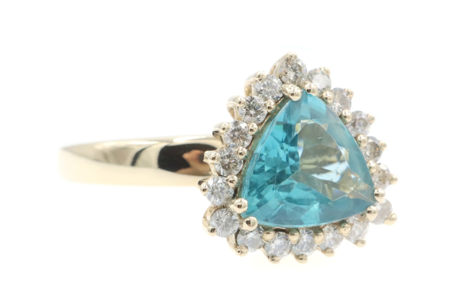 1.80 Ctw Trilliant Blue Topaz & Round Diamond Halo 14KT Yellow Gold Ring 6.51g. This ring is a size 7 3/4.
