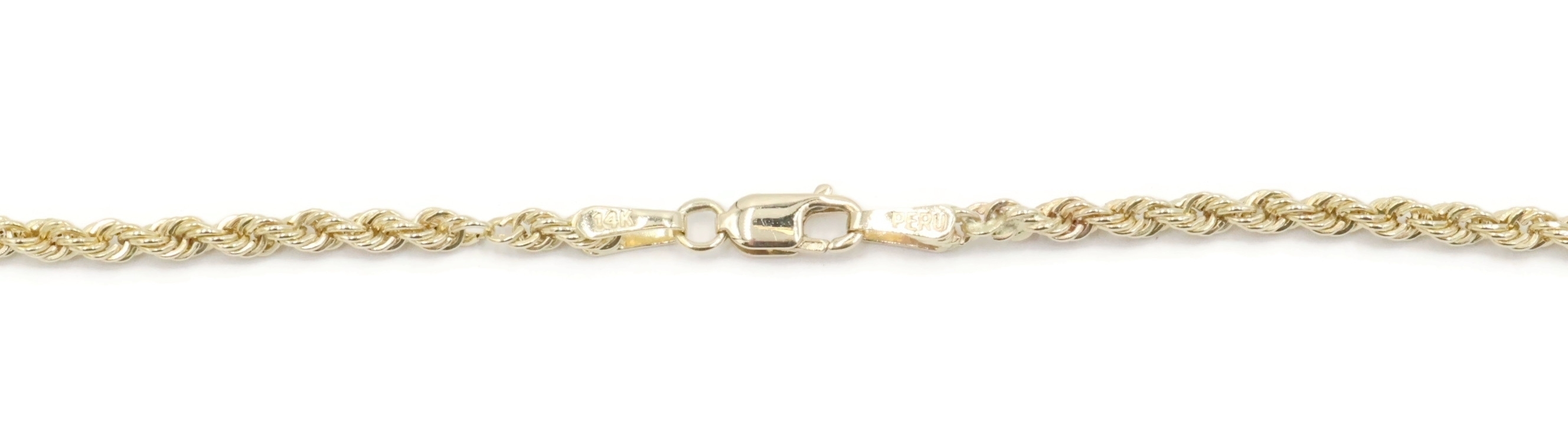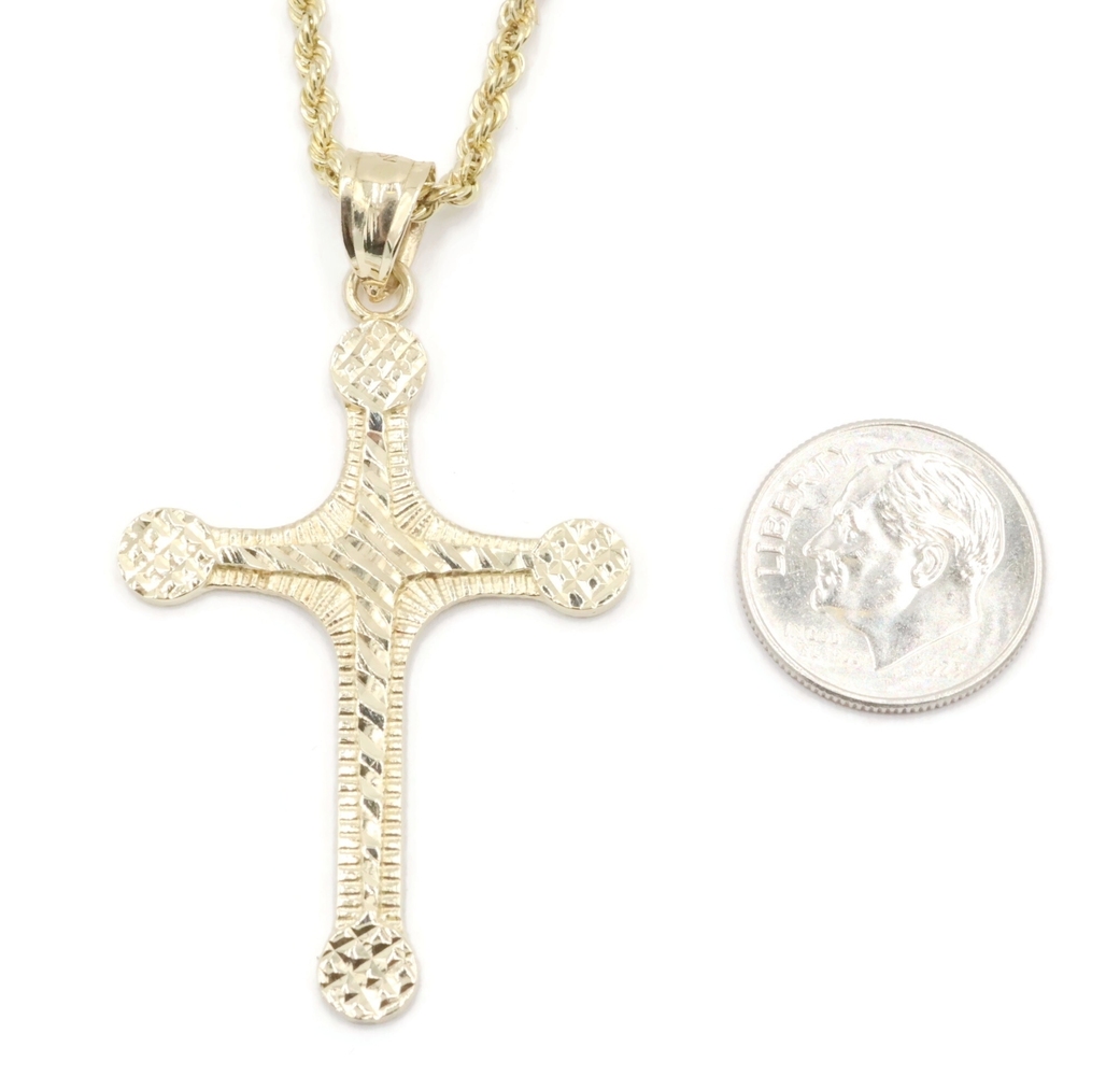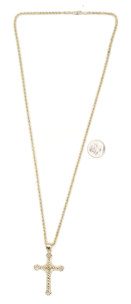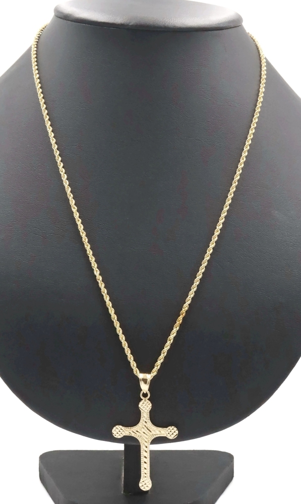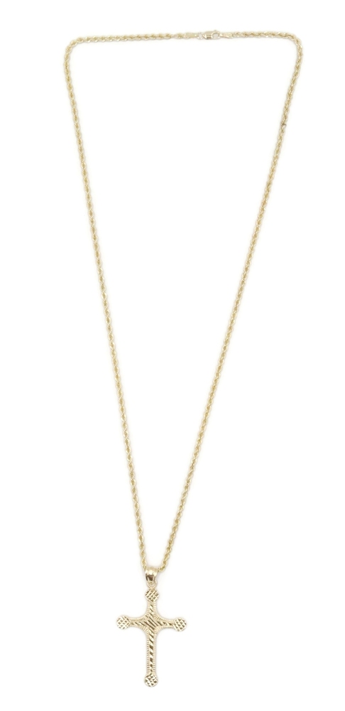 10KT Yellow Gold Diamond Cut Cross Pendant on 23" 14KT Gold Rope Chain Necklace. The cross pendant is 10KT yellow gold and the rope chain is 14KT yellow gold.