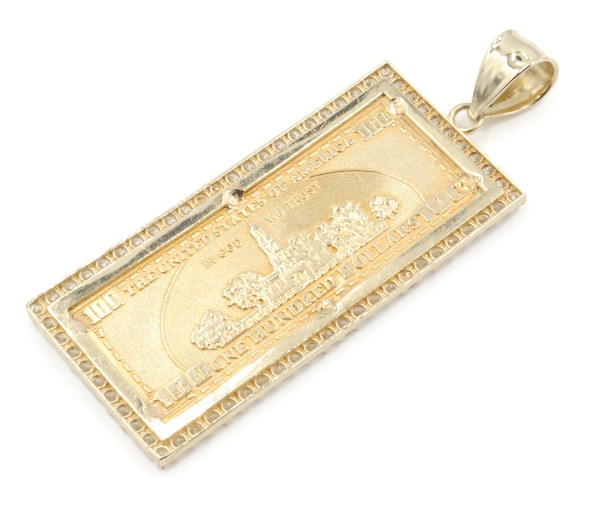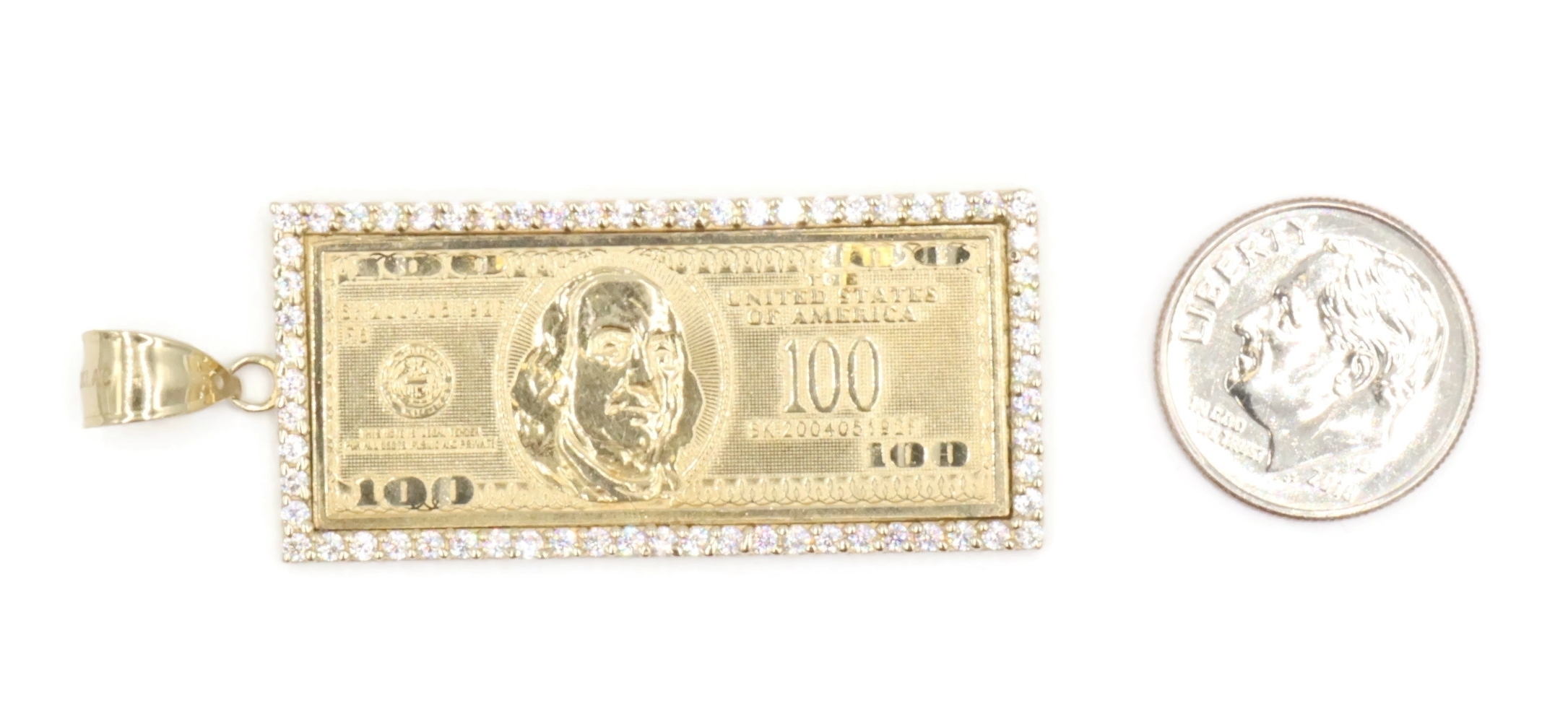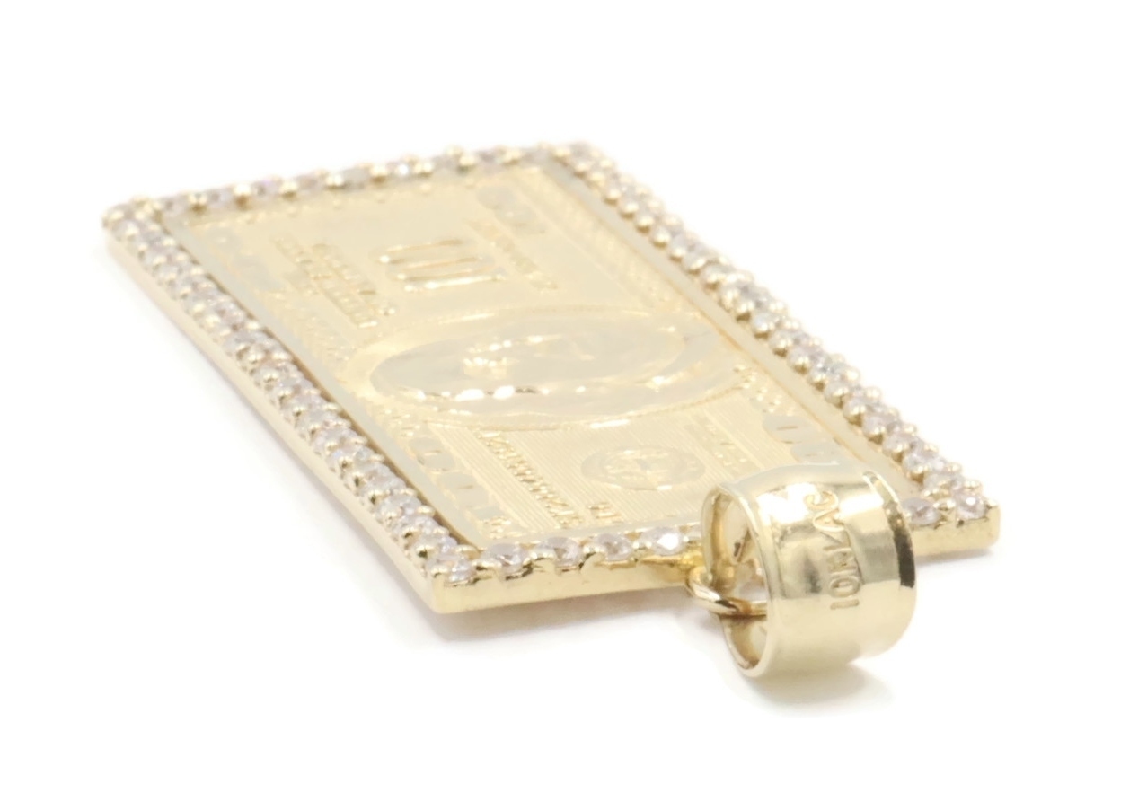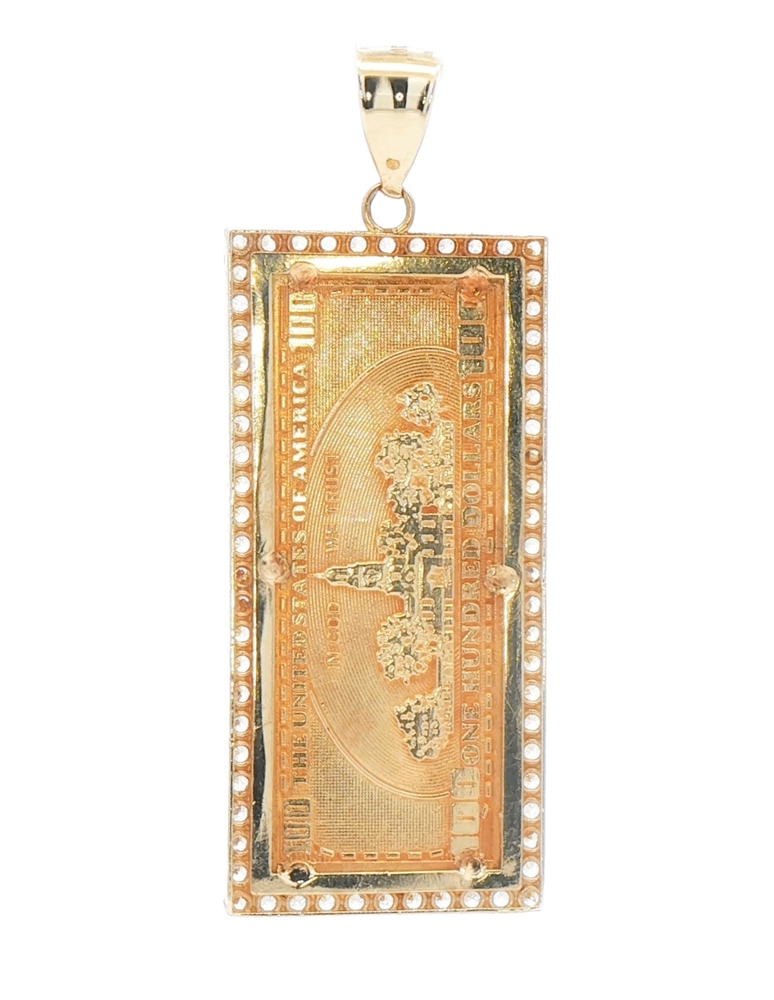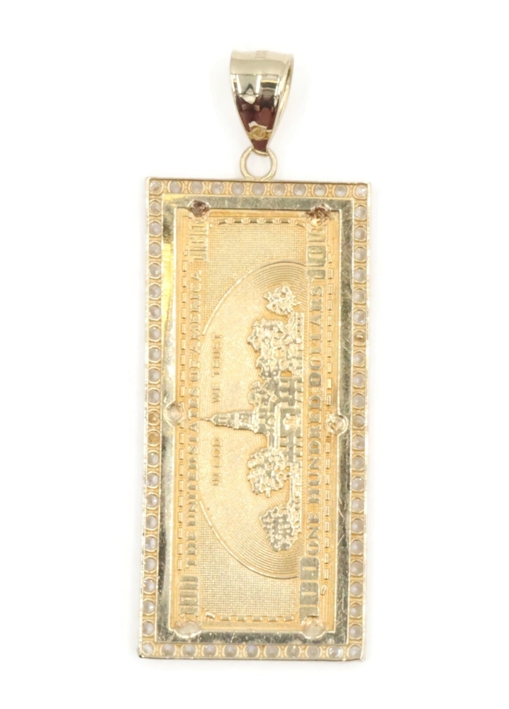 10KT Yellow Gold Hundred Dollar Style Benjamin Bill One Round CZ 2.1" Pendant 7g | USA Pawn