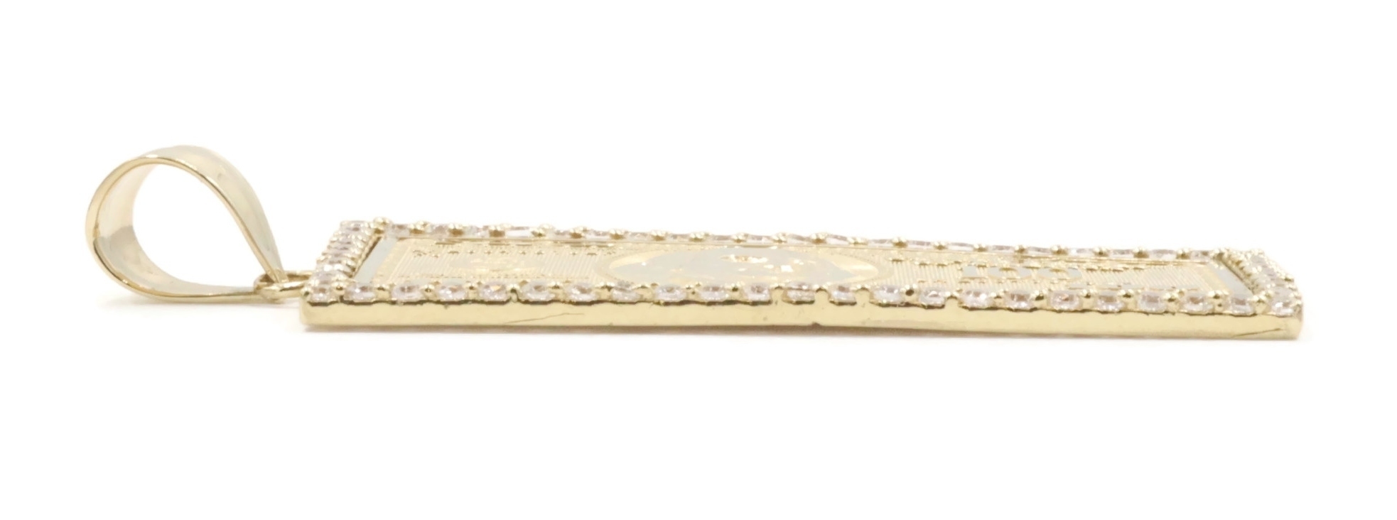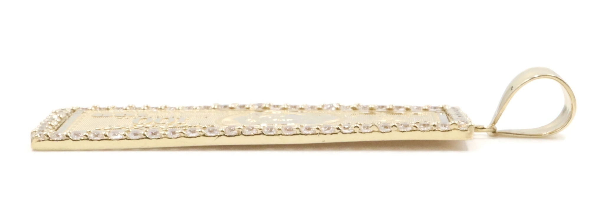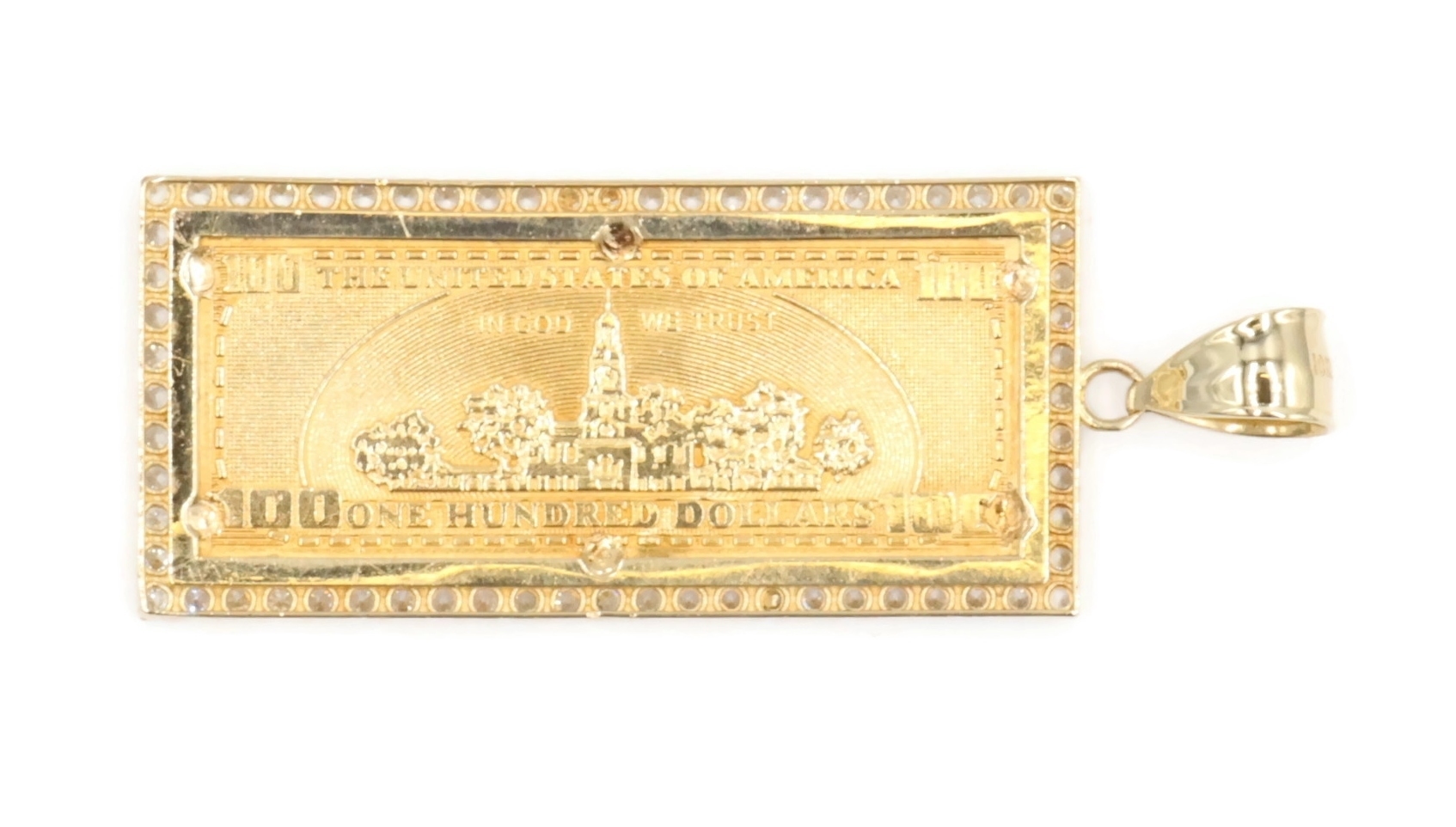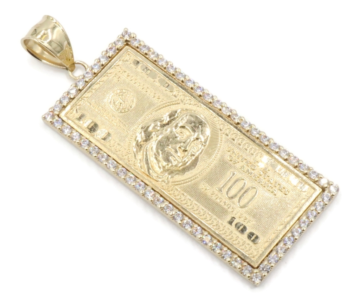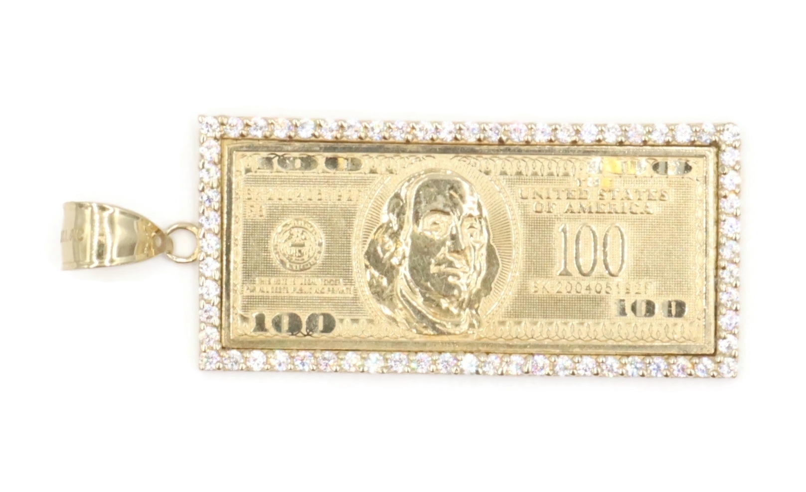 10KT Yellow Gold Hundred Dollar Style Benjamin Bill One Round CZ 2.1" Pendant 7g | USA Pawn