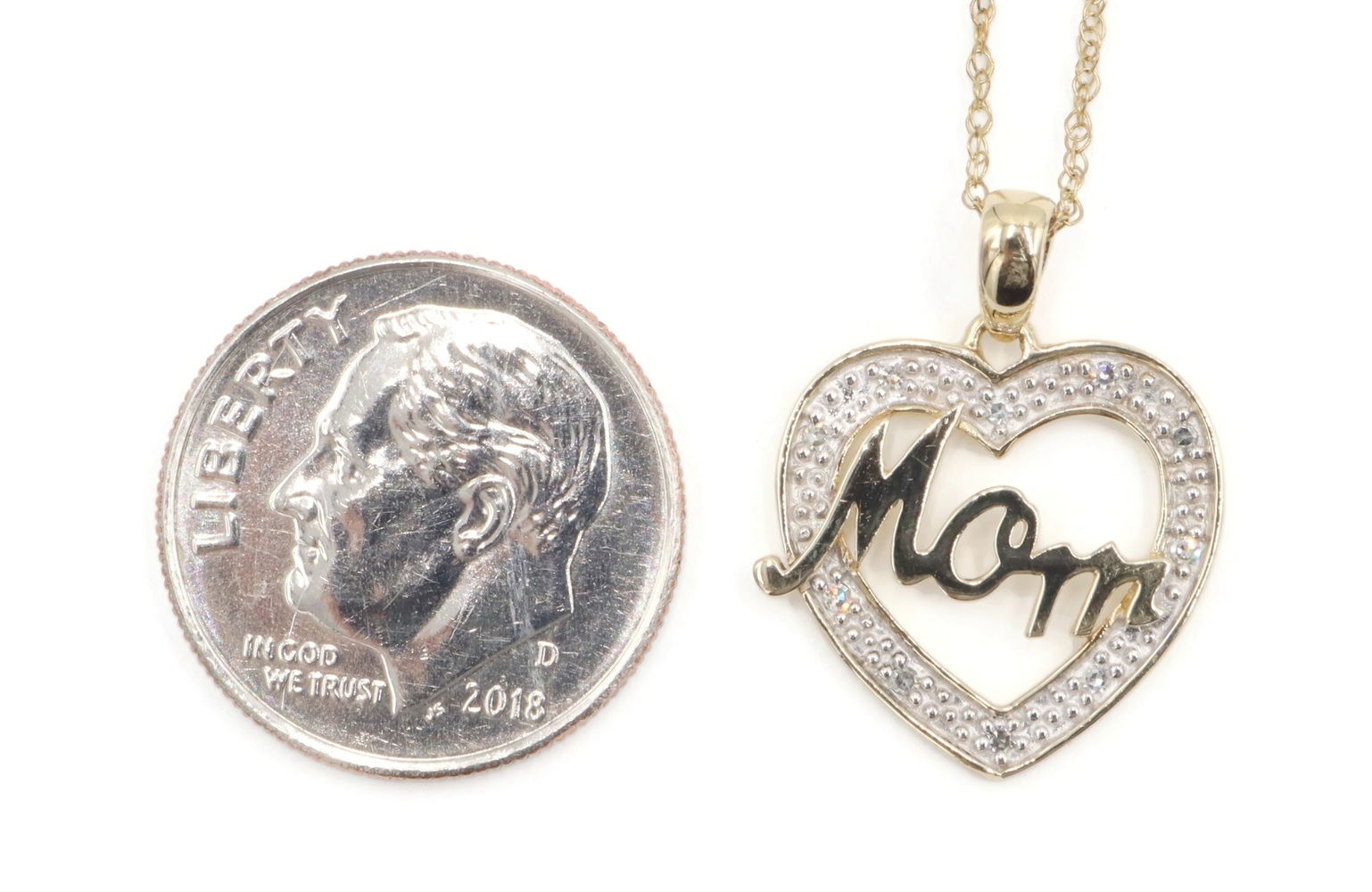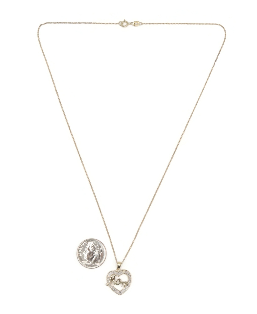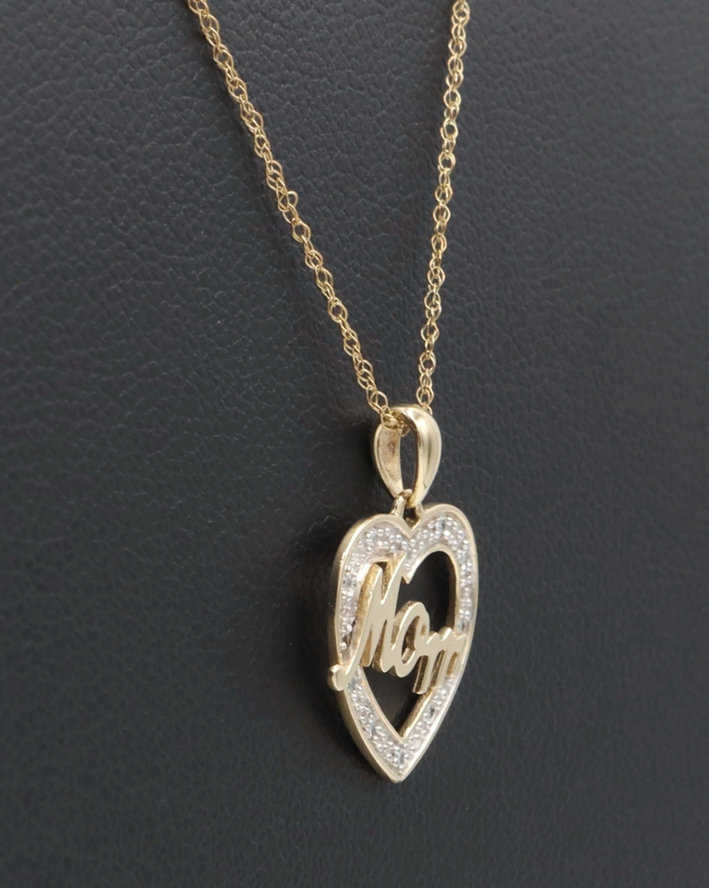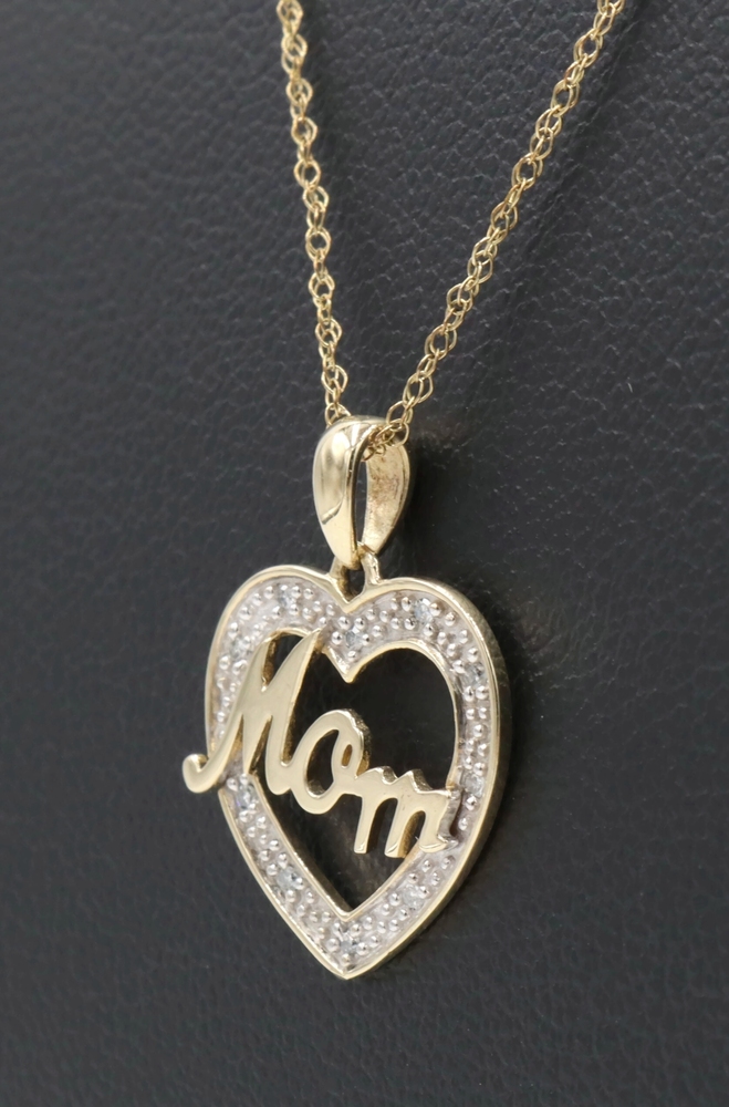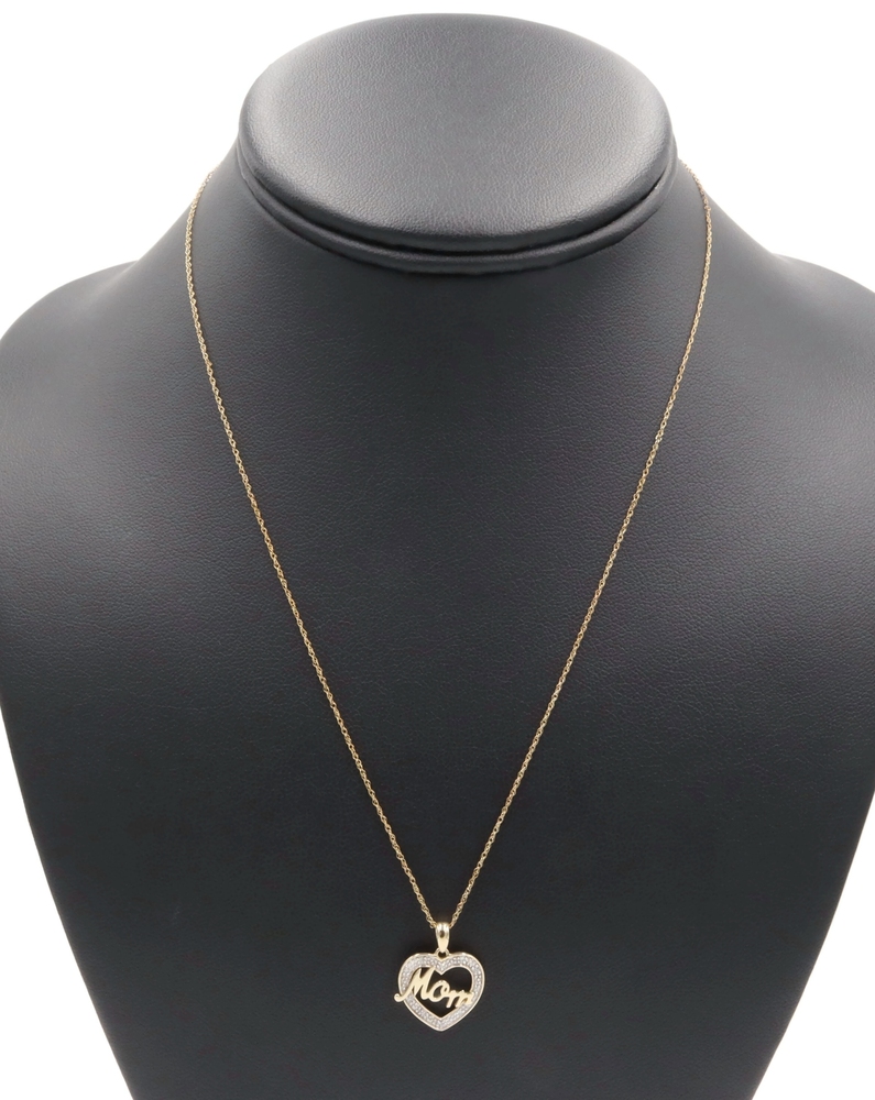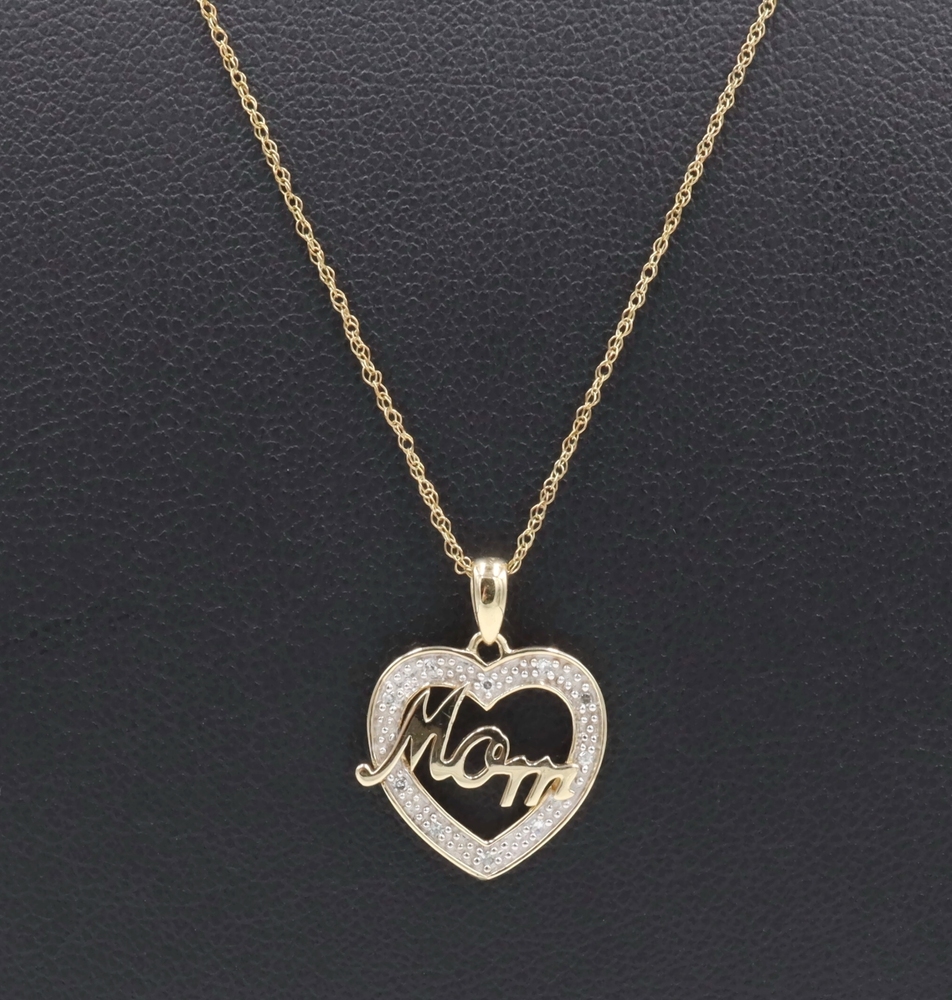 10KT Yellow Gold "Mom" Heart Pendant w/ Diamond Accents on 10KT Rope Chain 18". This pendant is approximately 20.2mm in length (including the bail) and the rope necklace is approximately 18 inches in length.
