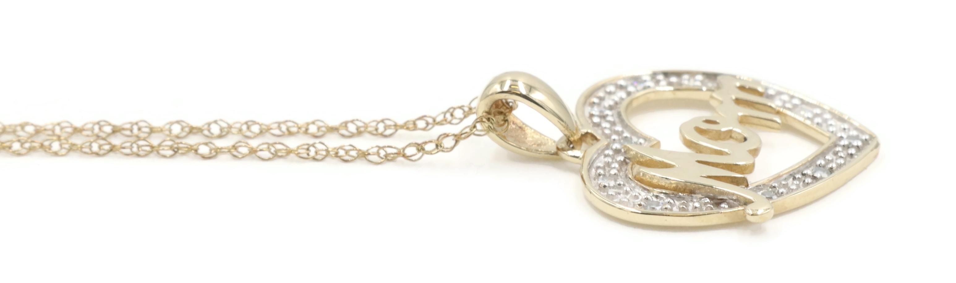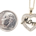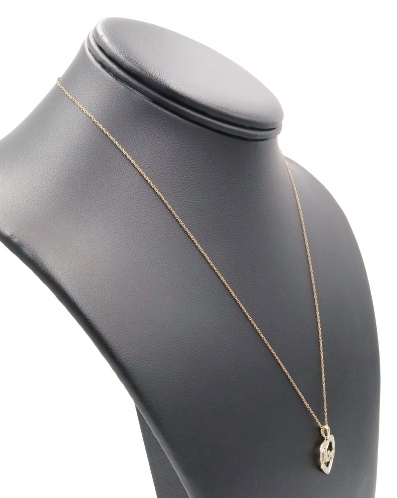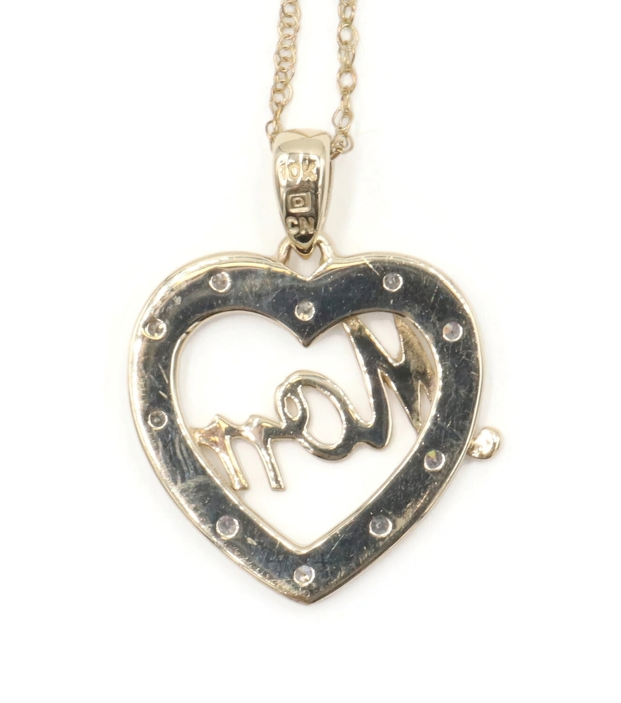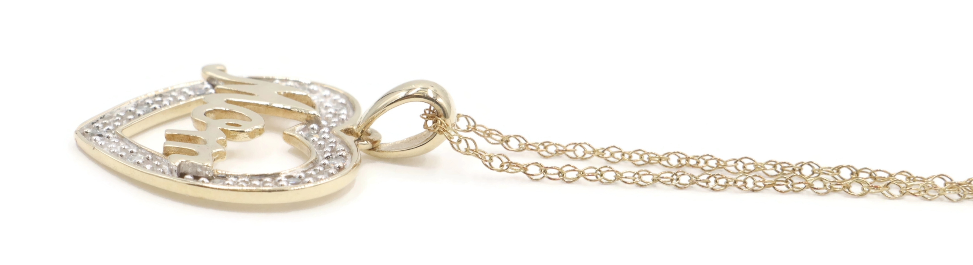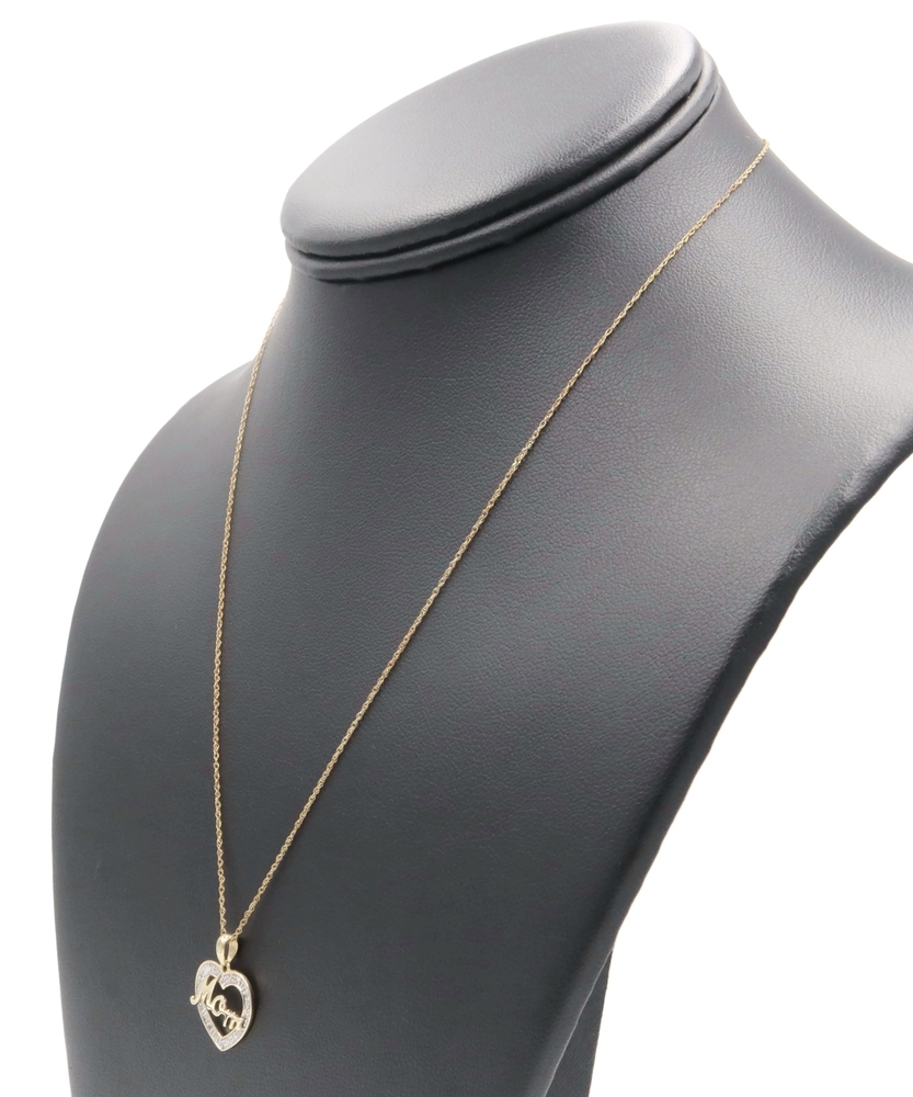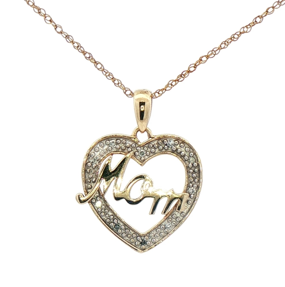10KT Yellow Gold "Mom" Heart Pendant w/ Diamond Accents on 10KT Rope Chain 18". This pendant is approximately 20.2mm in length (including the bail) and the rope necklace is approximately 18 inches in length.