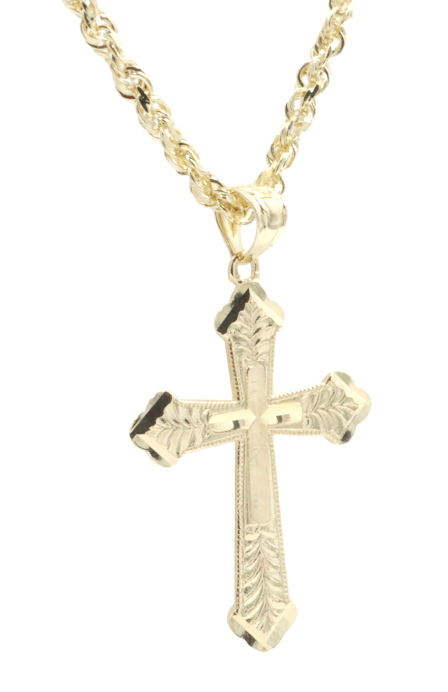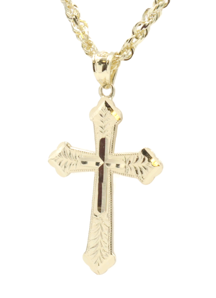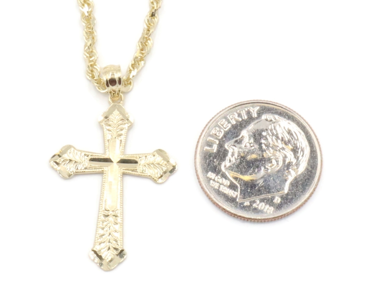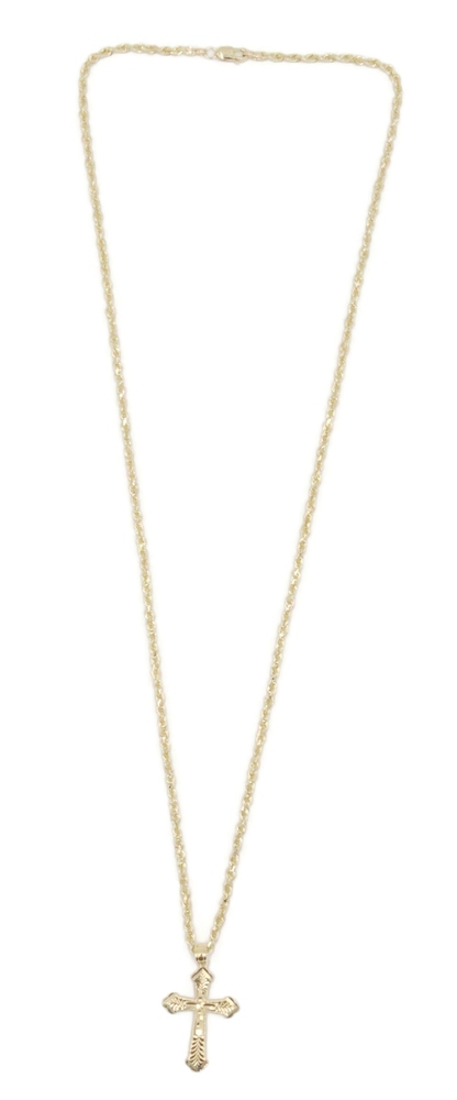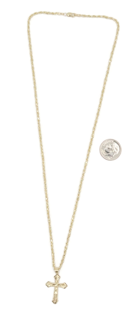 14KT Yellow Gold Diamond Cut Cross Pendant on 20" 14KT Gold Rope Chain Necklace. Both the pendant and rope chain are 14KT yellow gold.