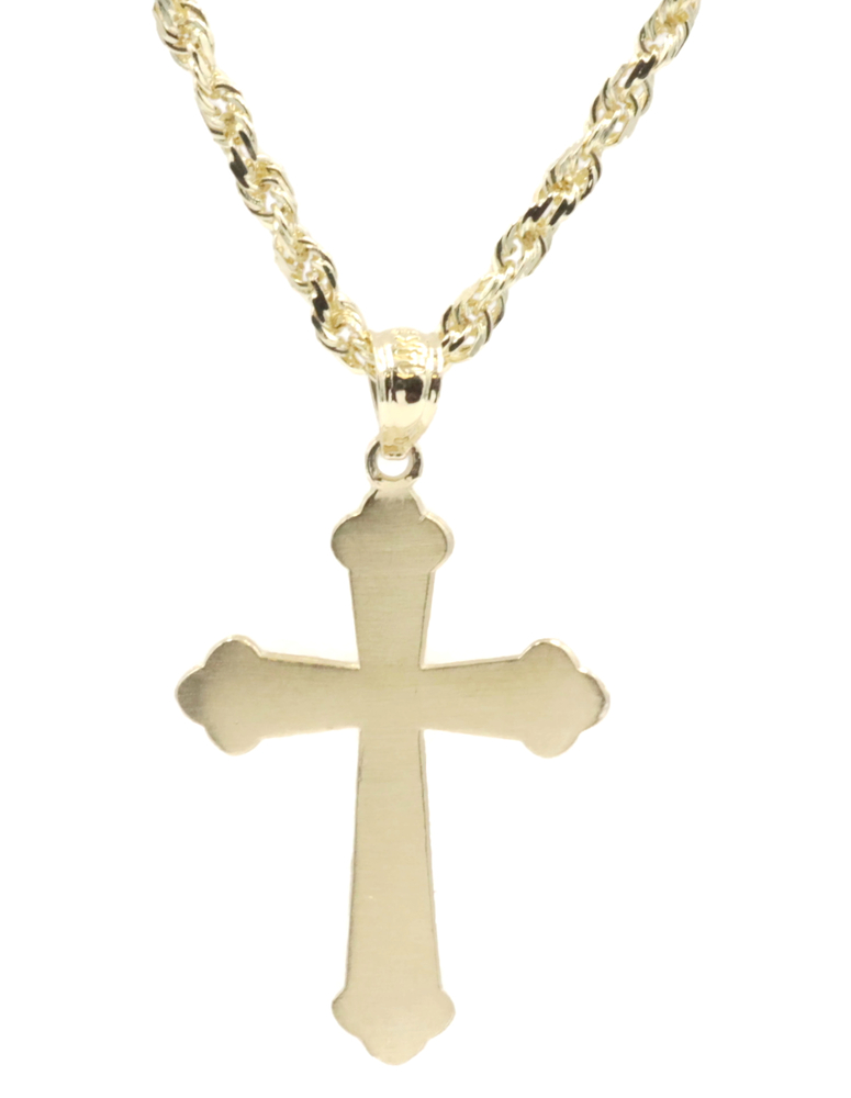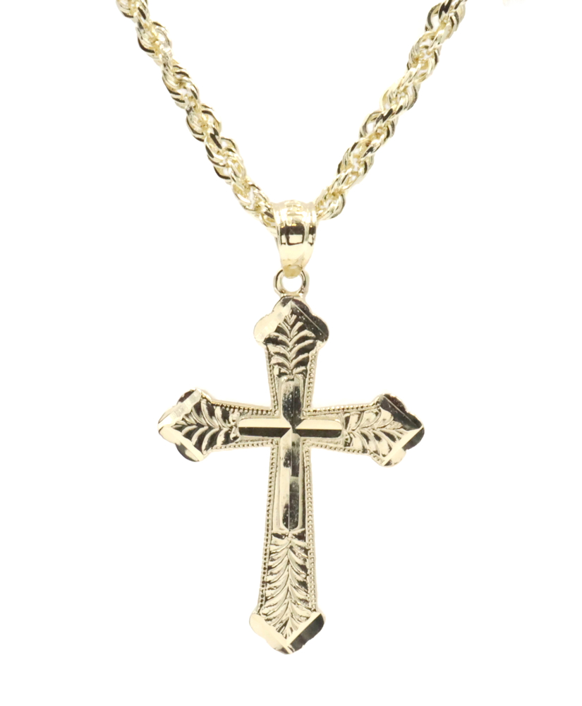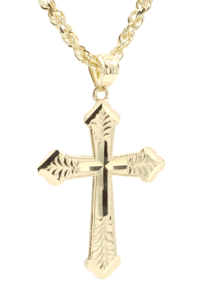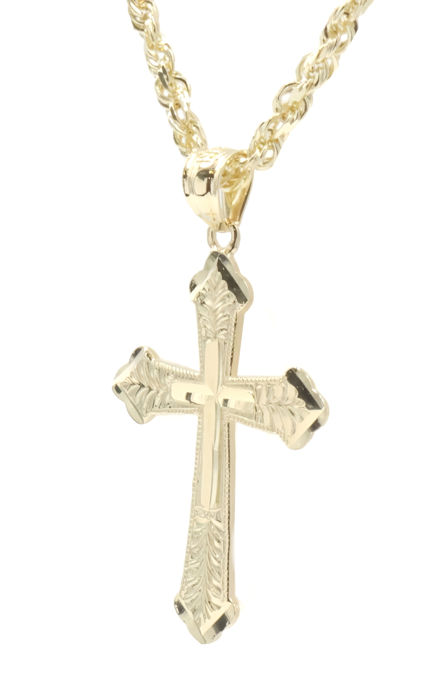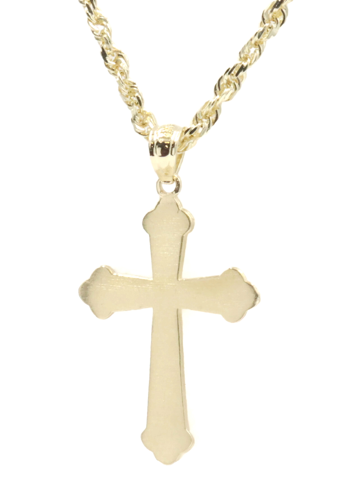 14KT Yellow Gold Diamond Cut Cross Pendant on 20" 14KT Gold Rope Chain Necklace. Both the pendant and rope chain are 14KT yellow gold.