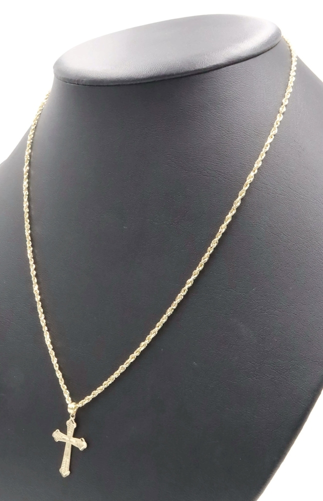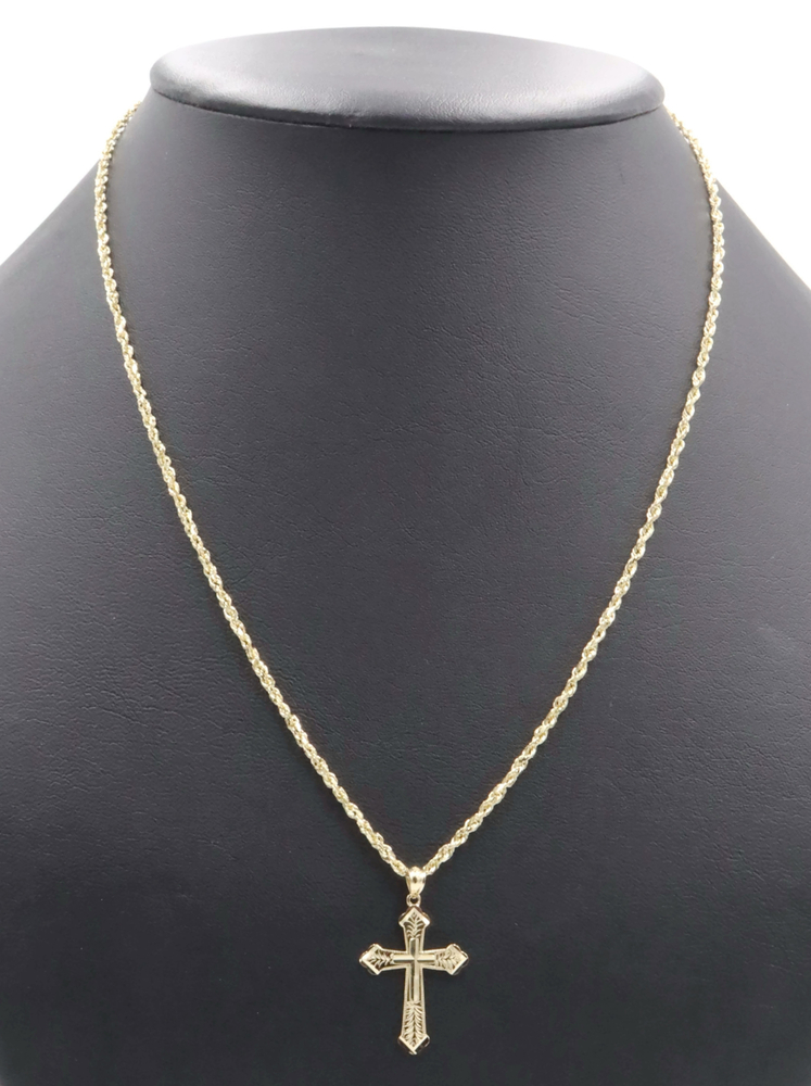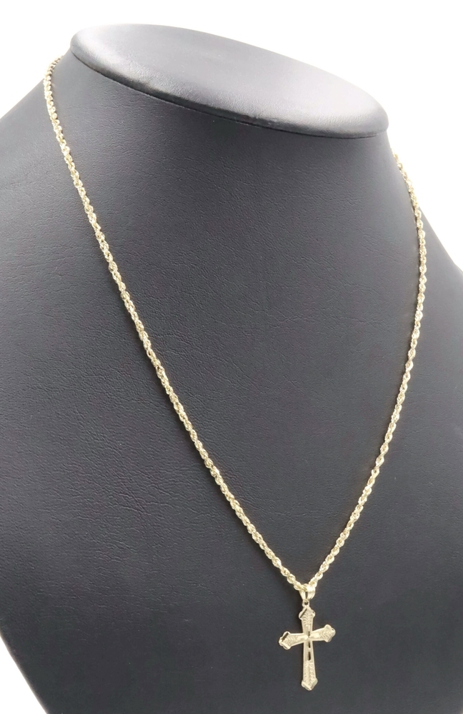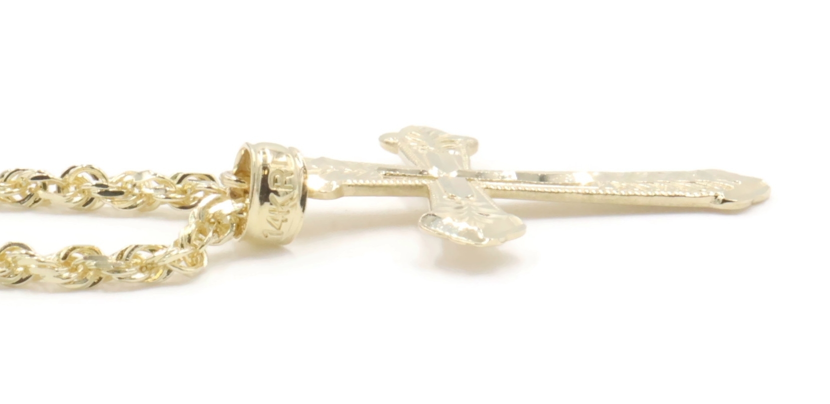 14KT Yellow Gold Diamond Cut Cross Pendant on 20" 14KT Gold Rope Chain Necklace | USA Pawn