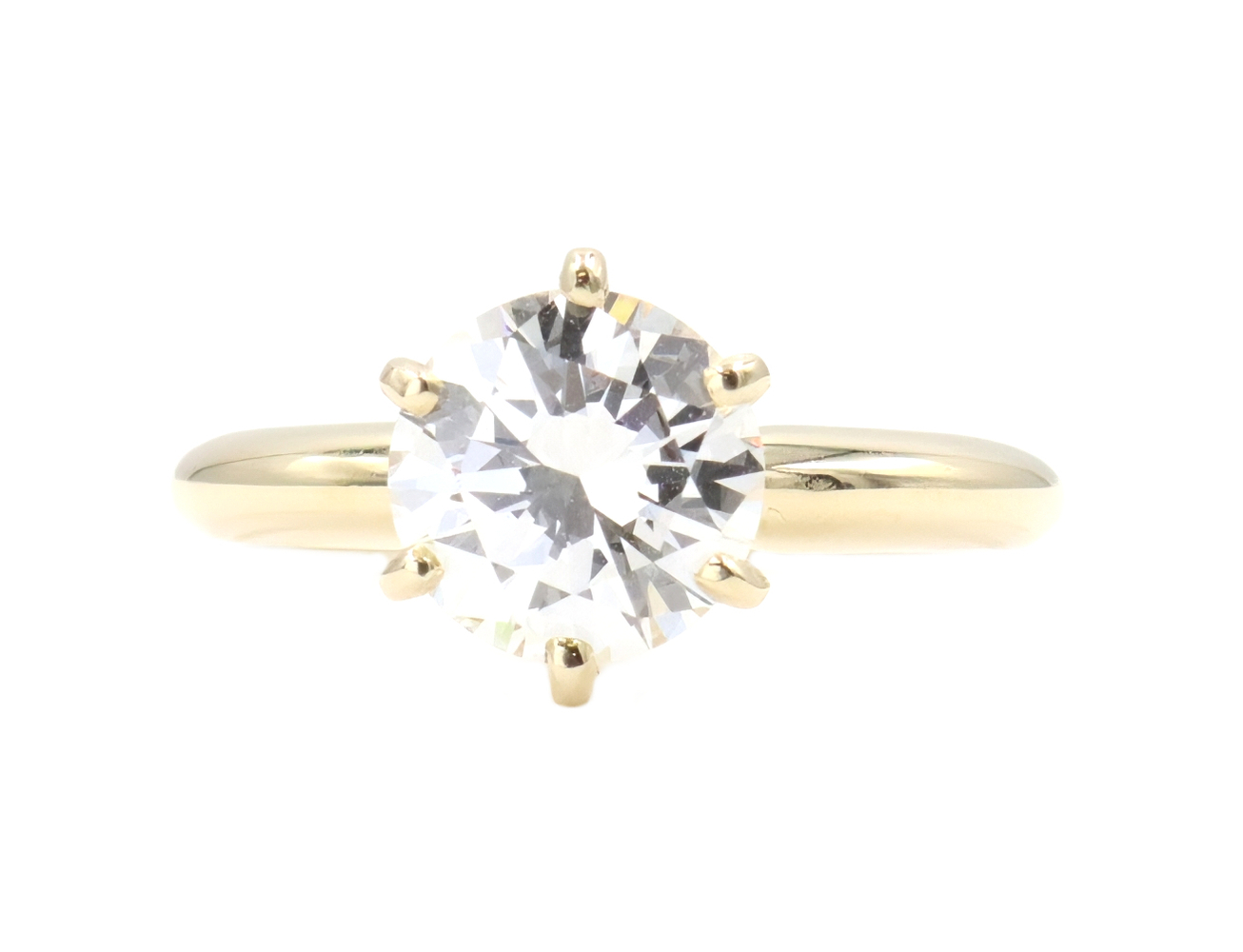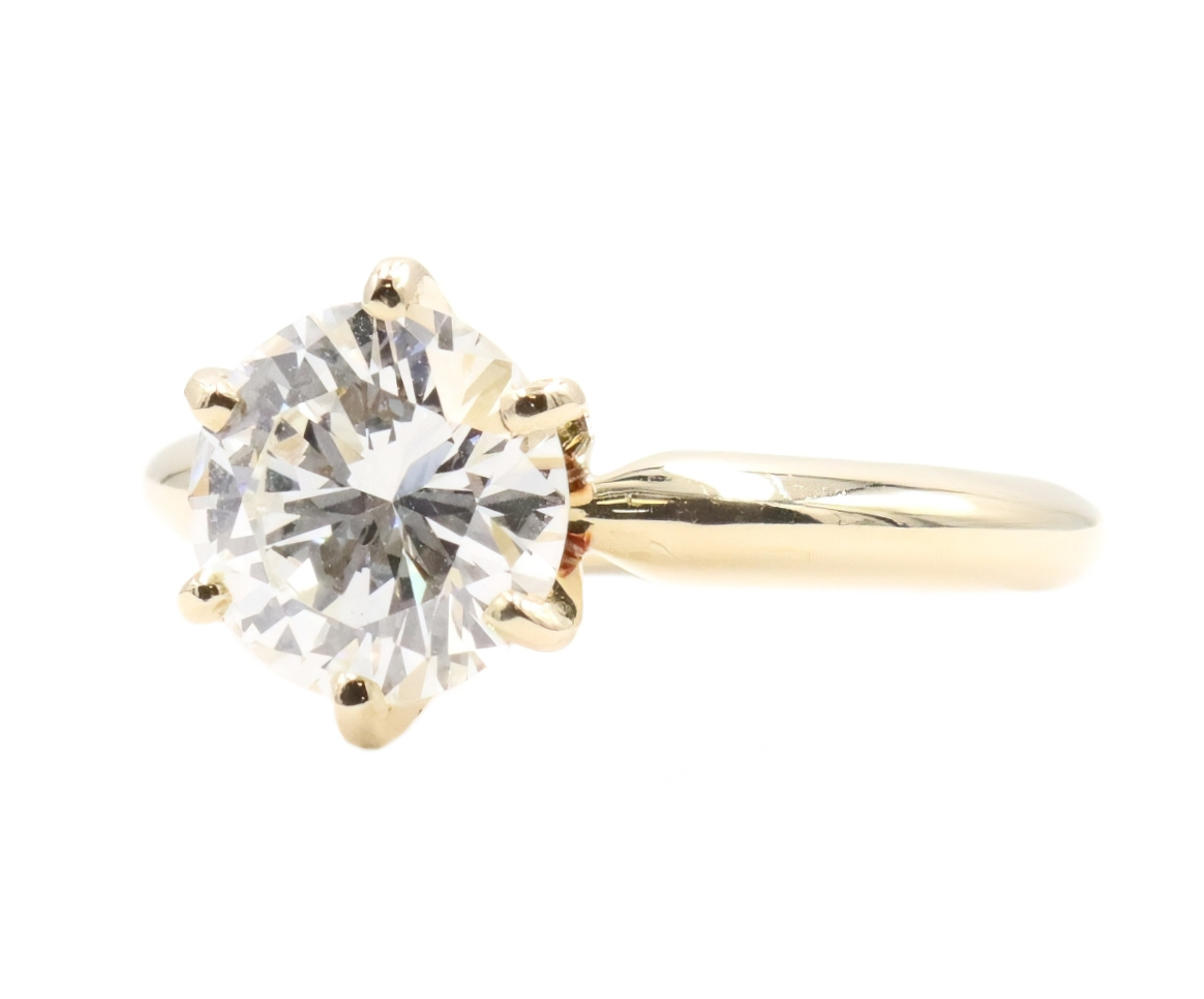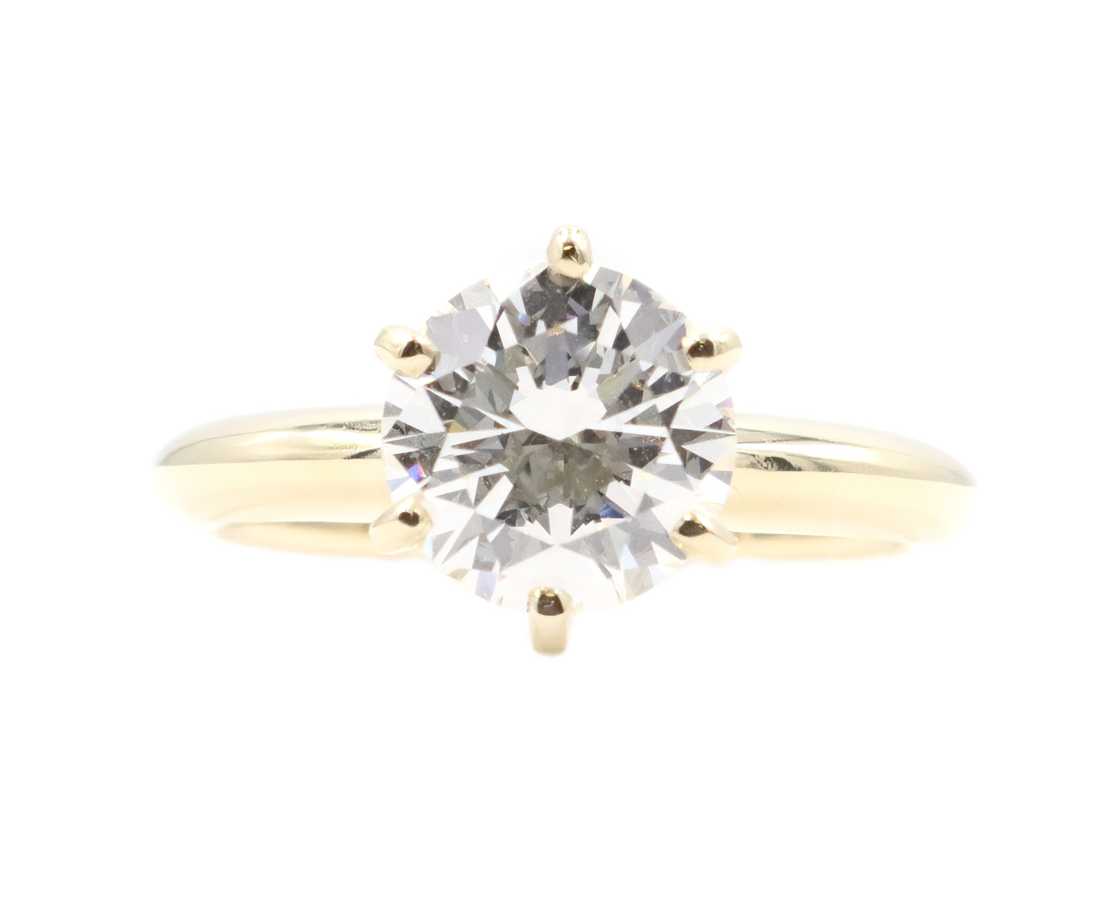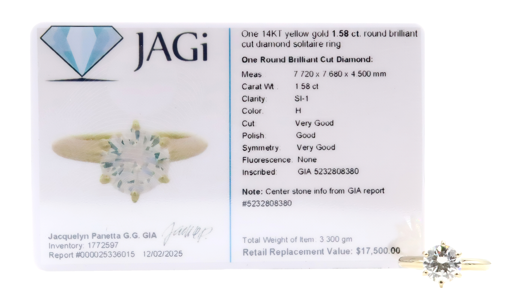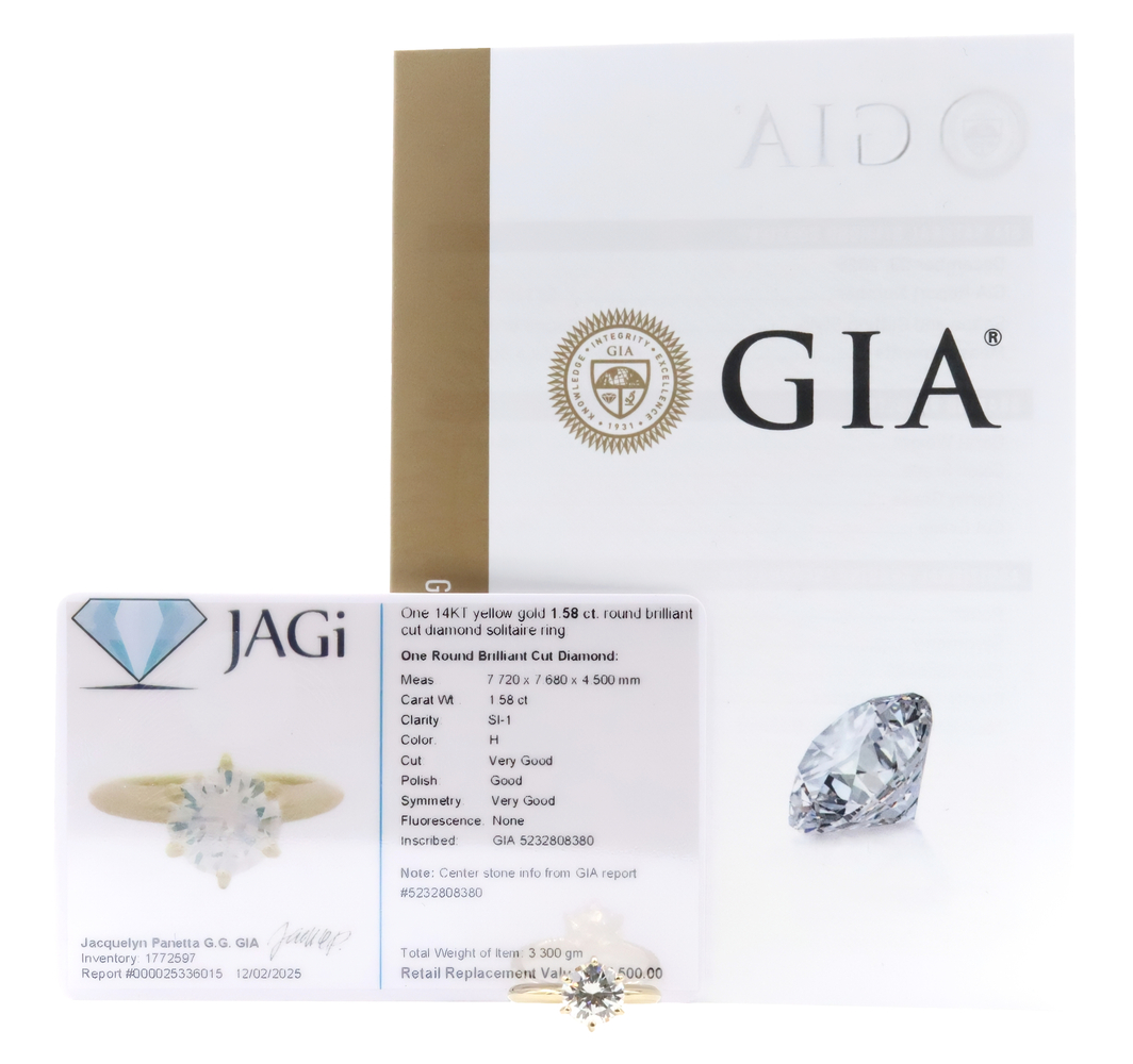 14KT Yellow Gold GIA Graded 1.58 ct. SI-1 H Round Brilliant Solitaire Ring 3.5g. This ring is a size 5. Featuring one stunning round brilliant cut diamond with a carat weight of 1.58 ct. This diamond measures approximately 7.720 mm x 7.680mm x 4.500mm with a clarity range of SI-1, H color and a very good cut. The GIA report number 5232808380 is laser inscribed on the of the gridle.