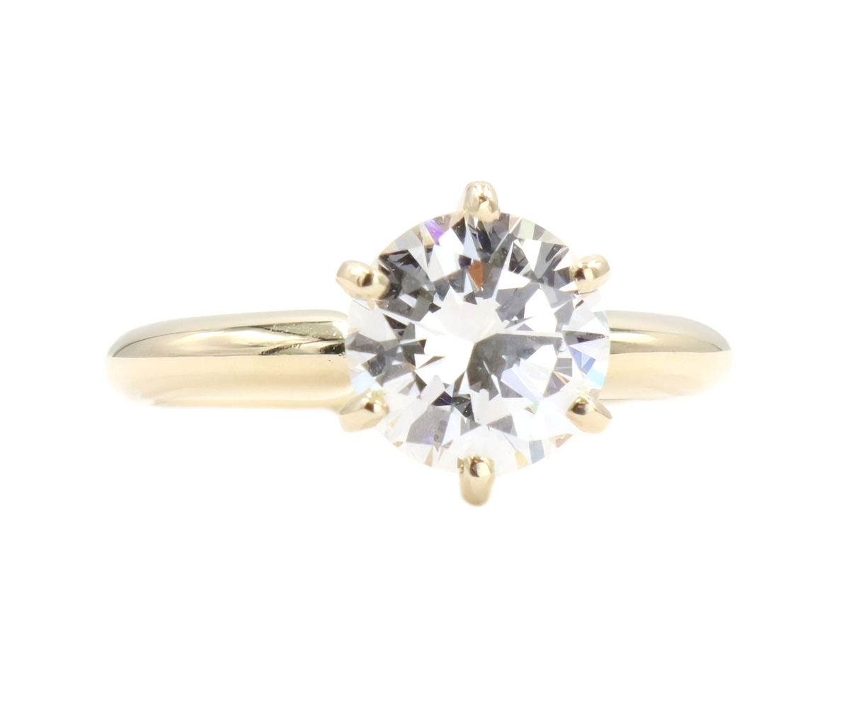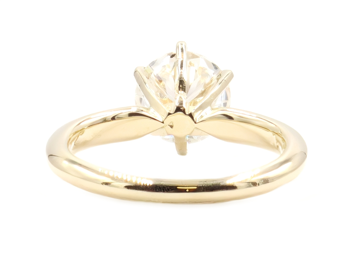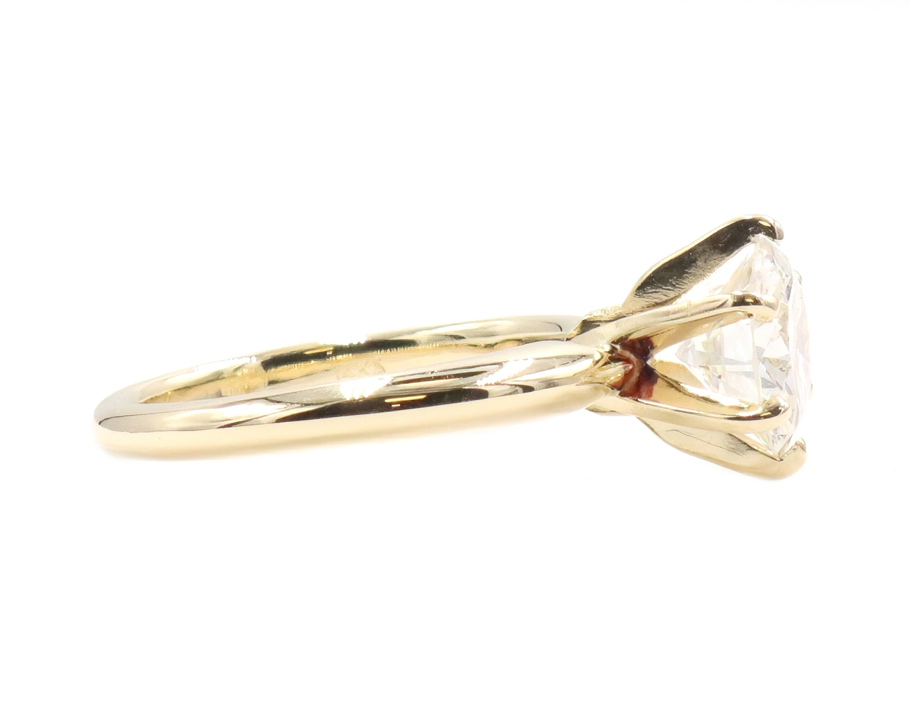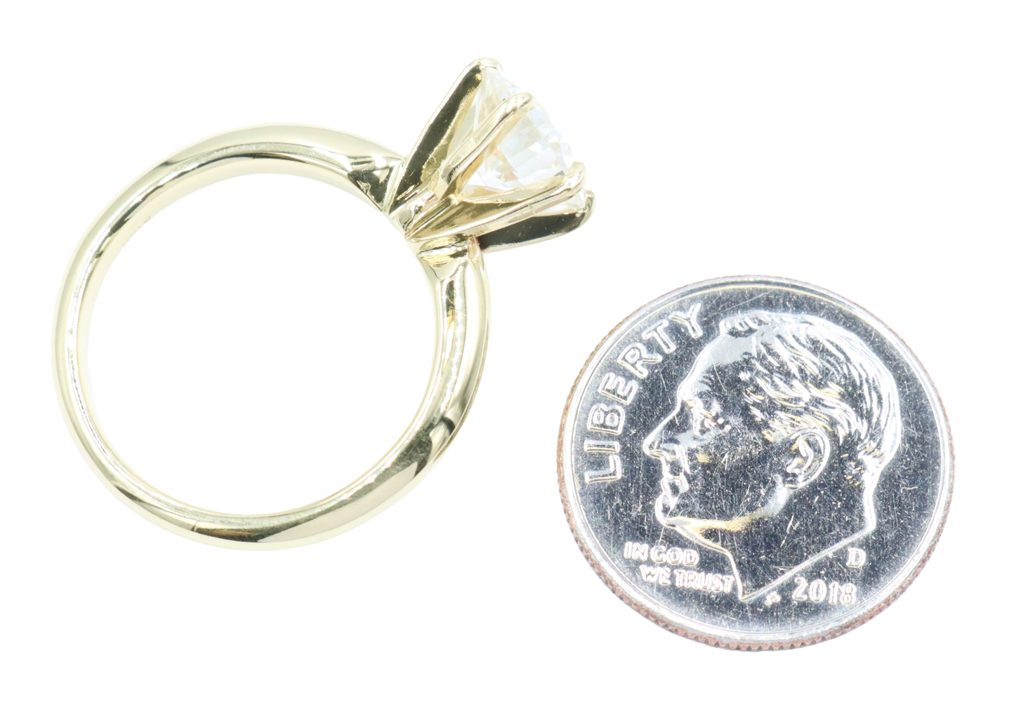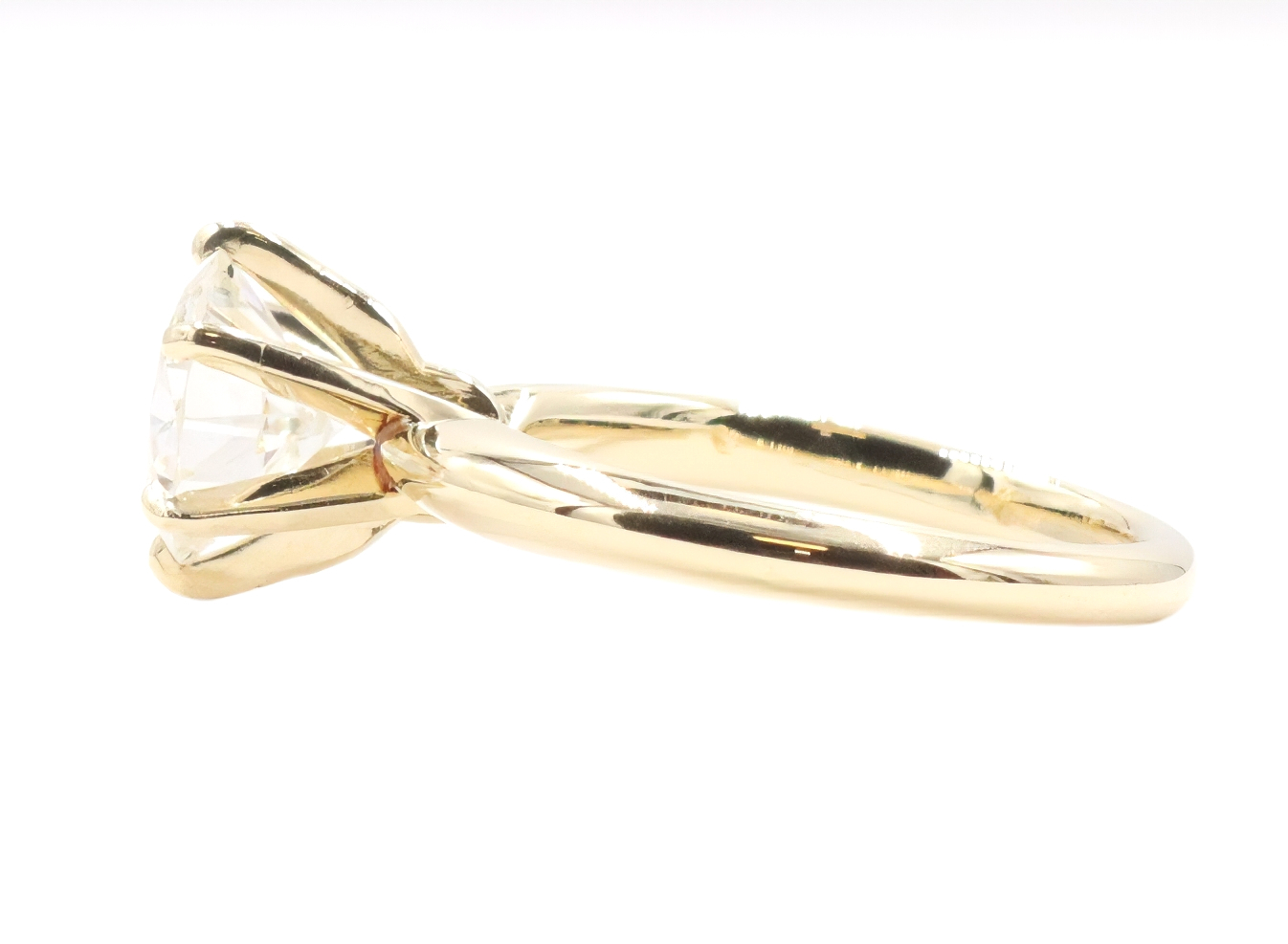 14KT Yellow Gold GIA Graded 1.58 ct. SI-1 H Round Brilliant Solitaire Ring 3.5g. This ring is a size 5. Featuring one stunning round brilliant cut diamond with a carat weight of 1.58 ct. This diamond measures approximately 7.720 mm x 7.680mm x 4.500mm with a clarity range of SI-1, H color and a very good cut. The GIA report number 5232808380 is laser inscribed on the of the gridle.