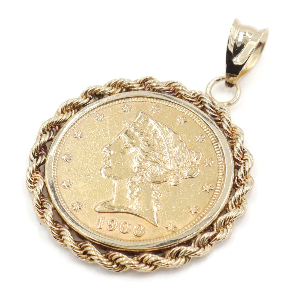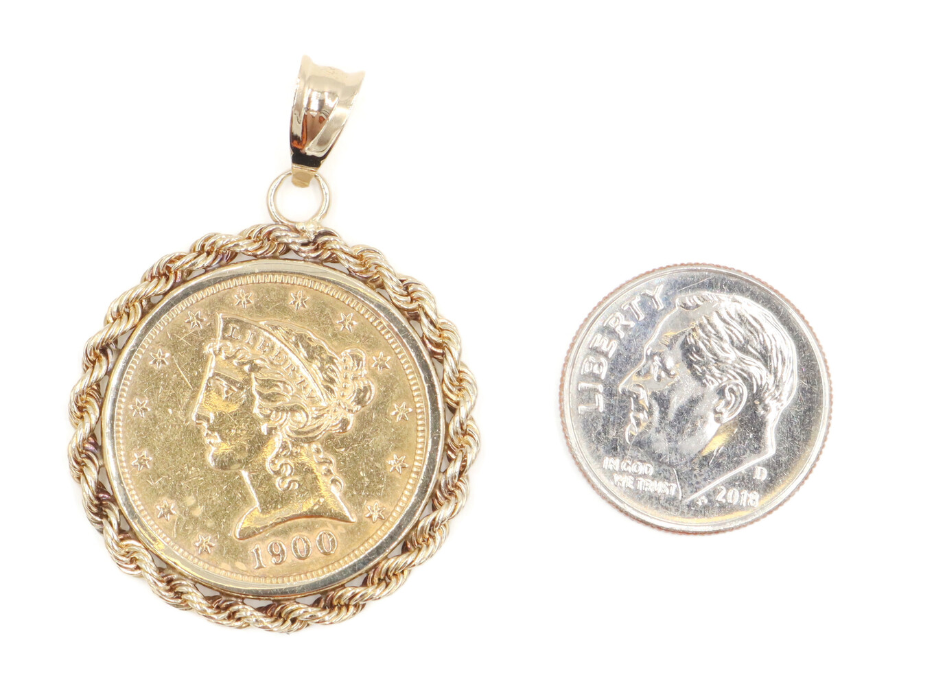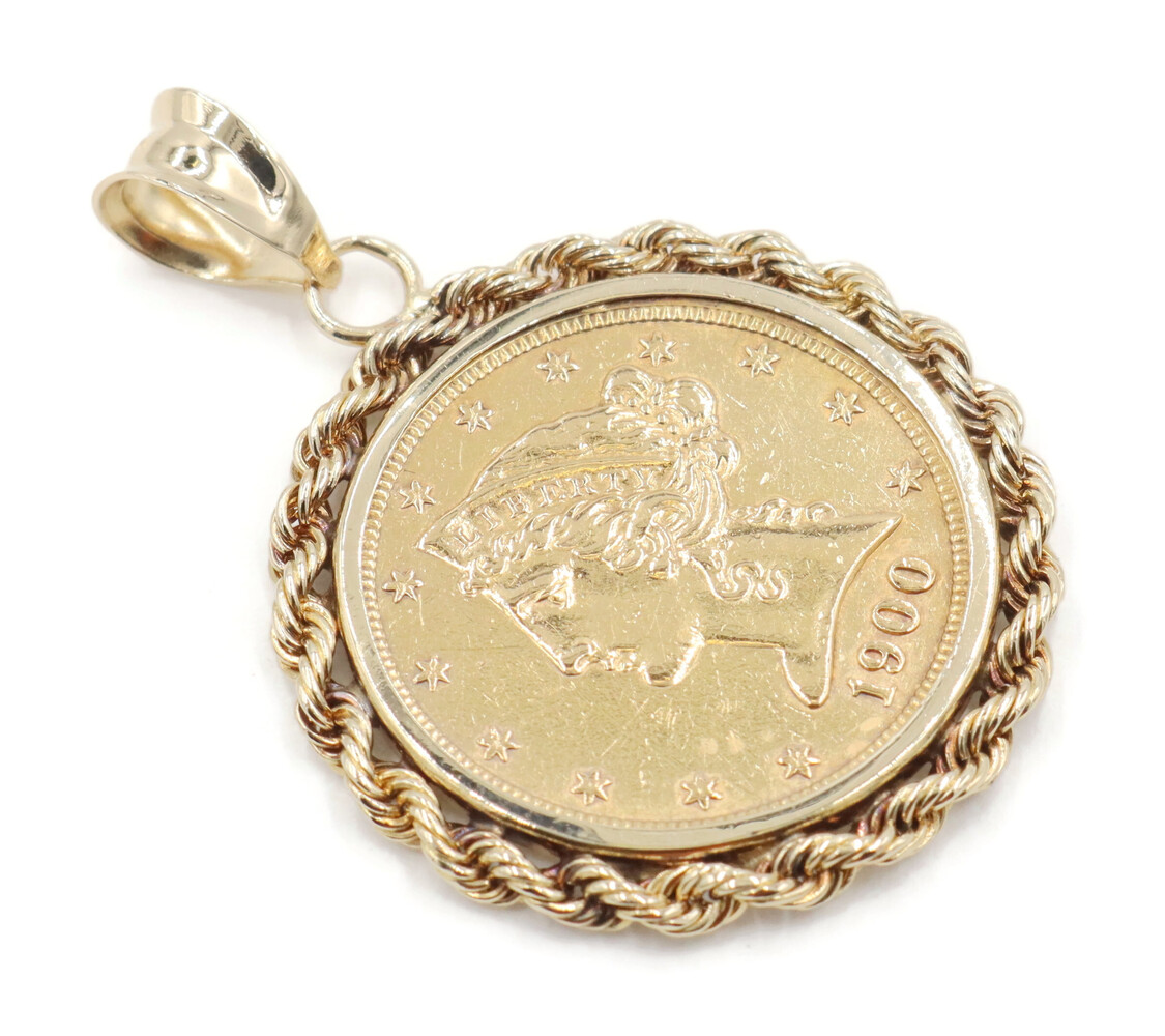1900 Liberty Head Five D Gold Coin in 14KT Yellow Gold Rope Bezel Pendant 10.5g