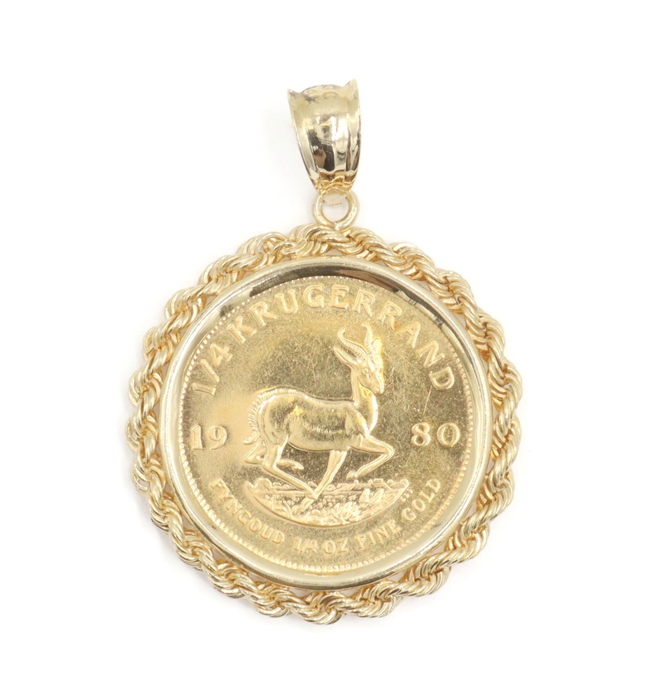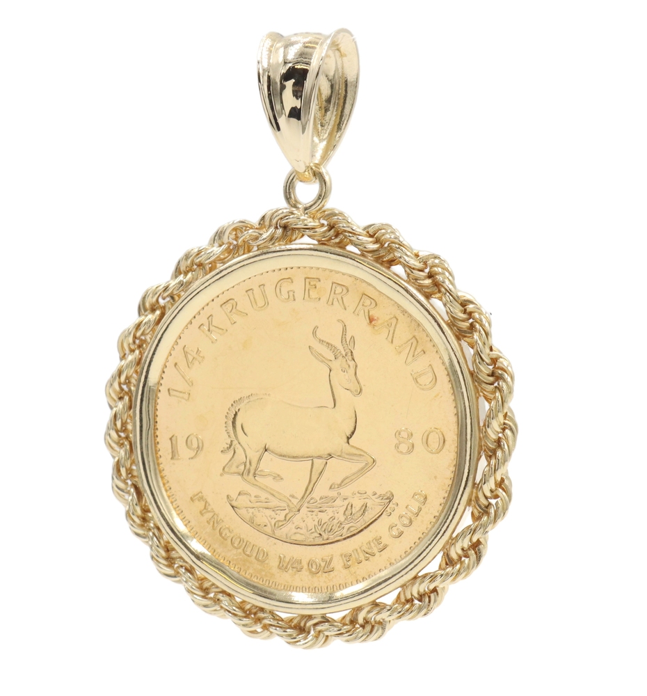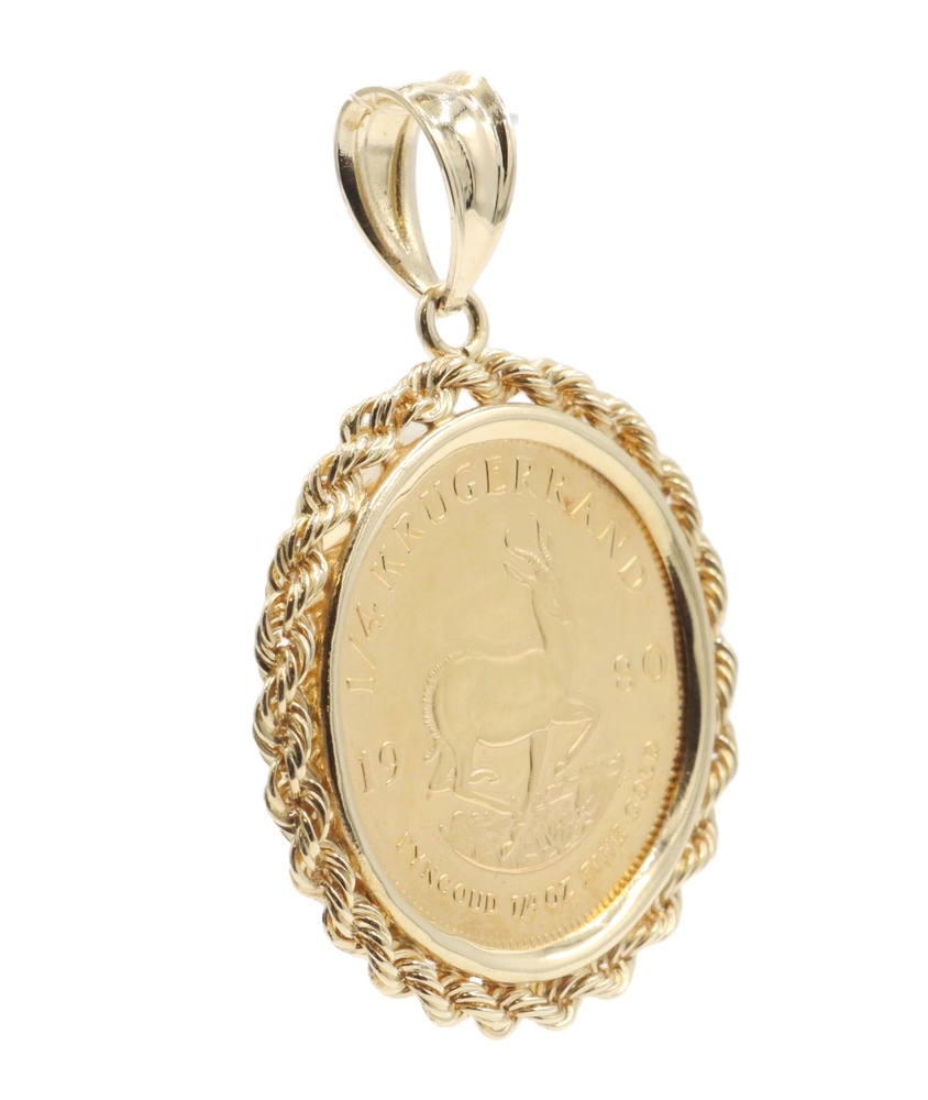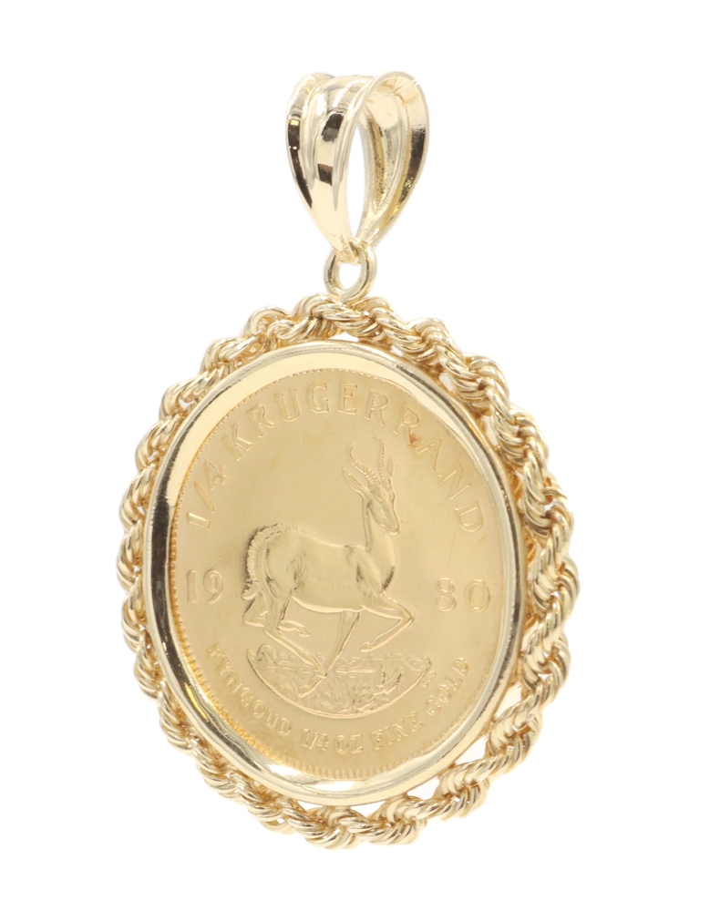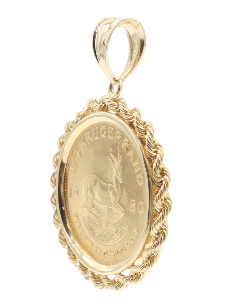 1980 1/4oz Krugerrand Gold Coin in 14KT Yellow Gold Rope Bezel Pendant 11.44g. This pendant features one 1/4oz Fine Gold Krugerrand coin in a 14KT yellow gold rope style bezel.