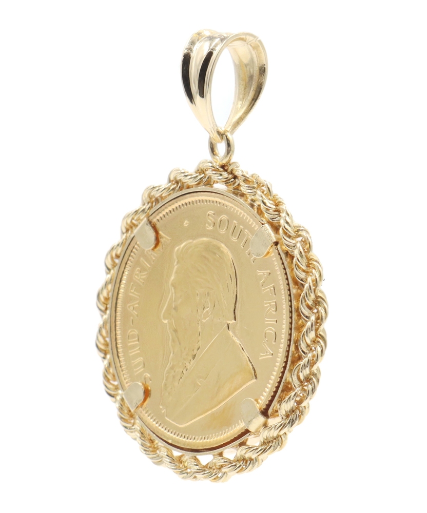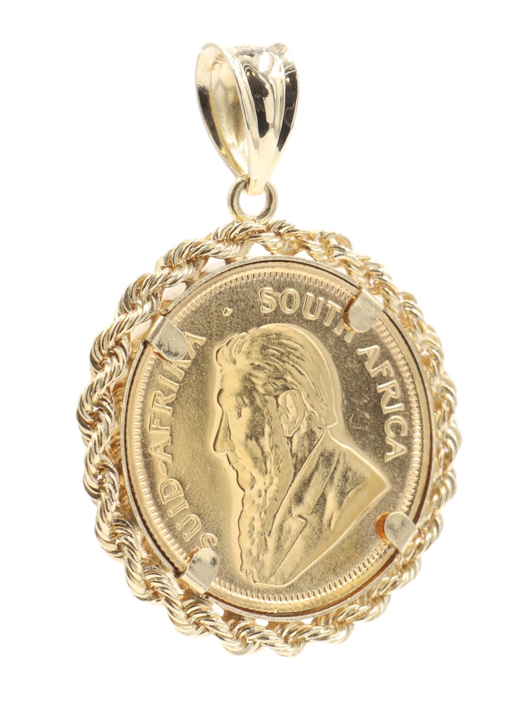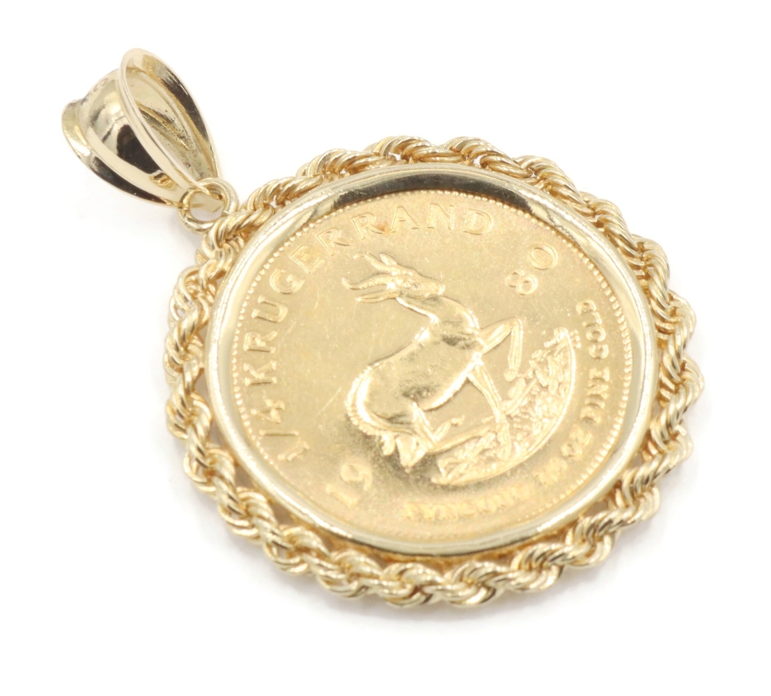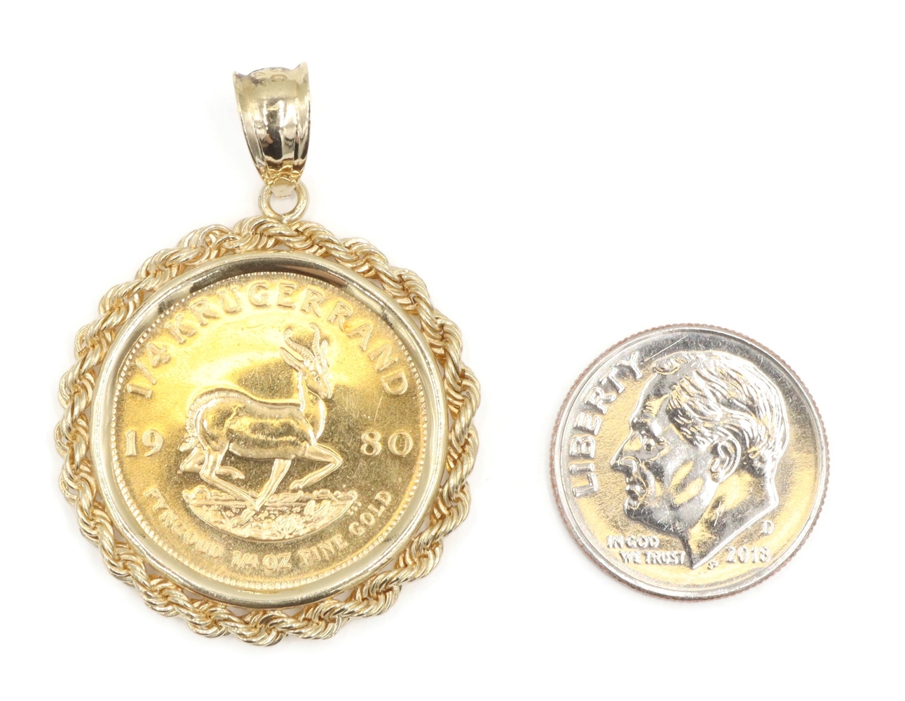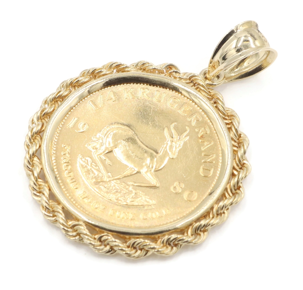1980 1/4oz Krugerrand Gold Coin in 14KT Yellow Gold Rope Bezel Pendant 11.44g. This pendant features one 1/4oz Fine Gold Krugerrand coin in a 14KT yellow gold rope style bezel.