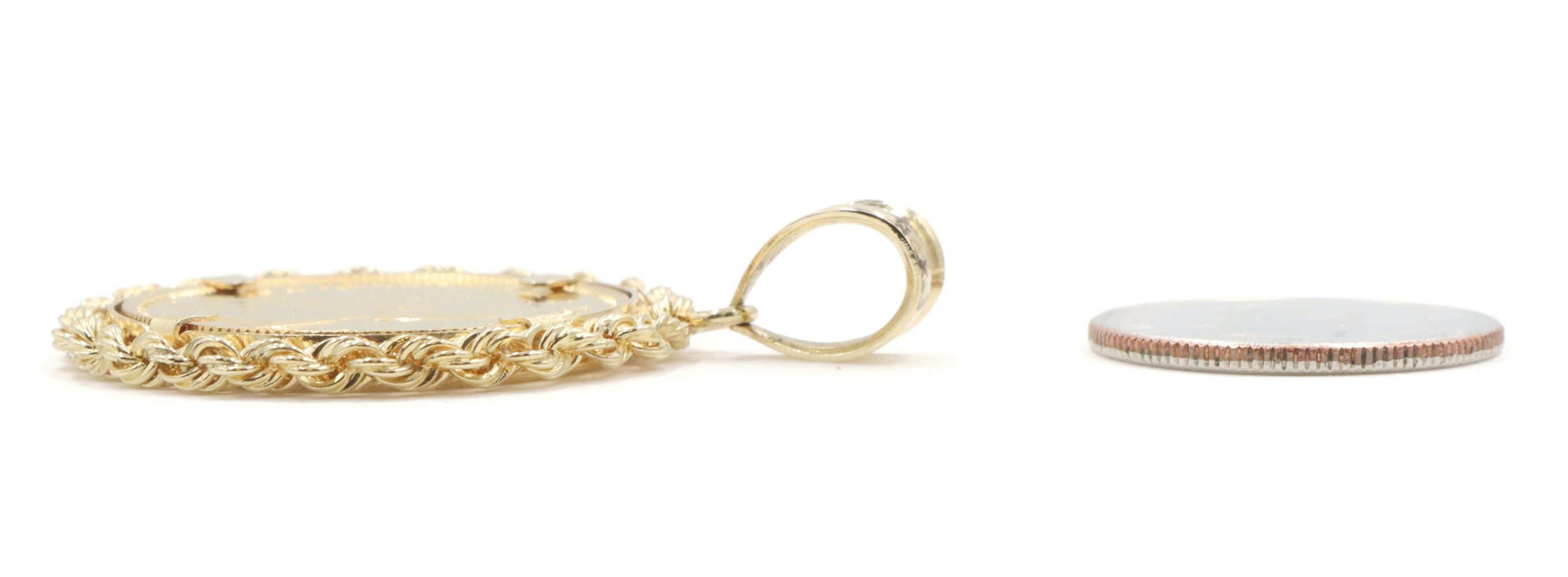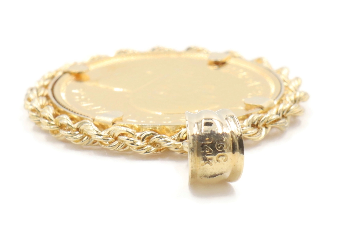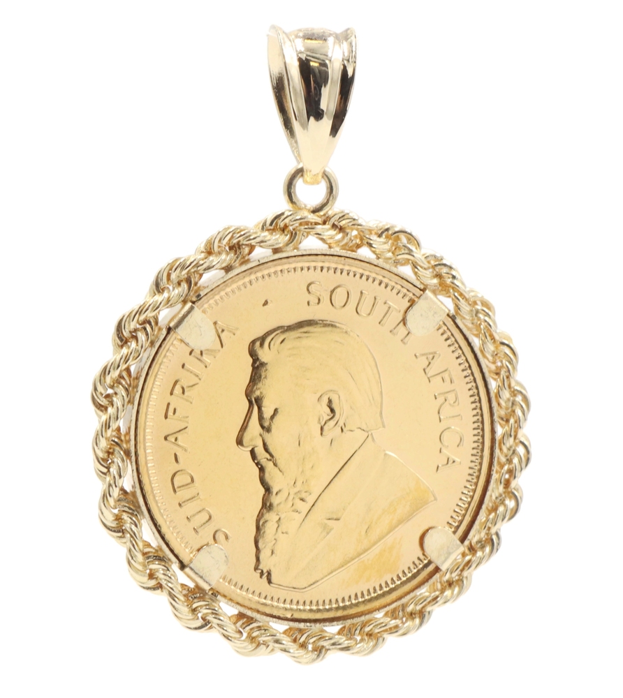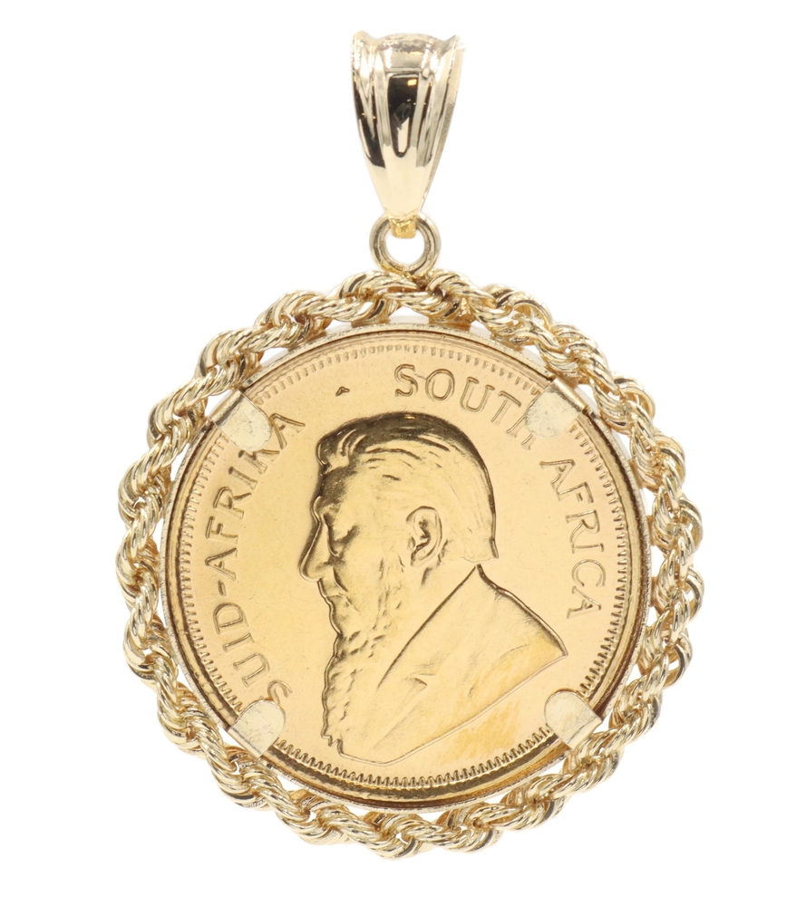 1980 1/4oz Krugerrand Gold Coin in 14KT Yellow Gold Rope Bezel Pendant 11.44g. This pendant features one 1/4oz Fine Gold Krugerrand coin in a 14KT yellow gold rope style bezel.