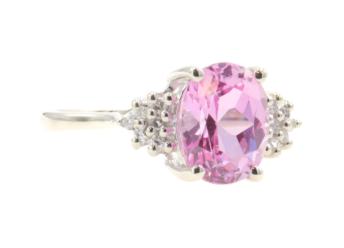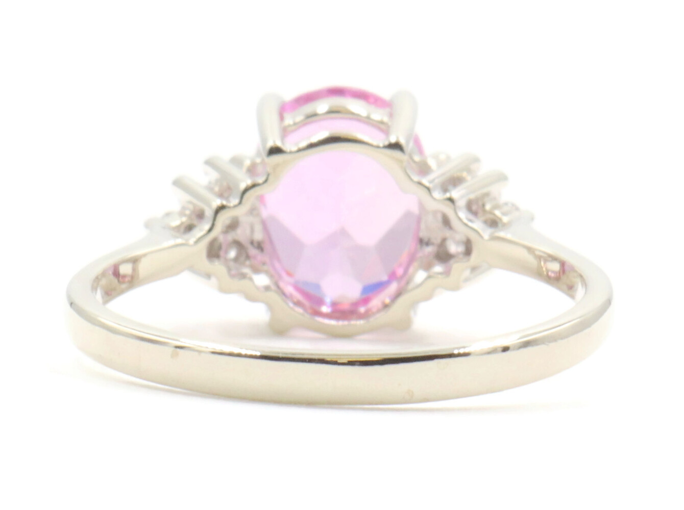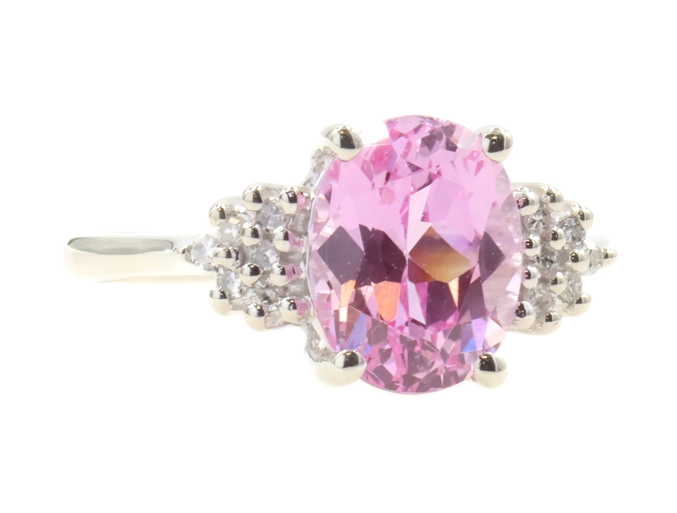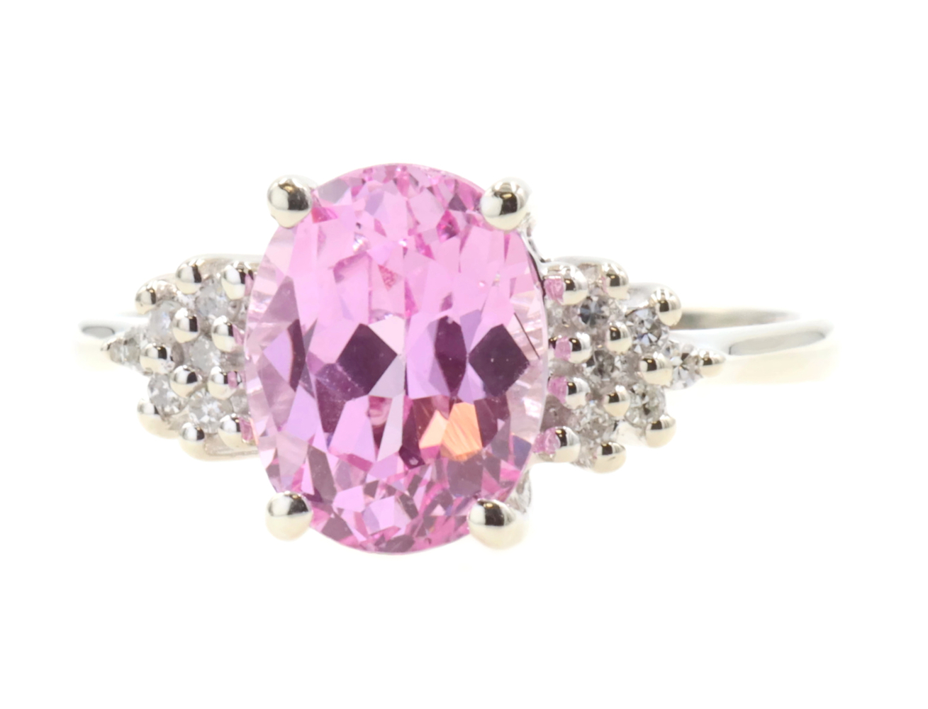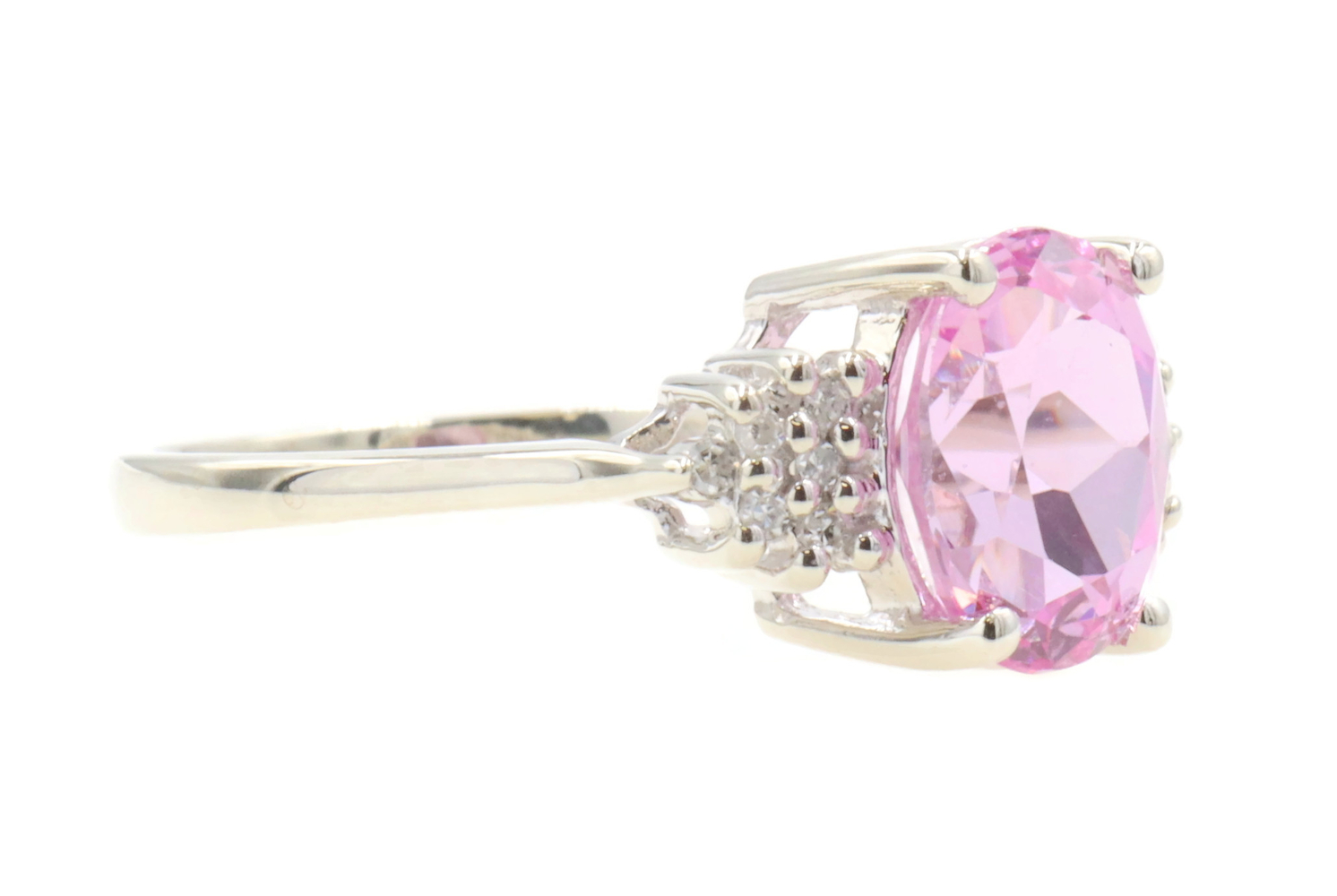 2.50 ctw Oval Pink Lab Created Sapphire & 0.10 ctw Diamond 10KT White Gold Ring. This ring is a size 7.
