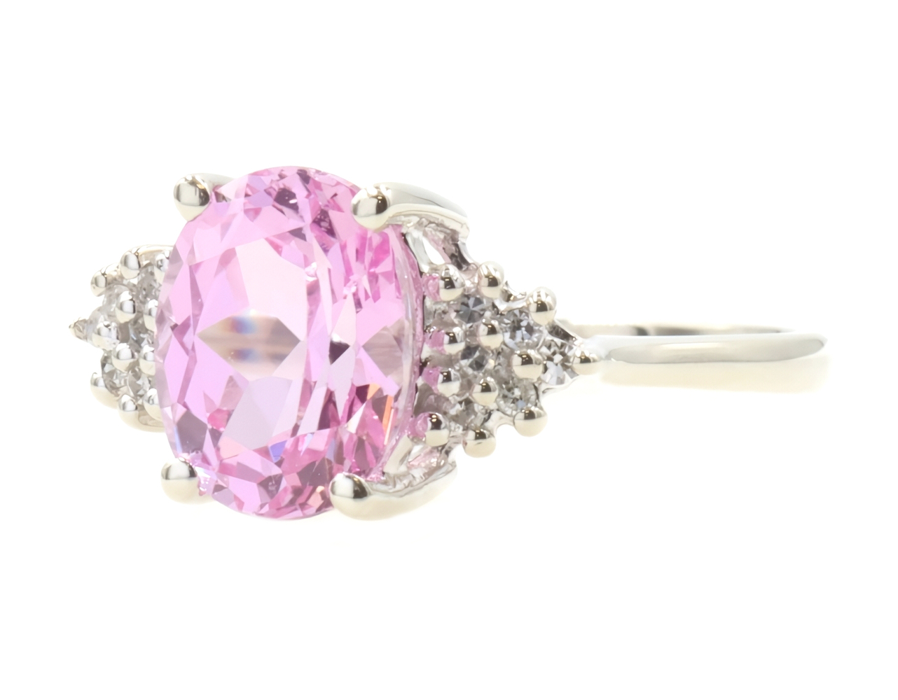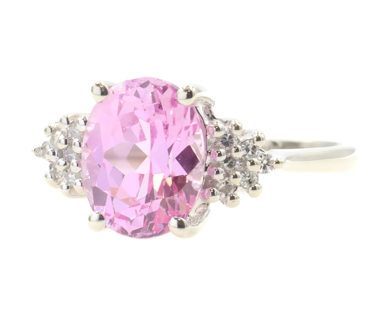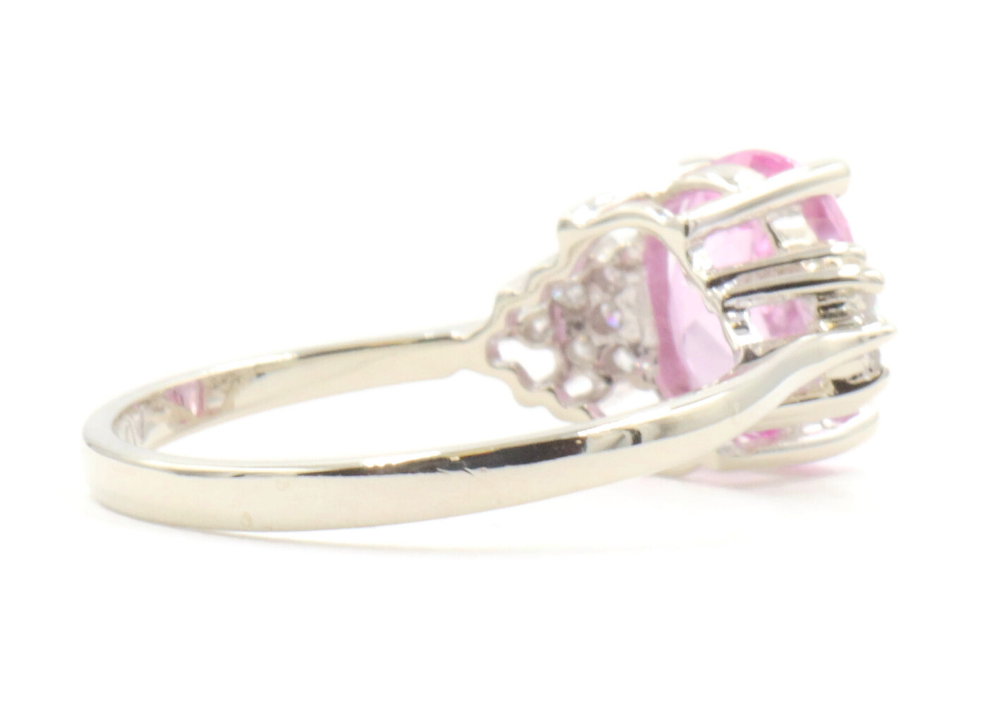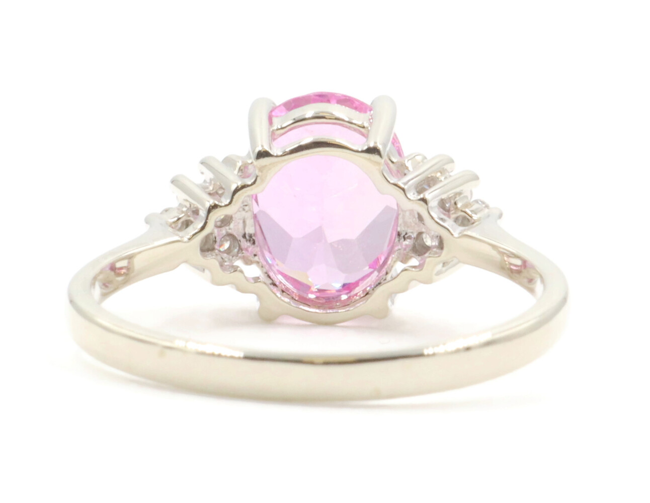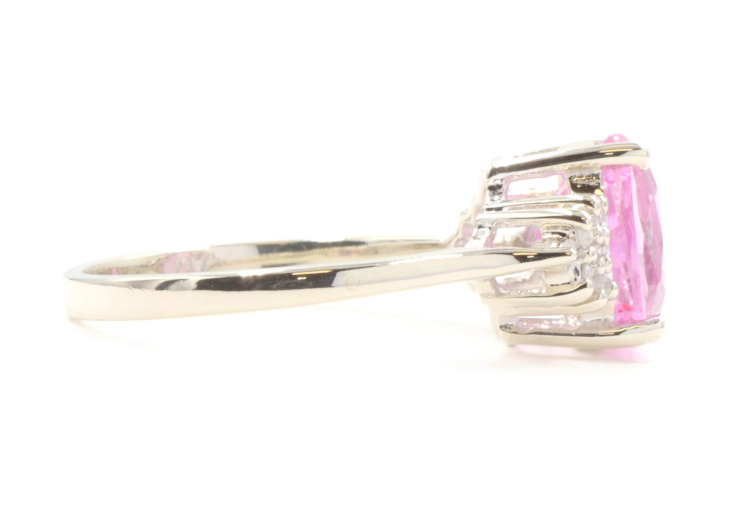 2.50 ctw Oval Pink Lab Created Sapphire & 0.10 ctw Diamond 10KT White Gold Ring. This ring is a size 7.