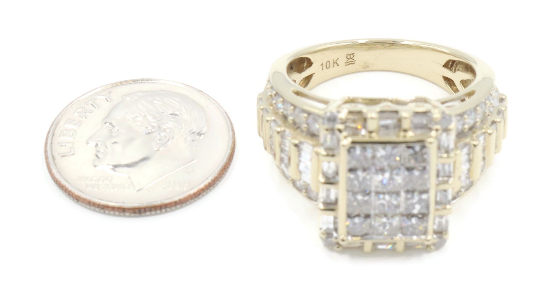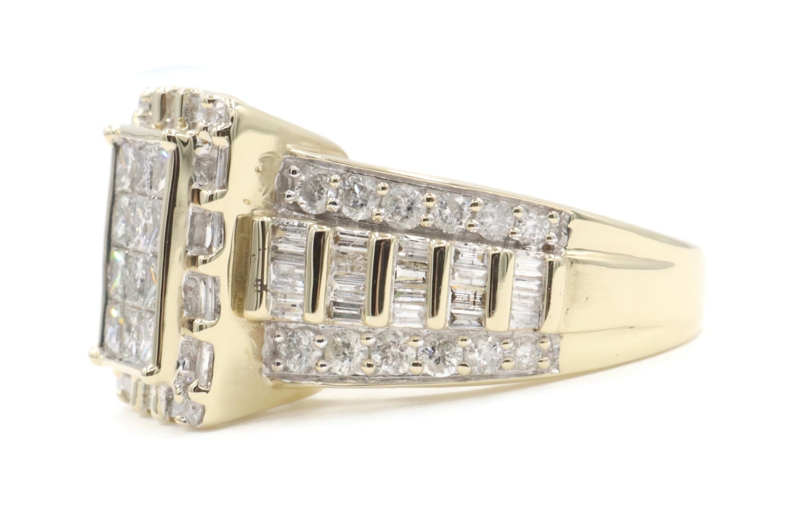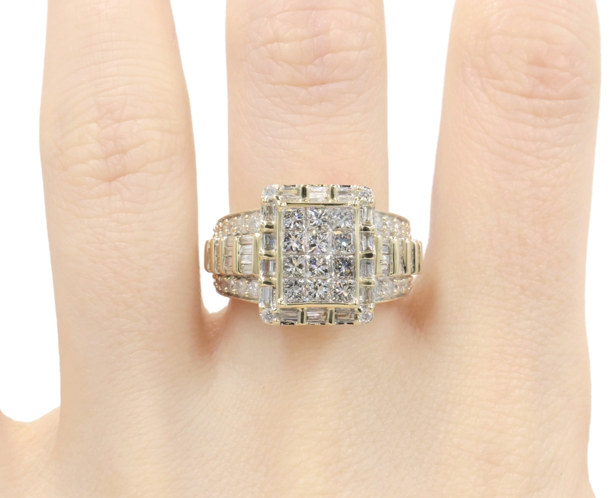 2.52 Ctw Princess, Round & Baguette Diamond 10KT Gold Rectangular Cluster Ring. This ring is a size 7.