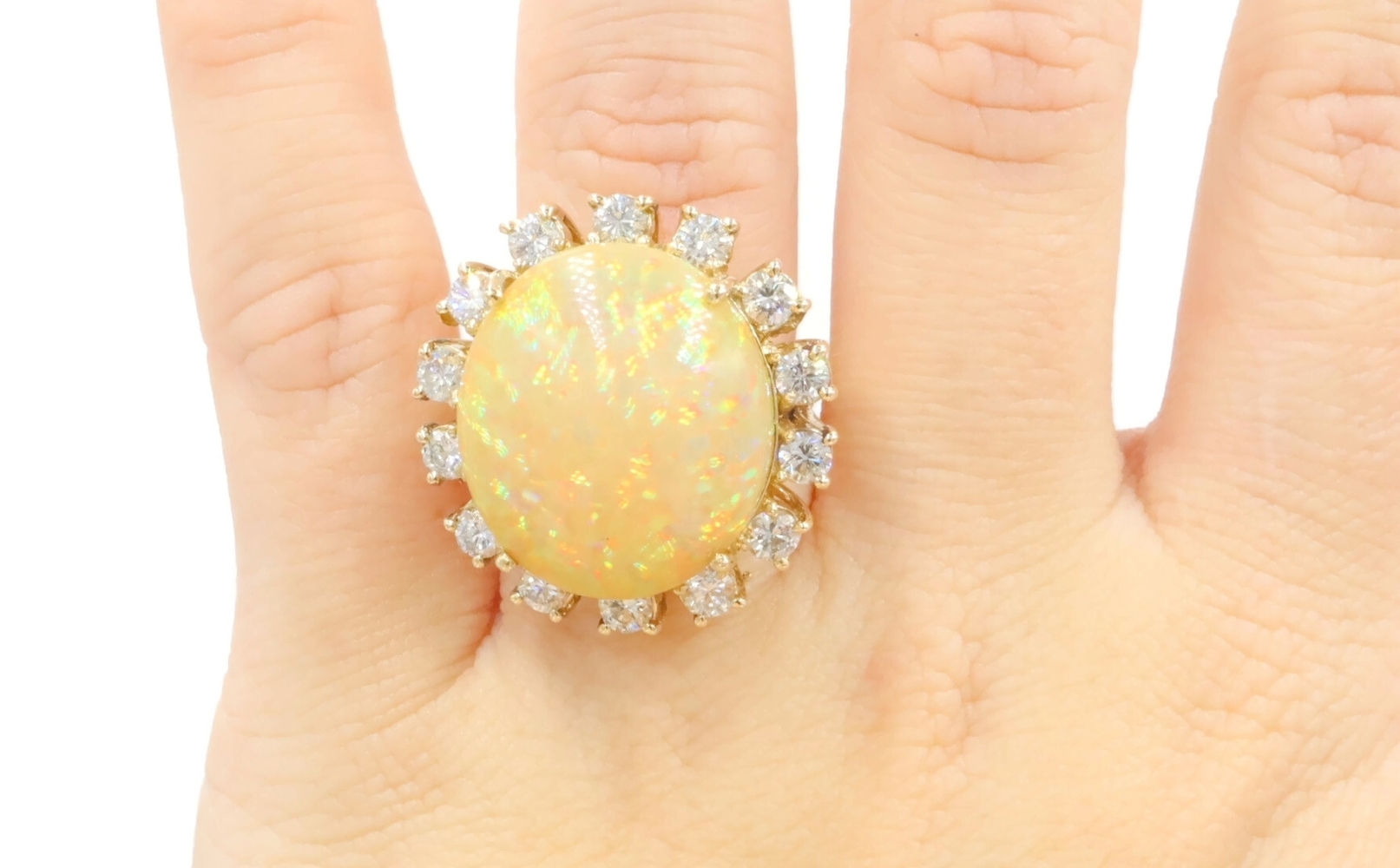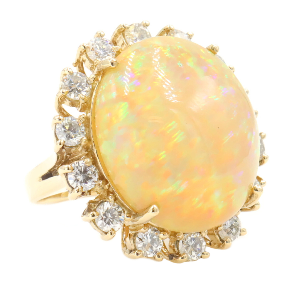 26.20 ctw Oval Cabochon Synthetic Fire Opal & Round Diamond 14K Yellow Gold Ring. This ring is a size 6.