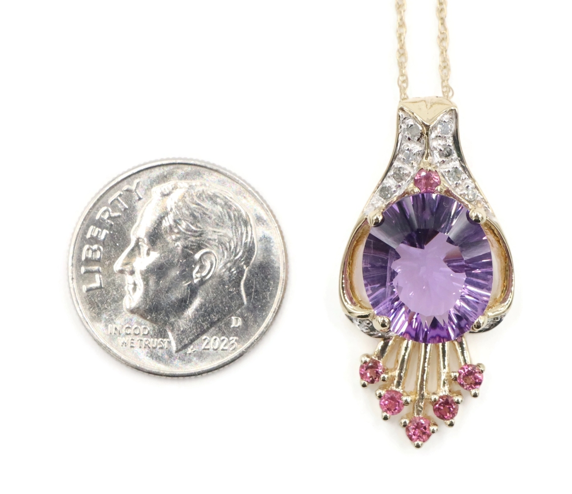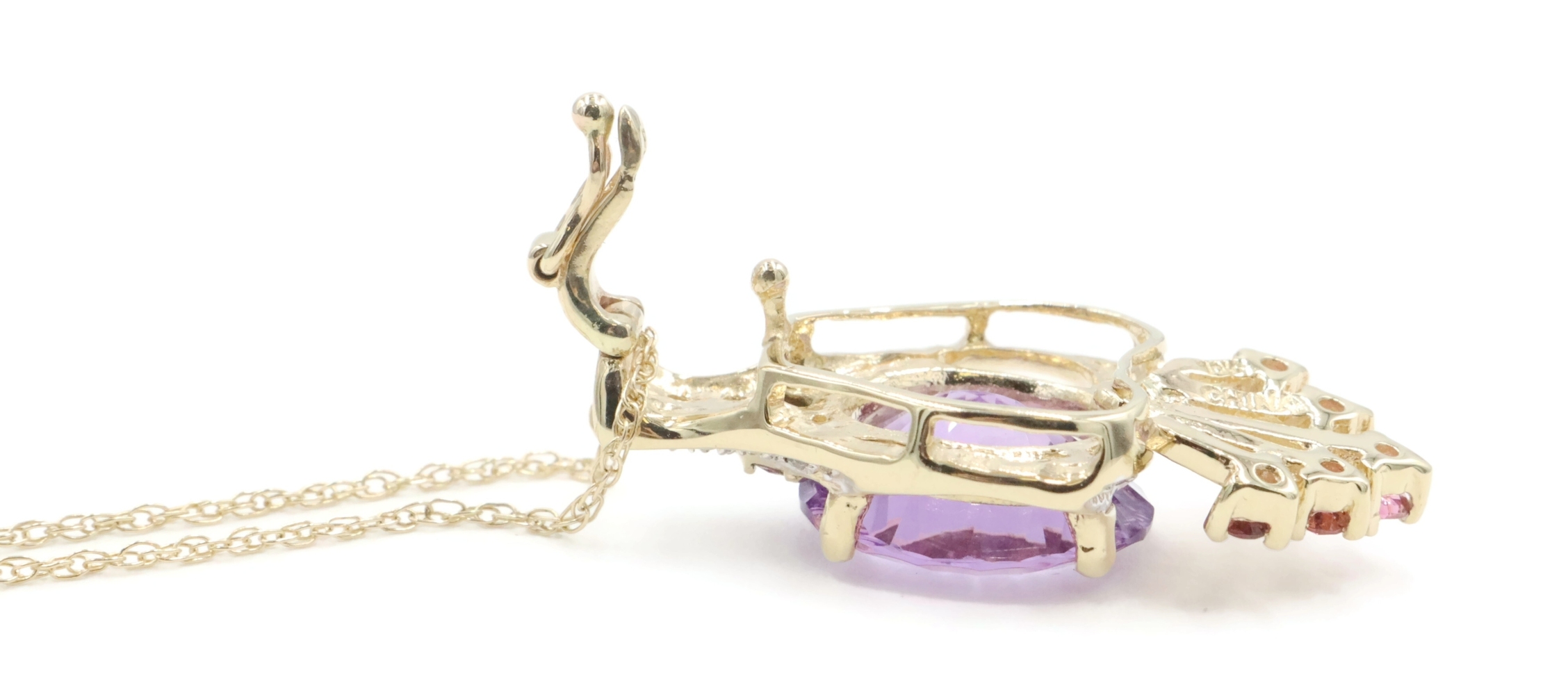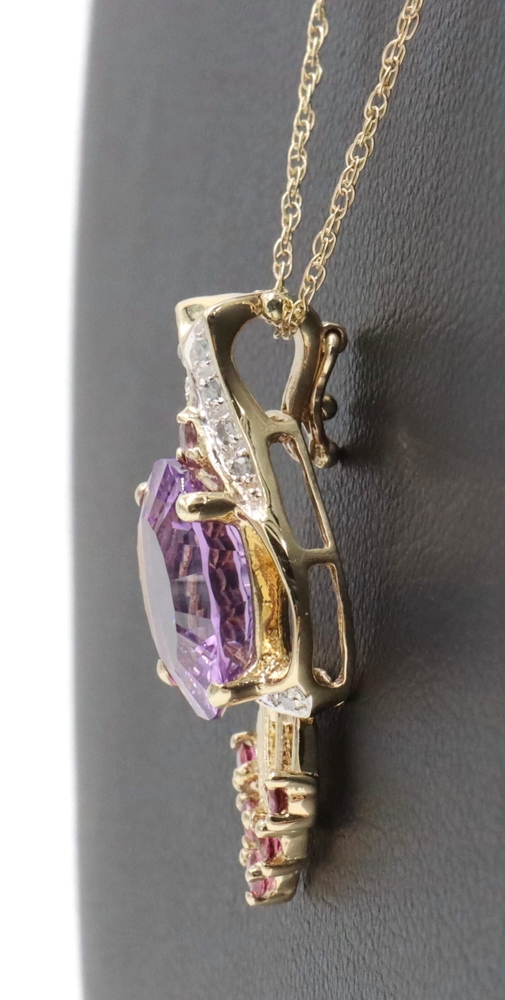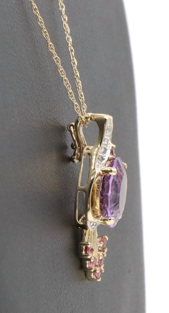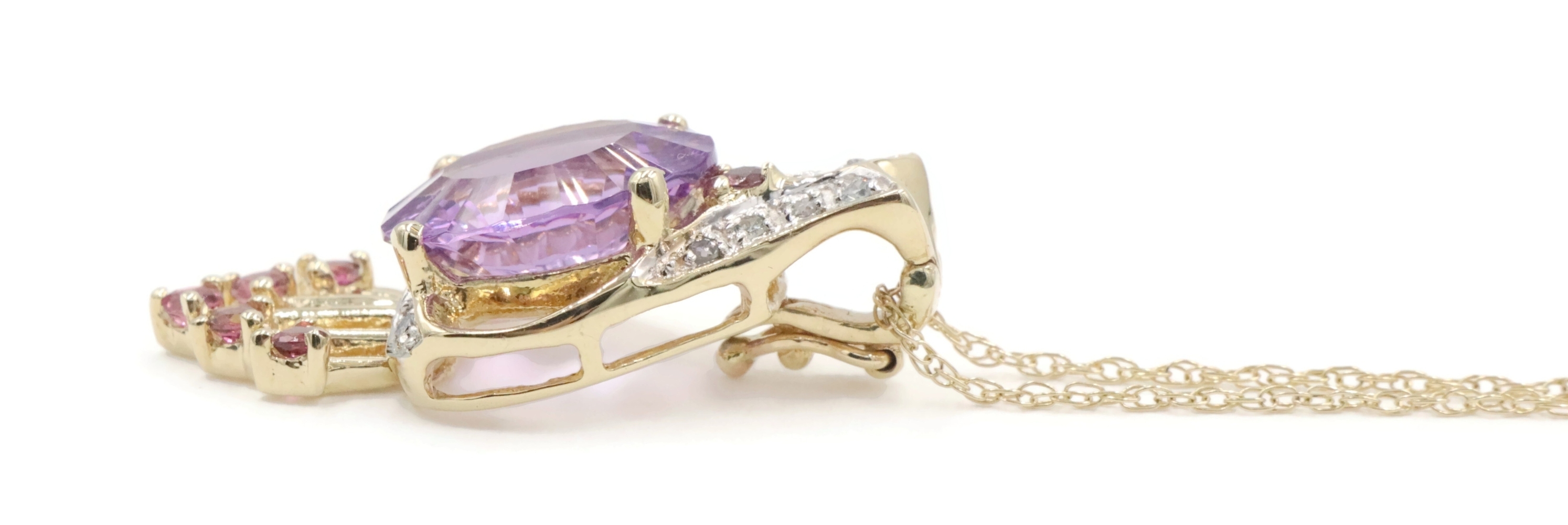 3.15 Ct Fancy Cut Amethyst, Pink CZ & Diamond 10KT Enhancer Pendant on 10K Chain. This pendant is approximately 28mm in length and the rope chain is approximately 18 inches in length.